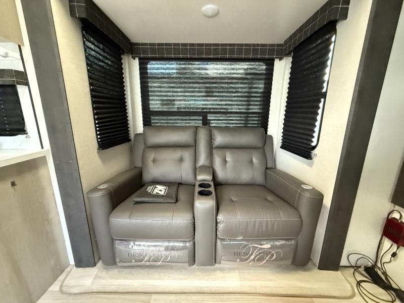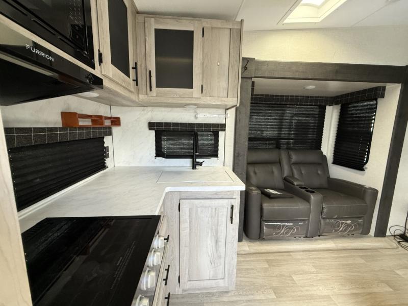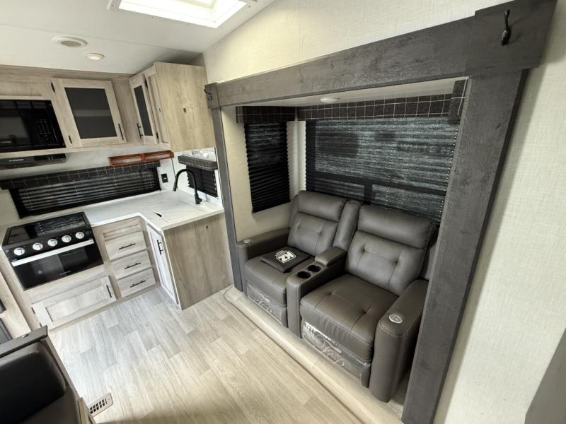 Four to five people can comfortably camp in this fifth wheel! It features a front queen bed with wardrobes on either side to keep your clothes looking their best. There is a radius shower and sink, with a private toilet across the hall. This room can also be shut off from the rest of the RV to make one big master suite! Prepare your best meals in the rear kitchen with the three burner cooktop and enjoy them at the 42" booth dinette. The hide-a-bed sofa slide not only provides a comfortable place to relax during the day, but also a comfortable sleeping space at night, or you can choose the optional theater seating!