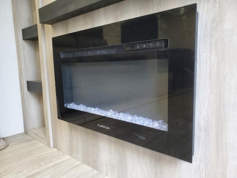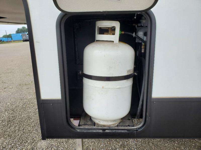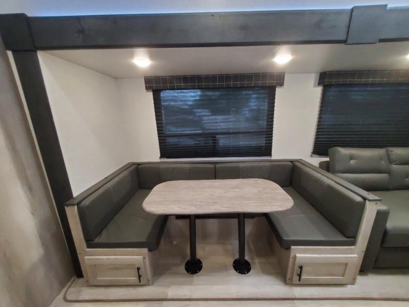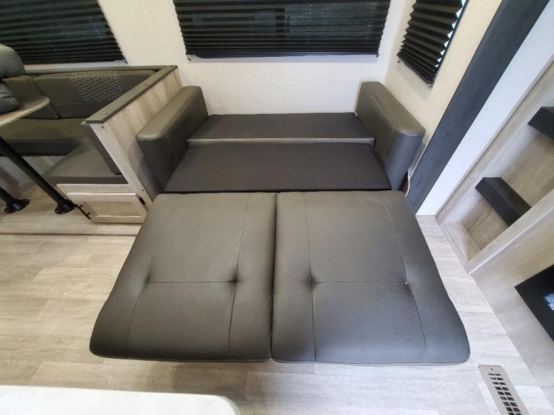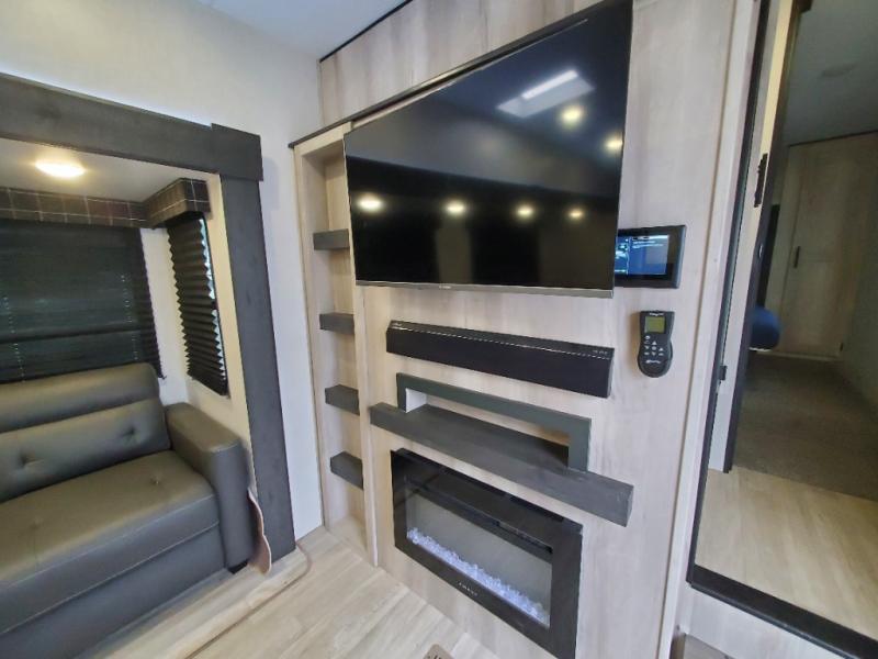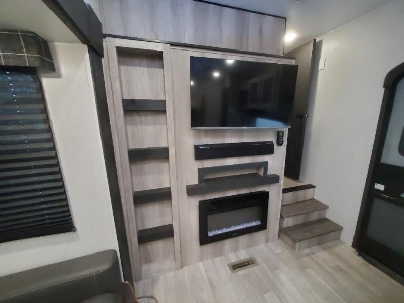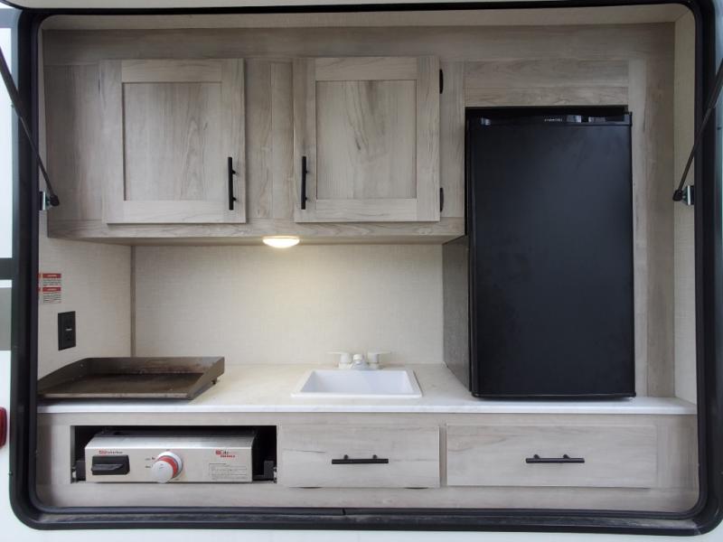 Sleeping space does not lack in this fifth wheel! There is a rear private bunkhouse with a 32" x 69" top hung bunk above a booth dinette and a 40" x 70" bunk above a closet. The front private bedroom with a queen bed will feel just like home, plus it has a half bathroom for convenience. The 80" U-shaped dinette and hide-a-bed sofa with optional theater seating also offer comfortable sleeping spaces once converted. The entertainment center comes with a LED TV and an optional 30" fireplace for a relaxing evening indoors. You can prepare your meals either indoors with the three burner cooktop or at the outside kitchen with a griddle and a refrigerator to enjoy a cold beverage while you cook!