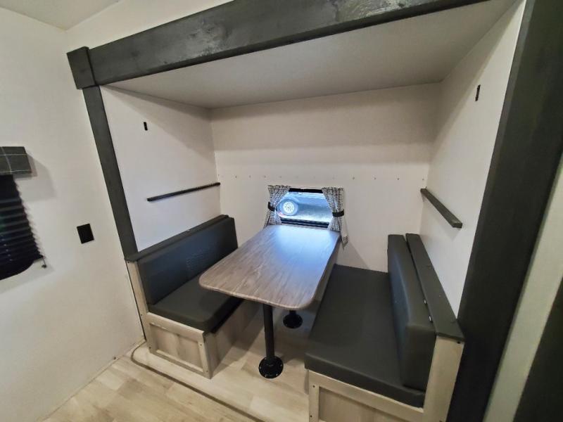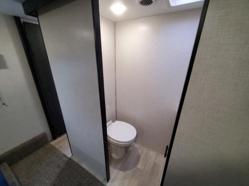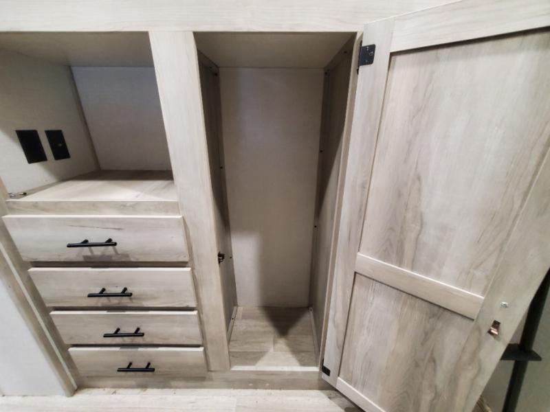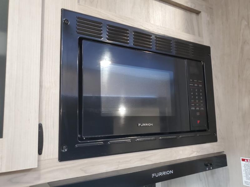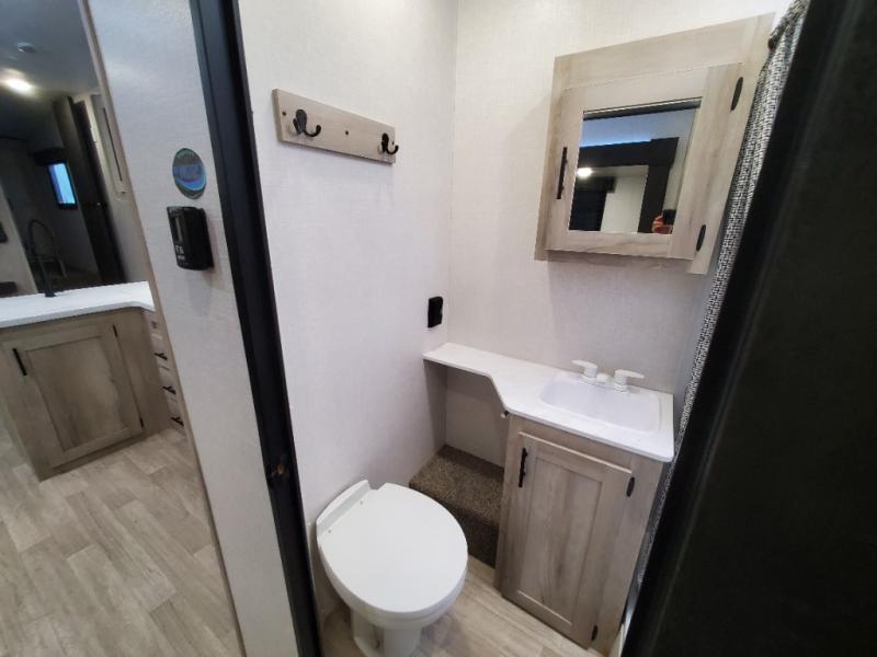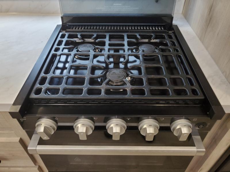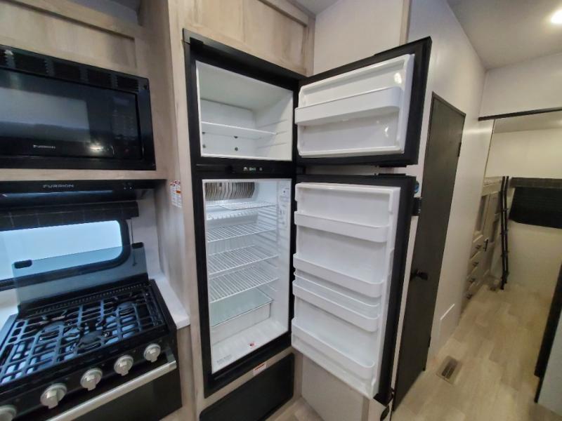 Sleeping space does not lack in this fifth wheel! There is a rear private bunkhouse with a 32" x 69" top hung bunk above a booth dinette and a 40" x 70" bunk above a closet. The front private bedroom with a queen bed will feel just like home, plus it has a half bathroom for convenience. The 80" U-shaped dinette and hide-a-bed sofa with optional theater seating also offer comfortable sleeping spaces once converted. The entertainment center comes with a LED TV and an optional 30" fireplace for a relaxing evening indoors. You can prepare your meals either indoors with the three burner cooktop or at the outside kitchen with a griddle and a refrigerator to enjoy a cold beverage while you cook!