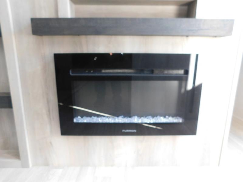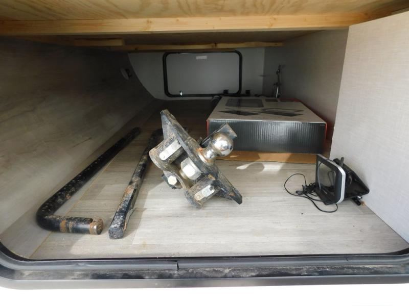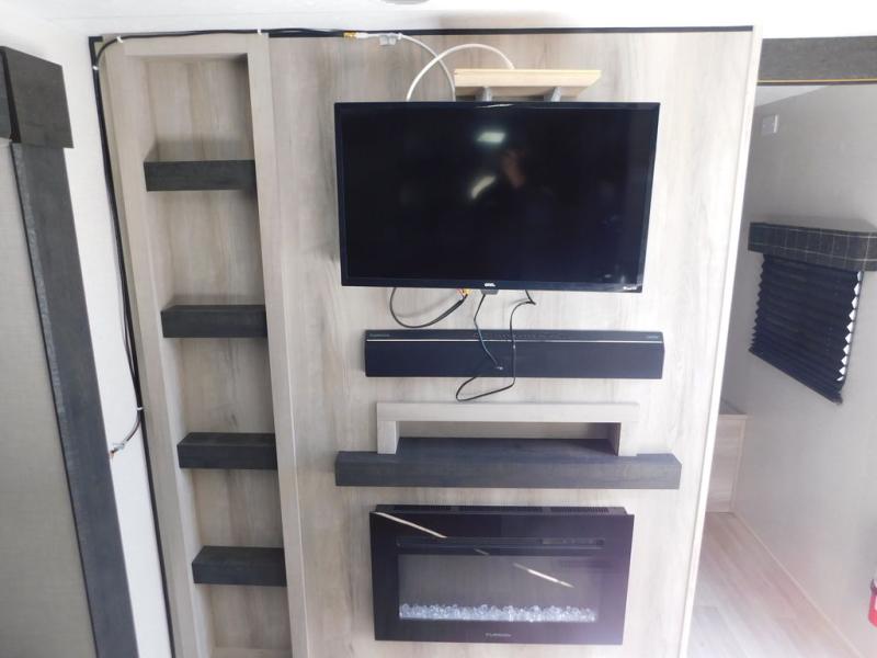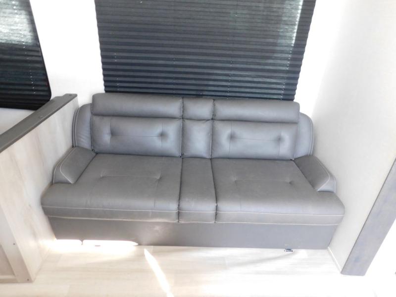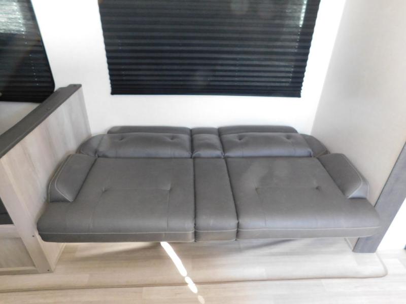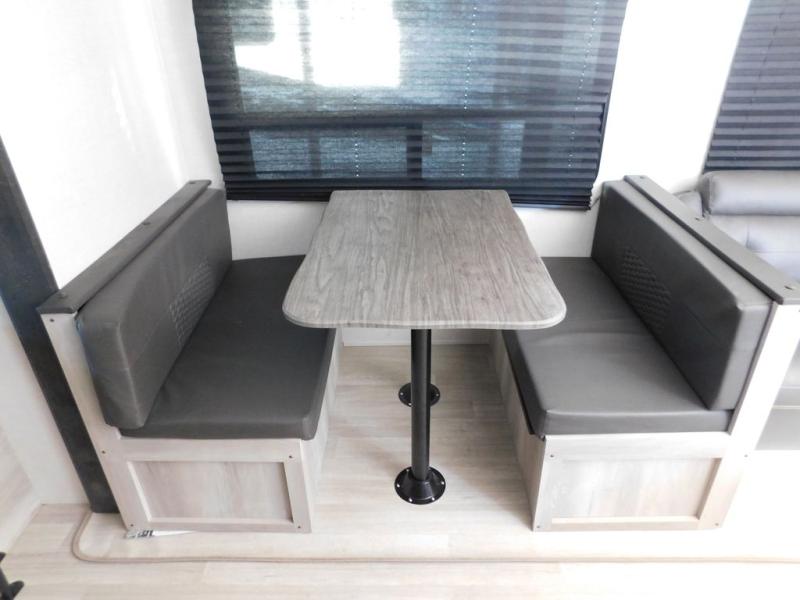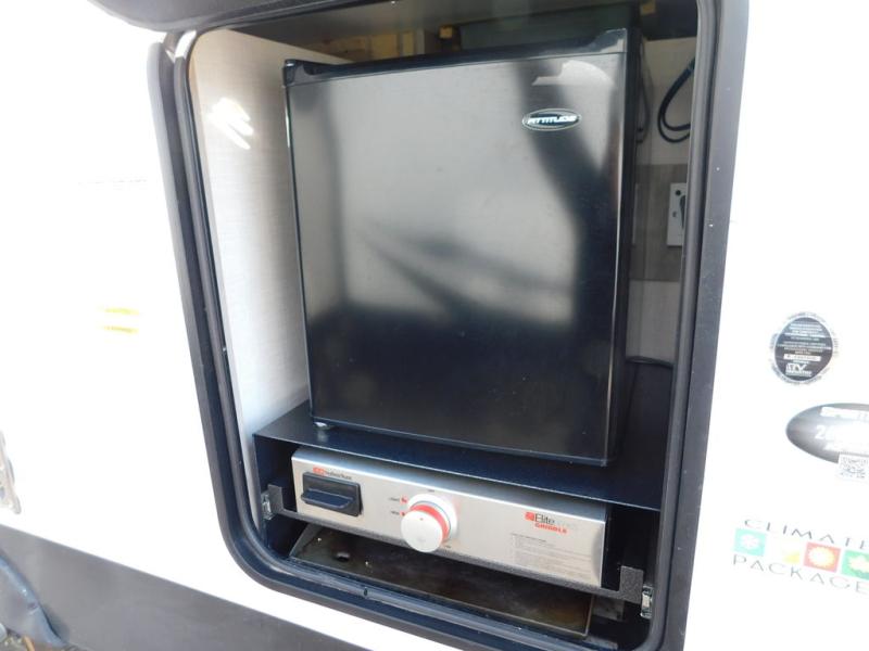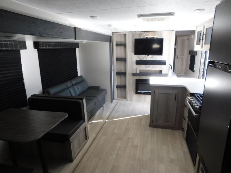 This is a great travel trailer to sleep all your friends or family! Once you arrive at the campground, the chef of your group can prepare lunch on the outside kitchen that includes a griddle and a refrigerator. The 18' power awning here will provide shade from the hot sun, and you can grab the lawn chairs from the pass-through storage to relax. You will find plenty of seating space inside on the 70" sofa and booth dinette within the large slide out, plus there is an entertainment center here. The interior kitchen includes everything you need to prepare meals each day, including a three burner cooktop, a microwave oven, plus a wardrobe/pantry for jackets or dry goods!