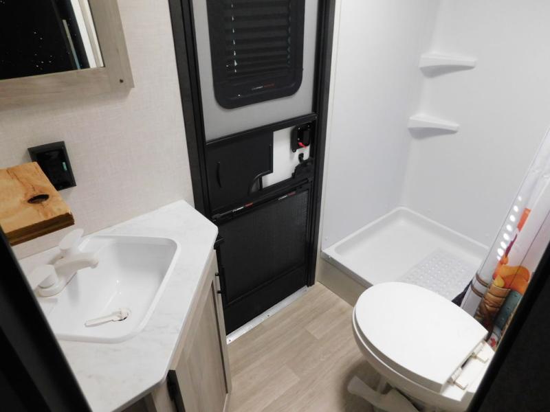 Each Sportsmen SE travel trailer and toy hauler by KZ is constructed with KZ exclusive tough shield exterior metal, a one-piece seamless walk-on Tufflex roofing material, and diamond plate rock guard to protect your unit from road debris. You will appreciate the extra large baggage doors for stowing away your gear when not in use, and tinted windows to help keep the harmful sun rays out plus keeping it cooler inside. Some of the exterior conveniences found in the mandatory Advantage Package are the solid folding steps with a large folding grab handle for easy entry and exit, a full glass friction hinged entry door, plus an exterior shower for your pets or to rinse off before you head inside. You'll also appreciate the nitrogen-filled tires, solar and backup camera prep, plus a Leash Latch with a bonus beverage opener. You'll feel right at home inside with linoleum flooring throughout, a 13,500 BTU air conditioner, large overhead cabinets, a shower surround, and much more!