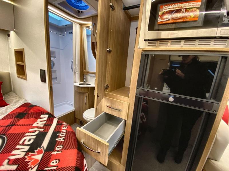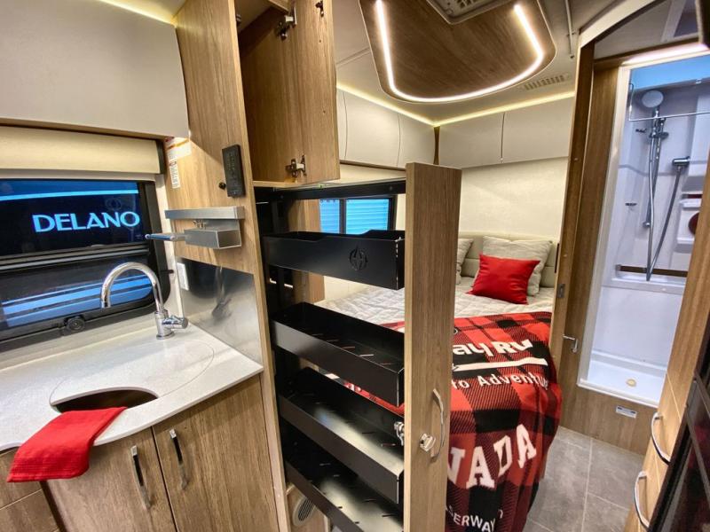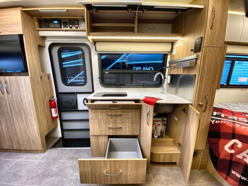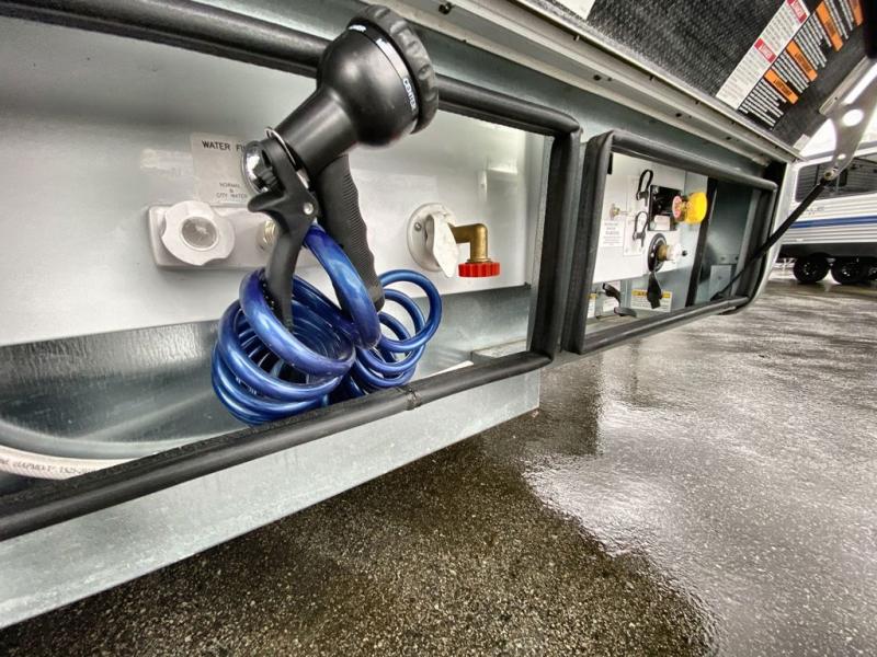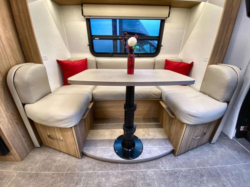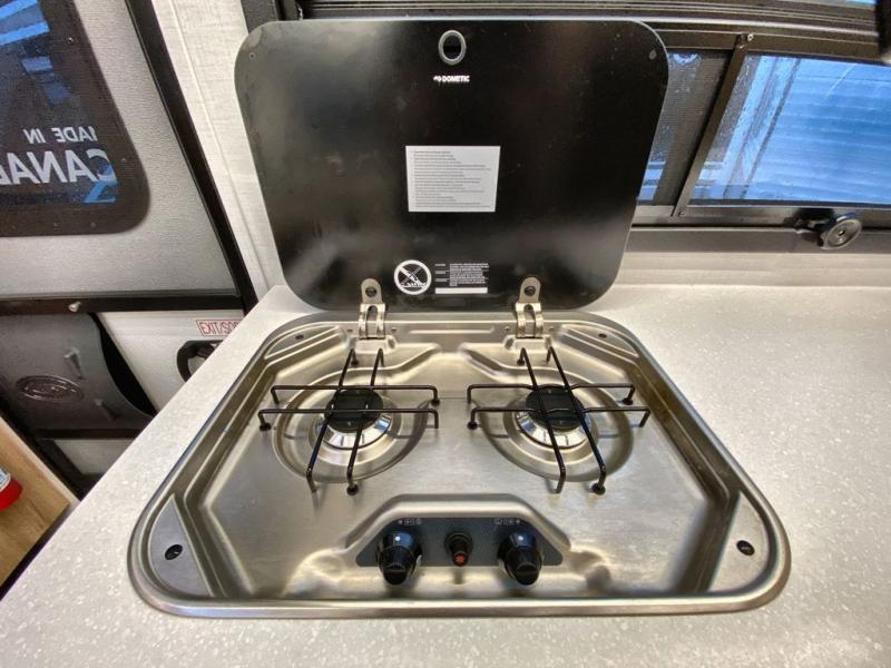 You can sleep four comfortably in this coach thanks to the 52" x 76" rear corner bed, and the booth dinette, or you might want to choose the optional U-lounge dinette. The galley includes a stainless steel sink, a two burner cooktop, plus a pull-out panty and a 12V compressor refrigerator for food storage. The rear corner bath will allow you to stay clean throughout your many travels, and there is plenty of storage space for your essentials. You will also love the powered box awning with a wind sensor and LED lights for those late-night evenings outdoors with friends.