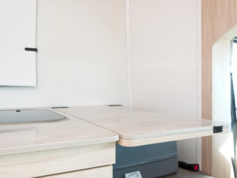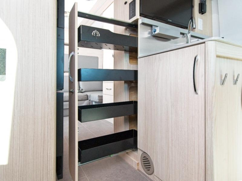 - Gourmet Galley: Includes a convection microwave, flush-mount LP cooktop with glass cover, flip-down counter extension, garbage can, and pull-out pantry for easy meal prep.
