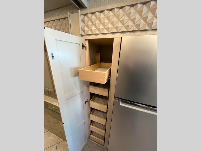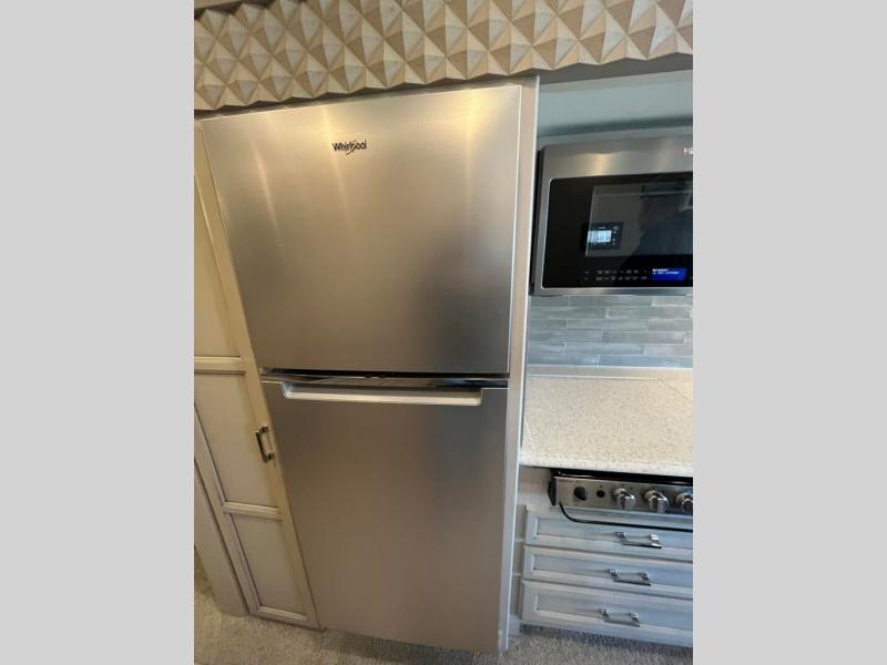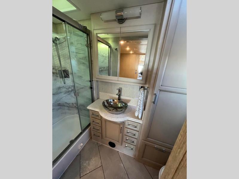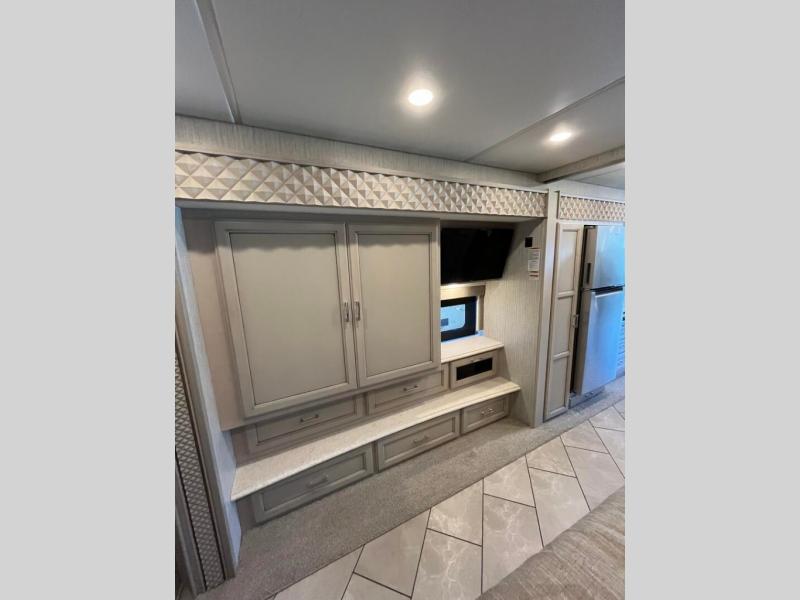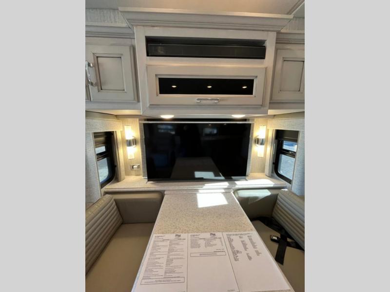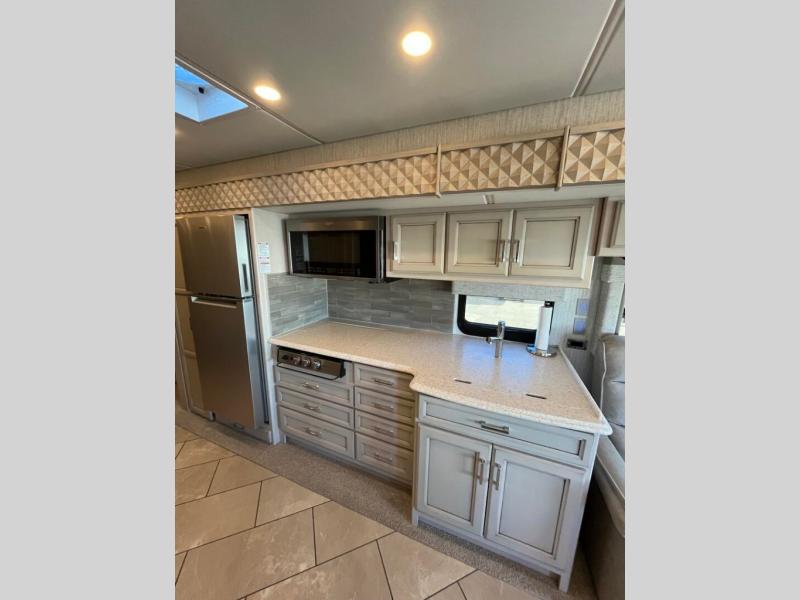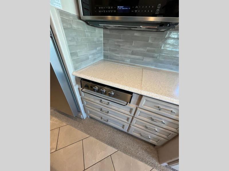 This coach is the perfect companion to take across states since it will feel just like home. There is a full-wall slide that will open up your living space, plus two additional slides so you won't feel confined. You will love the master bedroom and the full rear bath that includes a linen closet for clean towels, and there is a mid-coach half bath with an area for an optional Splendide stacked washer and dryer. The chef of your group will have a 30" convection microwave and a three burner cooktop to prepare meals each day, and there is a booth dinette (sleeper) where you can all dine together. You might want to relax on the 74" visionary V2 tri-fold sofa after dinner and watch a movie on the TV on power lift!