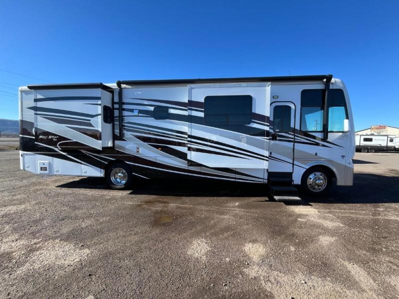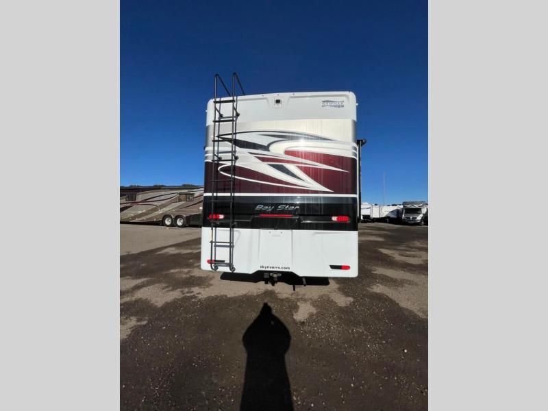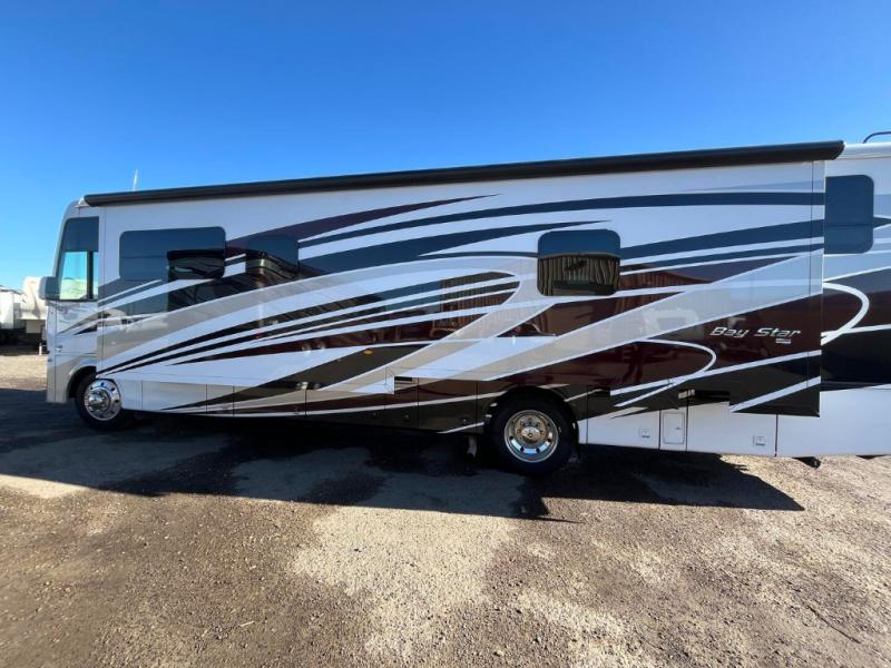 Each Bay Star Class A gas motorhome by Newmar delivers a smooth ride thanks to the standard electronic stability control, along with the 7.3-liter V8 engine with 350 HP and 468 lb./ft. of torque. The exterior is sure to turn heads with its Full-Paint Masterpiece Finish, and you'll have three interior décor choices and three wood choices to truly make the coach your own. Each model includes newly styled Williamsburg furniture, luxurious vinyl tile flooring, polished solid surface countertops in the kitchen, plus many more comforts. Head outside to find lit basement storage, a 5.5kW Onan generator with remote switch, and smart level hydraulic leveling jacks with a Bluetooth compatible touch pad for set up easy as 1-2-3! You can further customize your coach with the many options that are offered, such as the optional exterior entertainment center!