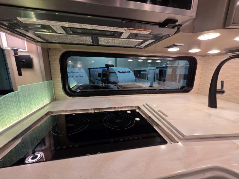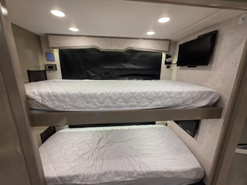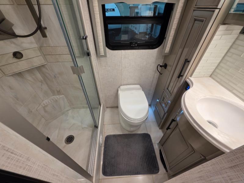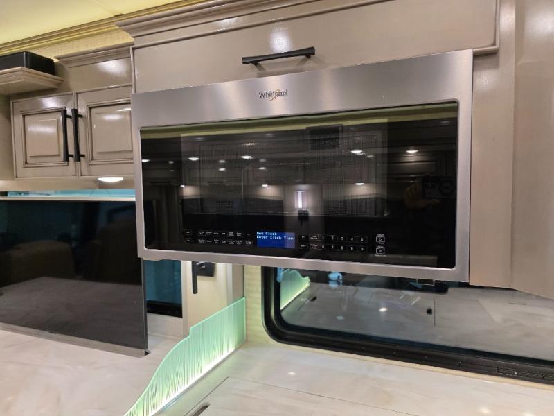Now you can bring your neighbor friends along on trips since this motorhome can sleep up to six people each night. The 30" x 72" bunk is right across from the half bath for convenience, and there is a hide-a-bed sofa, along with a jackknife sofa for more sleeping space. You and your spouse will have the master bedroom all to yourselves with a slide out king bed, a dresser, and two wardrobes. And check out the full rear bath with tons of storage space and a shower with a seat! Breakfast can be made on the three burner cooktop or in the 30" stainless steel convection microwave, and the milk can go back in the 19.7 Whirlpool refrigerator. And since this model includes a full-wall slide, you won't have to worry about being cramped on space!