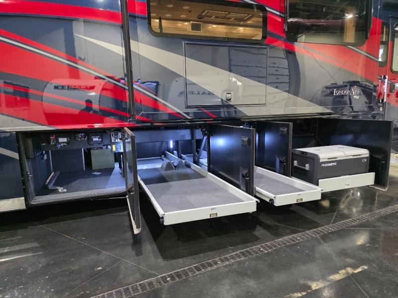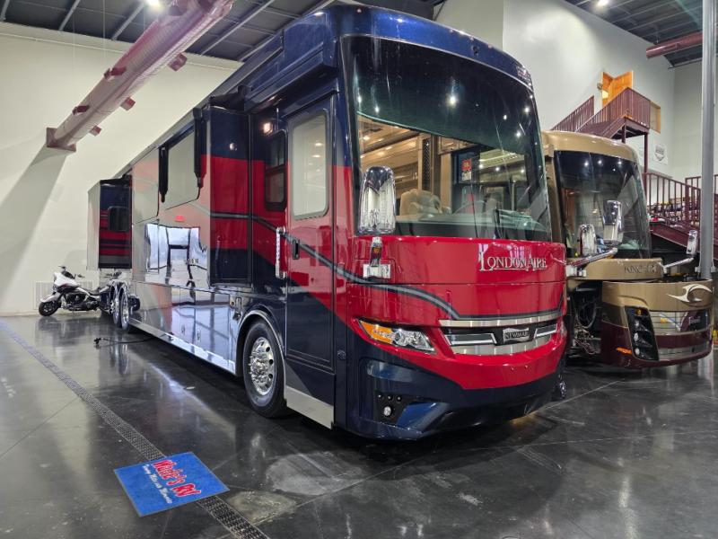 The London Aire Class A diesel motorhome by Newmar starts with a Spartan K3 chassis with tag axle and is covered by a fiberglass roof with an integrated gutter rail. There is also batten insulation and a polyethylene moisture barrier in the floor to ensure years of use. You will stay comfortable with the three 15M Penguin heat pump central air conditioners, and the electric radiant heat beneath the main floor tile will keep your feet warm during those cooler months. Each model includes super polished solid surface countertops, hardwood cabinets with raised panel doors, a plush pillowtop mattress, and many more luxuries. Some of the conveniences you are sure to appreciate are the central vacuum with a tool kit, the Aqua Miser shower system, and the hydraulic leveling jacks for hassle-free set up.