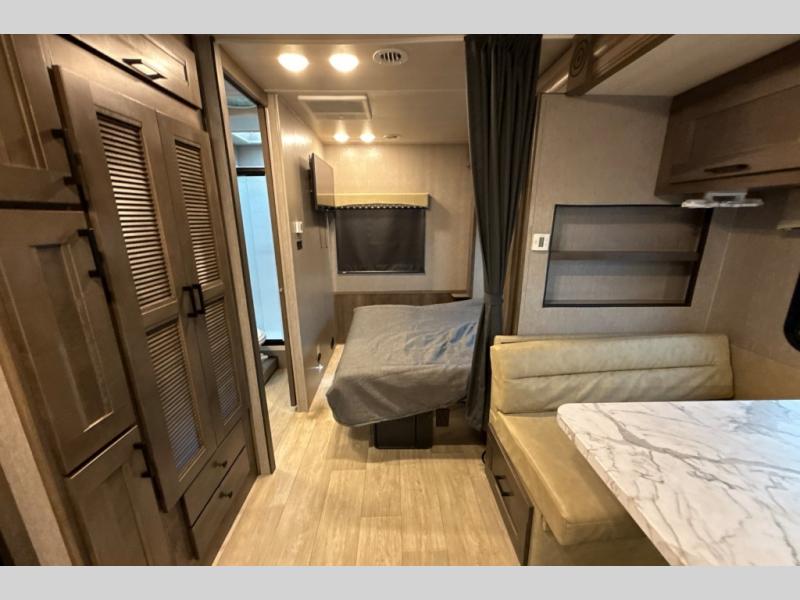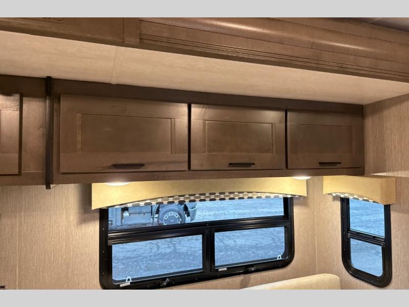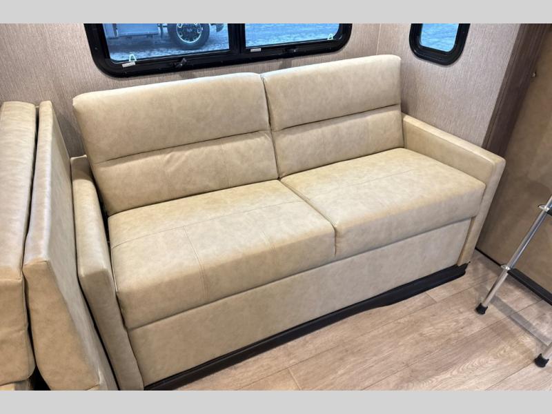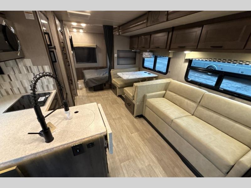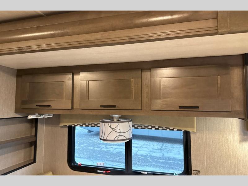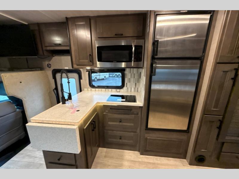 This Super C motorhome provides efficient living space and plenty of room for fun! With a full-wall slide running the length of the coach, each area has lots of space. The bedroom area in the rear features a folding queen bed with deluxe innerspring mattress. The adjacent bath is accessed via a sliding door to further maximize your space. The bath is well equipped with a 24” x 32” shower, toilet, sink, and medicine cabinet. The rear of the coach also offers plenty of storage with a linen closet as well as an area prepped for an optional washer/dryer combo. Up front, you’ll find a comfortable sofa and a nice kitchen with a 12V refrigerator, three-burner stove top, and over the range microwave with exhaust fan to keep things fresh and clean. The booth dinette with storage is yet another space to relax.