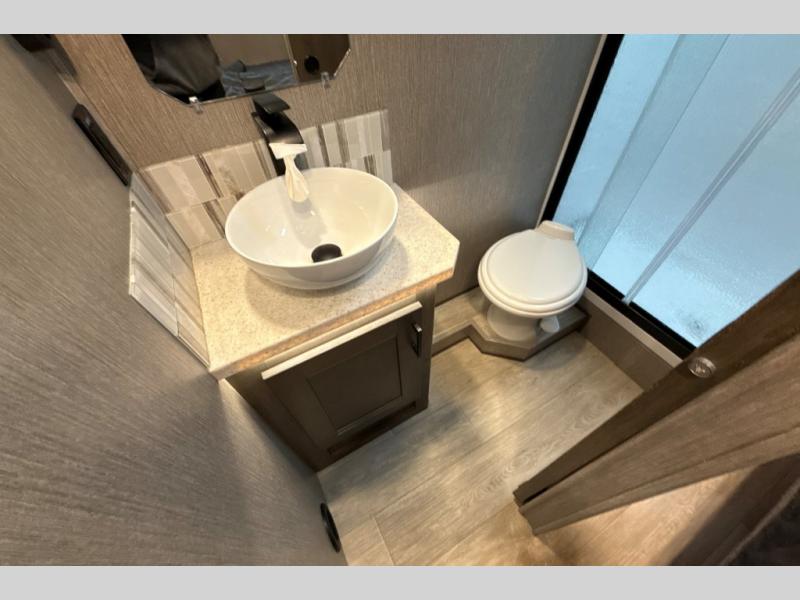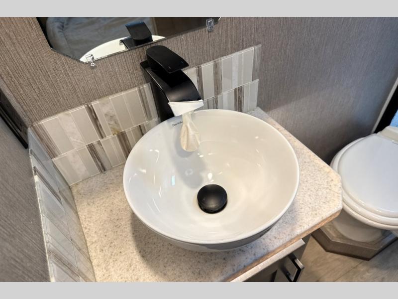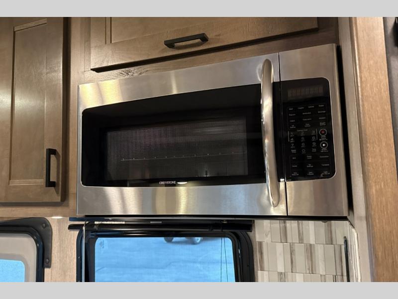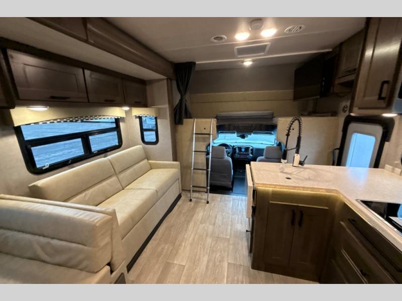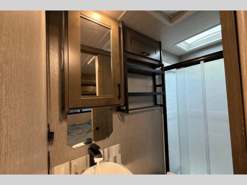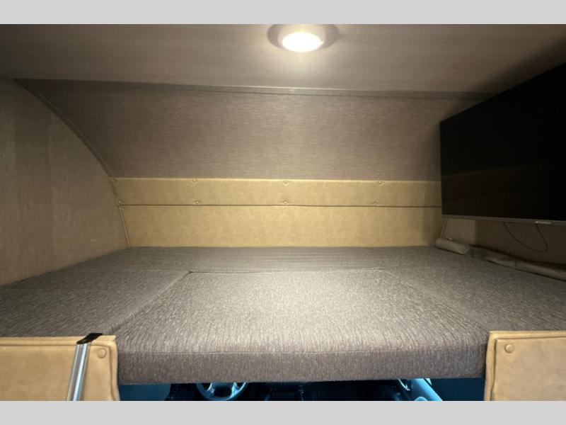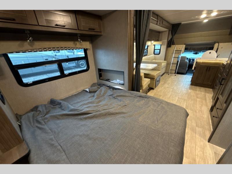 This Super C motorhome provides efficient living space and plenty of room for fun! With a full-wall slide running the length of the coach, each area has lots of space. The bedroom area in the rear features a folding queen bed with deluxe innerspring mattress. The adjacent bath is accessed via a sliding door to further maximize your space. The bath is well equipped with a 24” x 32” shower, toilet, sink, and medicine cabinet. The rear of the coach also offers plenty of storage with a linen closet as well as an area prepped for an optional washer/dryer combo. Up front, you’ll find a comfortable sofa and a nice kitchen with a 12V refrigerator, three-burner stove top, and over the range microwave with exhaust fan to keep things fresh and clean. The booth dinette with storage is yet another space to relax.