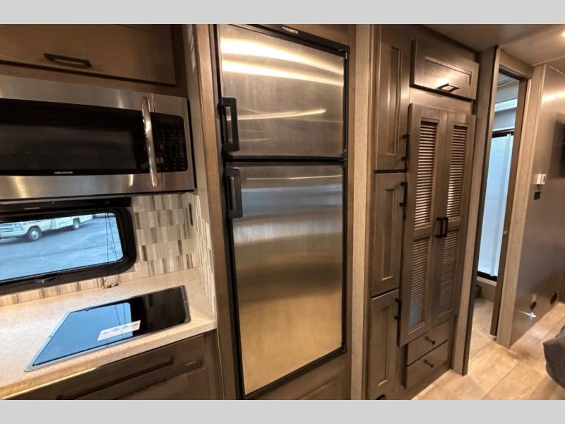 The NeXus RV Verrado Super C diesel motorhome provides exceptional space and comfort! The Chevrolet 5500 LT Silverado Series chassis is the basis for this coach with a 350 HP Duramax diesel engine and 700 ft. lb. of torque. Sturdy construction features high strength low alloy lightweight steel cage throughout, a laminated steel framed floor, and seamless gelcoat fiberglass sidewalls. Bring along everything you need with the 15,000 lb. hitch with connector and 7-way plug. You can control everything from the power driver seat with a 9" touch screen stereo with phone mirroring. Watch the scenery go by through the automotive style radius tinted frameless windows. You’re in for a great trip in this NeXus RV Verrado!
