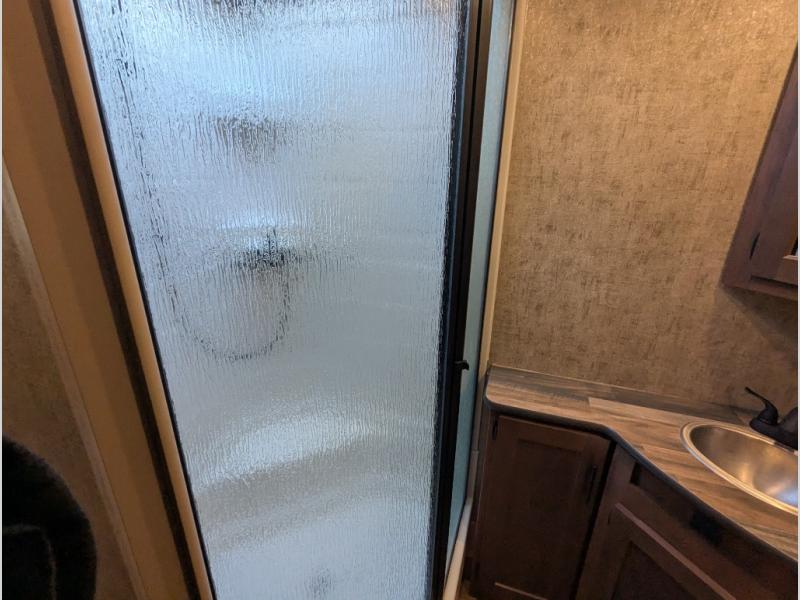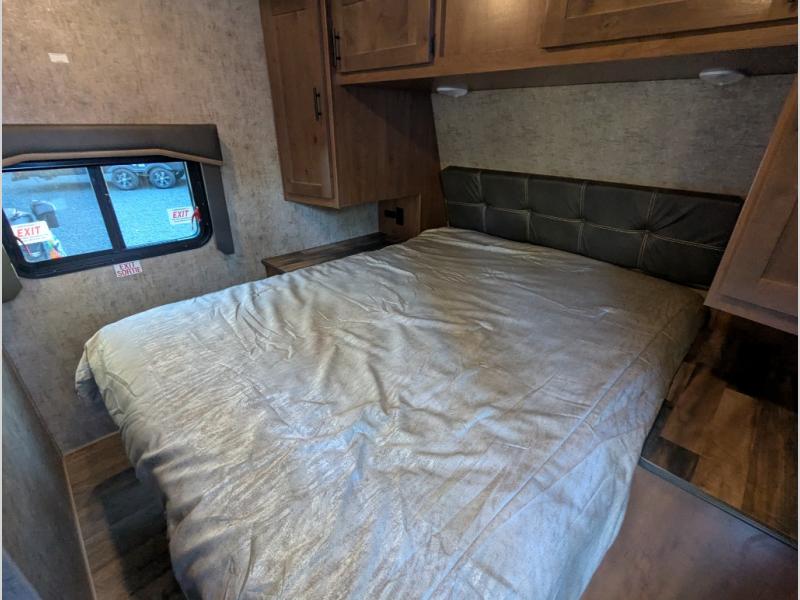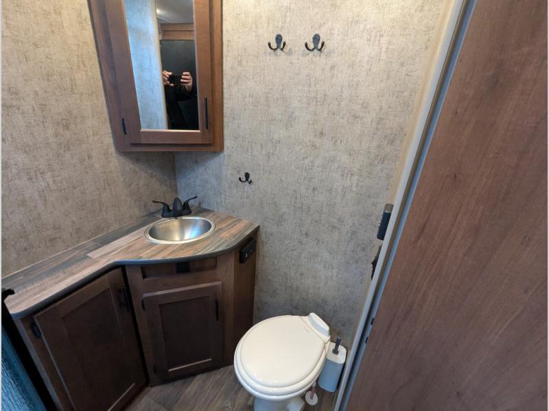 Head out to your favorite campsite in this roomy couple's trailer. There are dual entry doors, allowing you to enter in through the rear living area, or the front private bedroom. You can relax on the dual recliners after you've unpacked and maybe watch a show on the swing-out 32" TV. Once lunch is prepared on the three burner cooktop, you can dine at the mountain dinette with a skylight, or head outdoors to sit under the 21' awning. The queen bed is sure to bring comfort in the front bedroom, and if you have an overnight guest, they can sleep on the dinette!