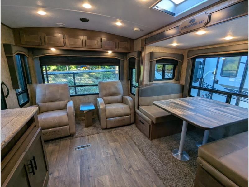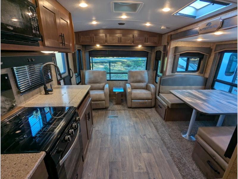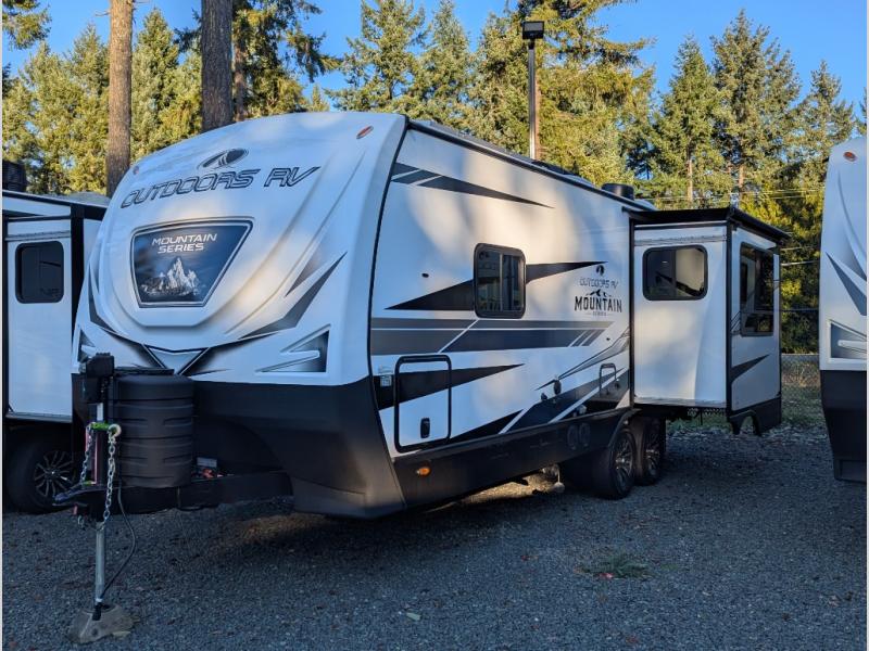 With any Timber Ridge Mountain Series travel trailer by Outdoors RV you will enjoy climate designed four seasons camping thanks to the thermal pane windows and the fully enclosed, heated, and insulated underbelly. The custom built chassis and rugged integrated A-frame are built for strength and durability, along with the rugged 2" bonded aluminum frame walls. Each model includes LG solid surface countertops, granite designed backsplash, vaulted radius ceilings, and a mountain comfort premium mattress for all-around comfort. You will also love the XL panoramic slide out windows and the dual pane living room skylight with a shade to let natural light in!