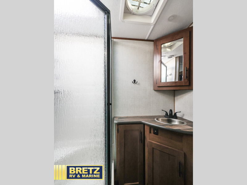 Head out to your favorite campsite in this roomy couple's trailer. There are dual entry doors, allowing you to enter in through the rear living area, or the front private bedroom. You can relax on the dual recliners after you've unpacked and maybe watch a show on the swing-out 32" TV. Once lunch is prepared on the three burner cooktop, you can dine at the mountain dinette with a skylight, or head outdoors to sit under the 21' awning. The queen bed is sure to bring comfort in the front bedroom, and if you have an overnight guest, they can sleep on the dinette!