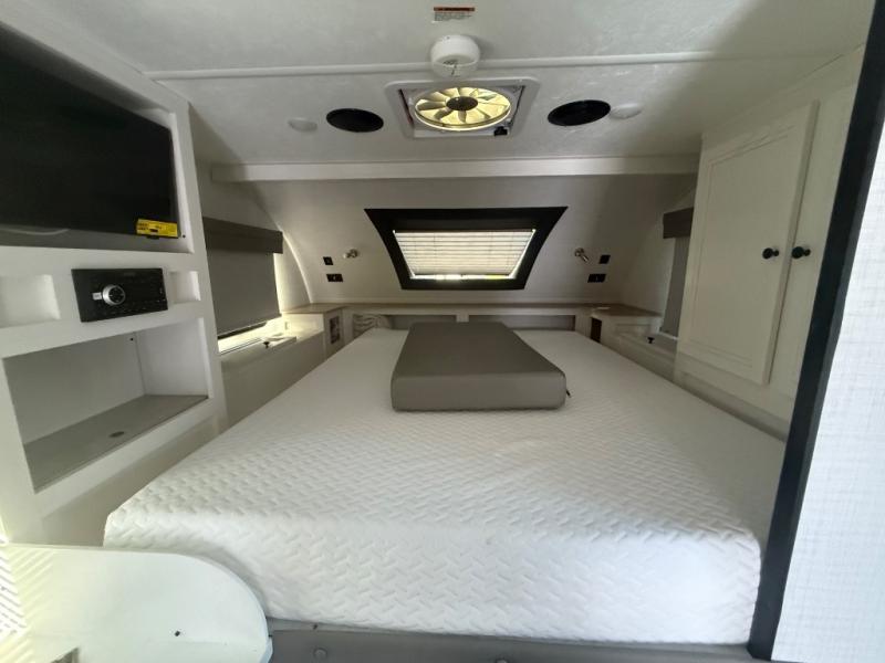 Pack up your fishing gear and load this hard side truck camper onto your truck! Start your mornings feeling recharged after sleeping on the front queen bed with a wrap around nightstand, chests on either side, and a wardrobe to keep your shirts wrinkle-free. You'll also enjoy the entertainment center with a 22" HDTV on this model to watch your favorite shows in bed. The kitchen has everything you need to prepare your best meals including two pantries, one of which is a wardrobe/pantry for double use. The sofa with a table offers a comfortable place to enjoy your meals, as well as transform into an extra sleeping space.