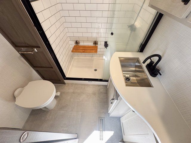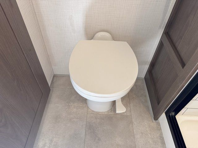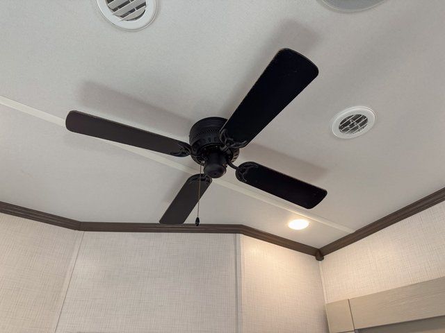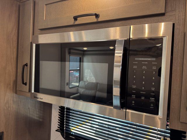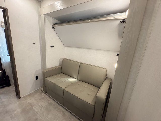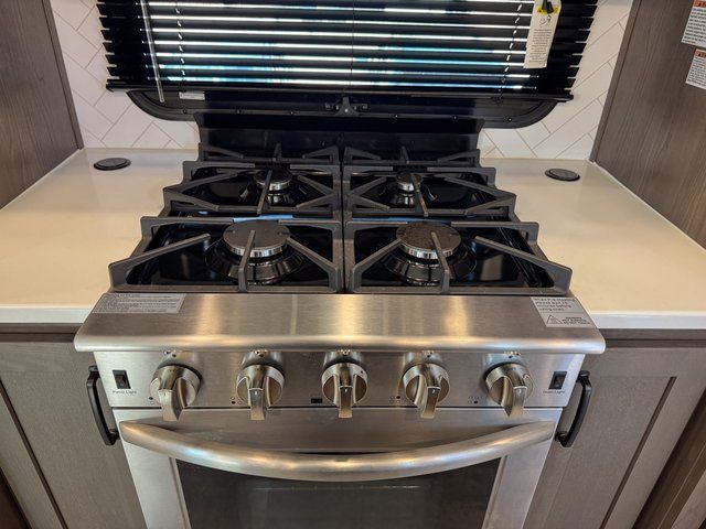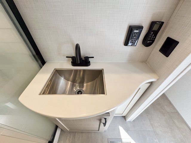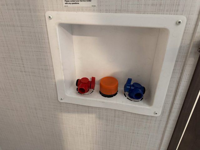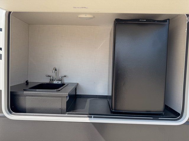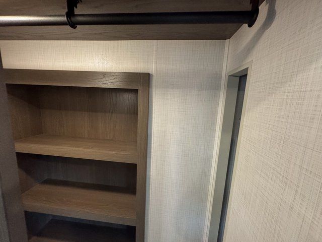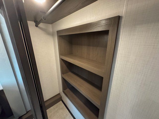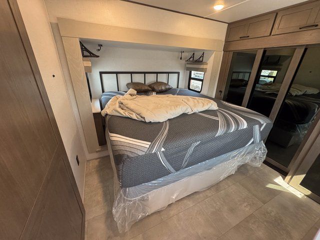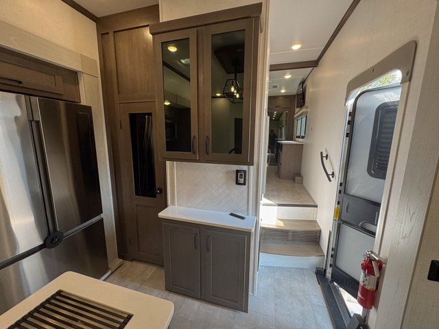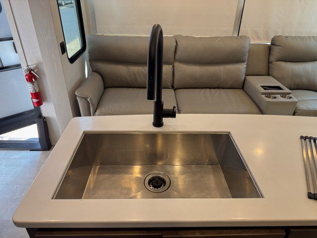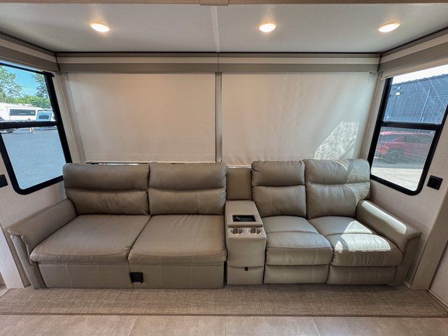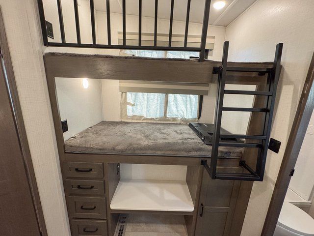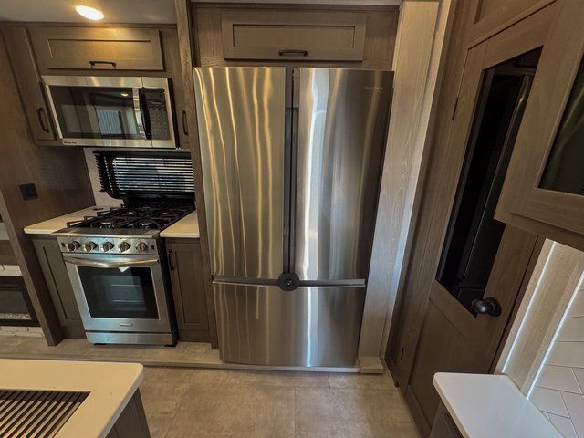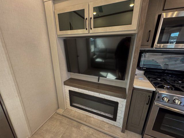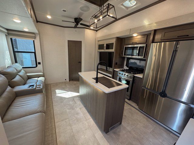 This fifth wheel is decked out with so much luxury you won't even feel like you're camping! The private bunkhouse has 38" x 71" bunks, a 30" x 68" flip bunk above a 68" tri-fold sofa slide, and its very own full rear bathroom with its own rear exit door to the unit. The chef can prepare their best home cooked meals with the kitchen island and store the dishes in the hutch. Enjoy a cozy evening indoors by the fireplace at the entertainment center while relaxing on either the theater seating or sofa with a table. Get a good night's rest each night on the 72" x 80" king bed slide in the front private bedroom and store your clothes in the front wardrobe. There is also washer and dryer prep with a removable shelf if you want the option to make wash day easier than ever!