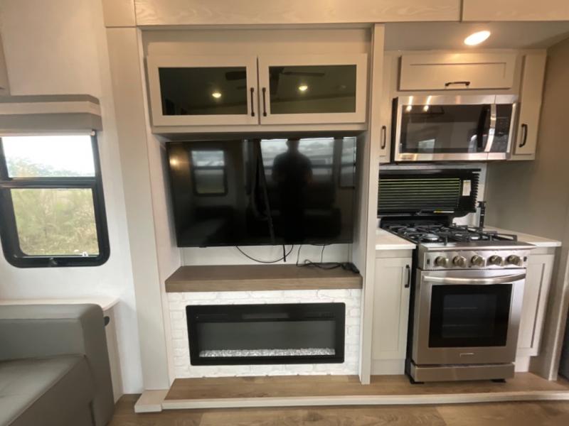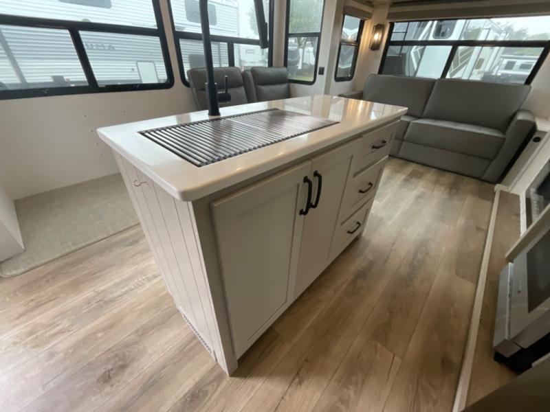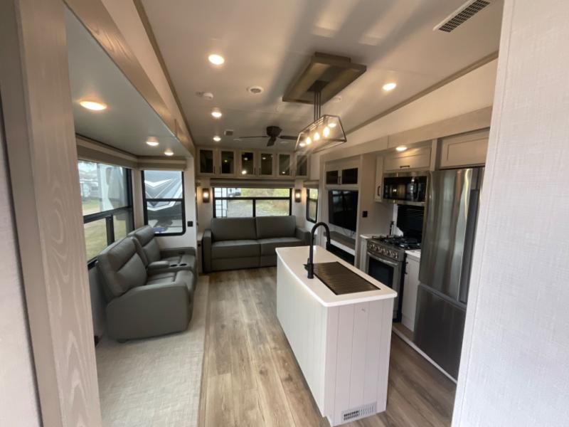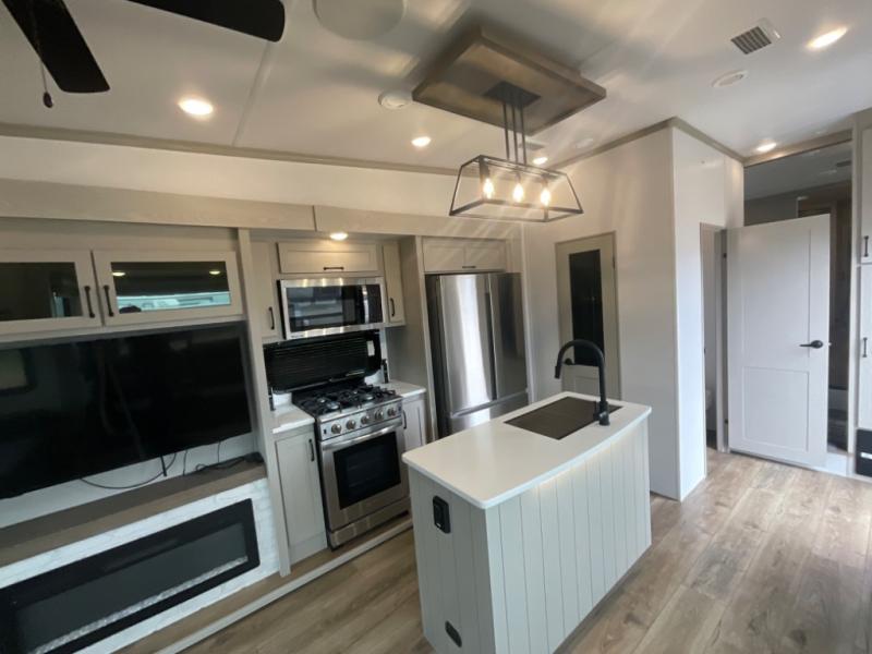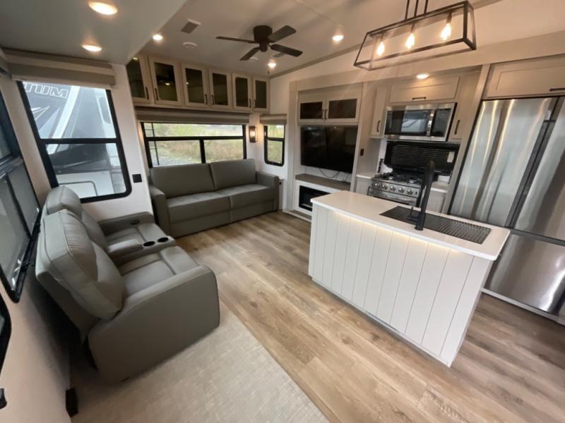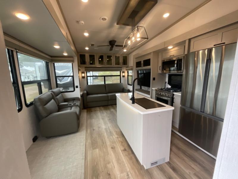 Everyone will stay clean with a bath and a half in this fifth wheel! The kitchen has a pantry big enough for everyone's favorite snacks, a four burner Insignia cooktop, and a kitchen island to prepare your best meals. You can have game night indoors at the table and chairs or set up a table and chairs underneath the two power awnings. The rear living area offers a comfortable place to watch the big game too with an 88" split tri-fold sofa and 65" power theater seating directly across from the entertainment center with a 50" Smart TV. Two can get ready at once in the front bathroom featuring a vanity with dual sinks, and since there is washer and dryer prep, you have the option to make wash day easier!