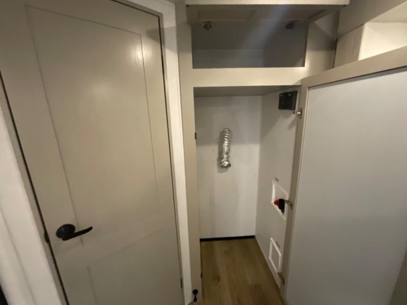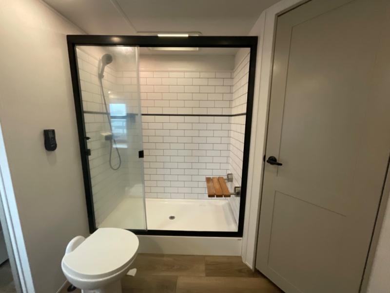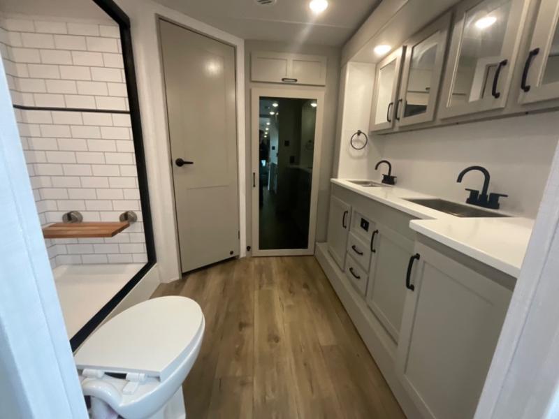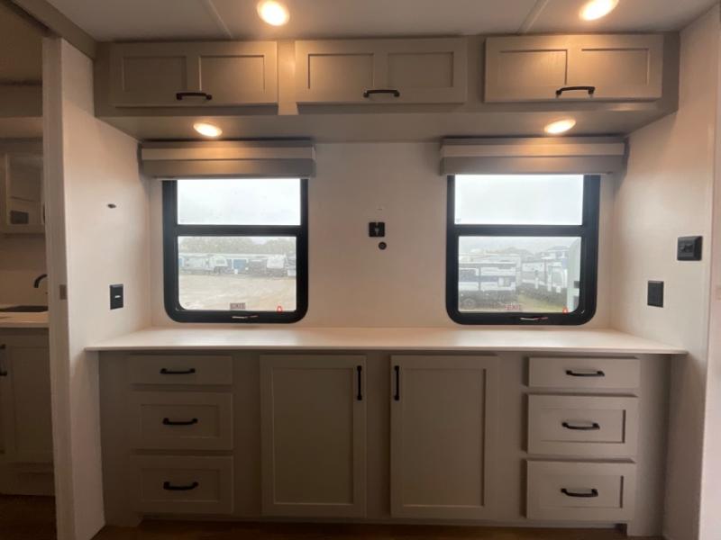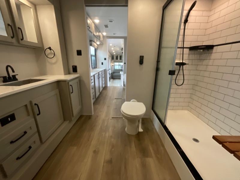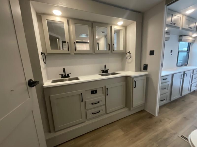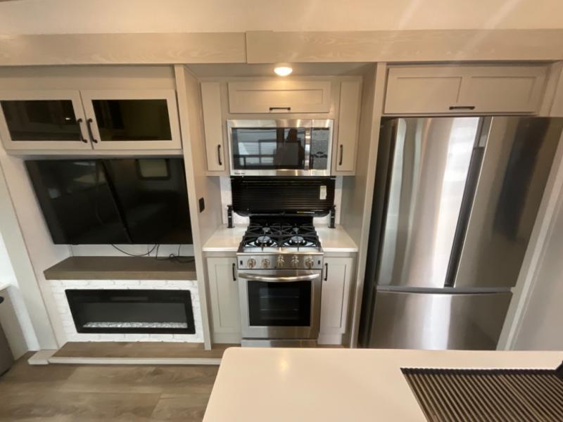 Everyone will stay clean with a bath and a half in this fifth wheel! The kitchen has a pantry big enough for everyone's favorite snacks, a four burner Insignia cooktop, and a kitchen island to prepare your best meals. You can have game night indoors at the table and chairs or set up a table and chairs underneath the two power awnings. The rear living area offers a comfortable place to watch the big game too with an 88" split tri-fold sofa and 65" power theater seating directly across from the entertainment center with a 50" Smart TV. Two can get ready at once in the front bathroom featuring a vanity with dual sinks, and since there is washer and dryer prep, you have the option to make wash day easier!