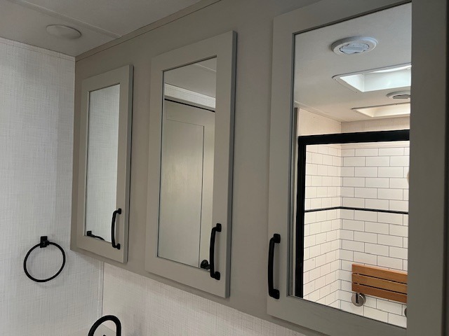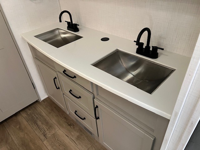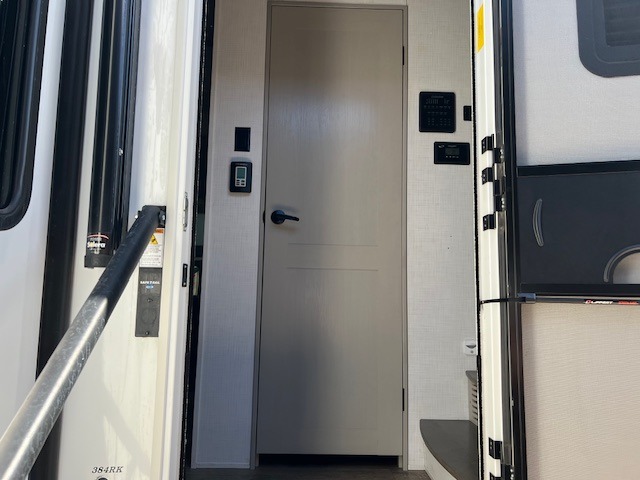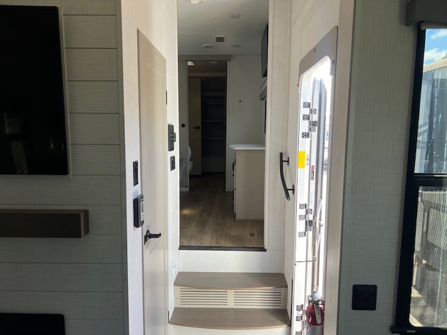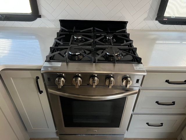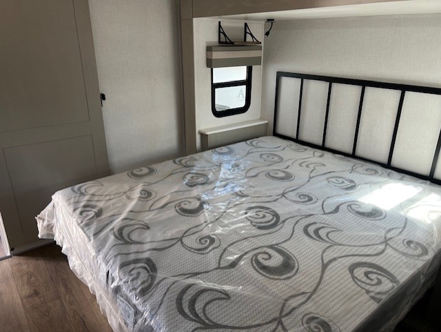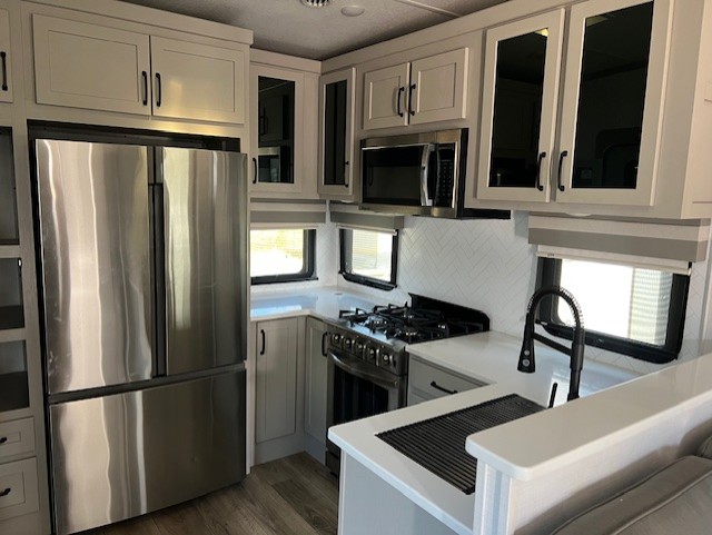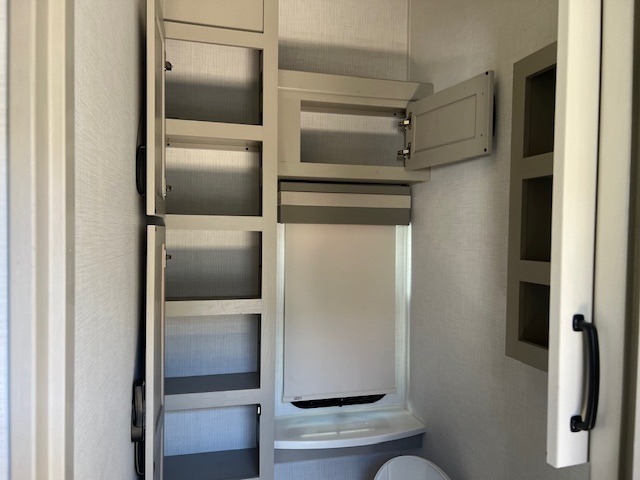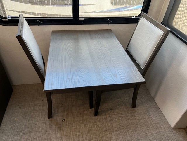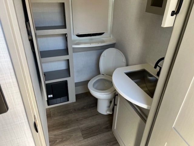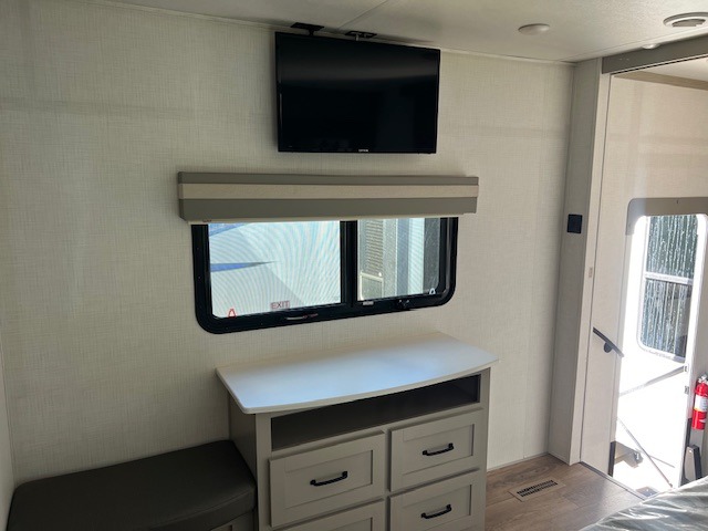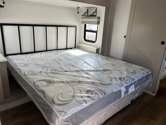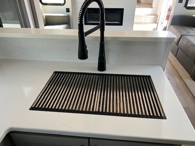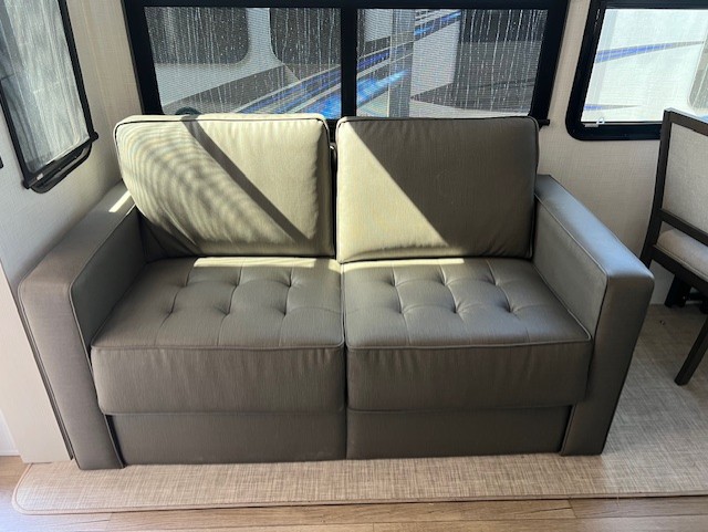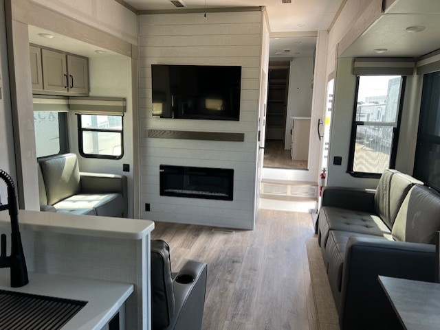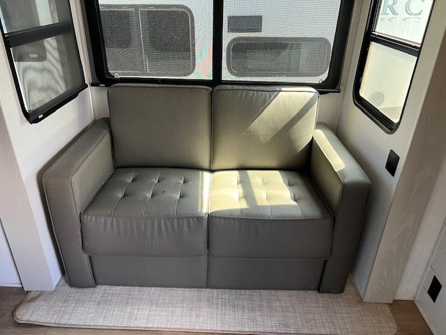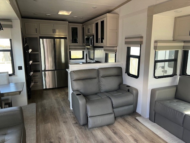 You won't believe all that this fifth wheel has to offer! Starting with the rear kitchen which has plenty of countertop space to prepare your delicious meals, a four burner cooktop with an Insignia 24" residential oven to cook them, and a large single bowl stainless steel sink for easy clean up. The living area has opposing tri-fold sofas and a 54" theater seat with USB charging and storage across from an entertainment center with 50" Smart TV. The half bathroom is close to the living area so you can get back to watching your movie faster. You will feel right at home sleeping in the master suite on a slide out king bed across from a dresser and bench where you can sit while you put on your shoes, plus entrance into the front full bathroom. Inside the bathroom, you will find a vanity with dual sinks for two to get ready at once, a large signature spa shower with a seat, and a walk-in closet with a second dresser plus washer and dryer prep!