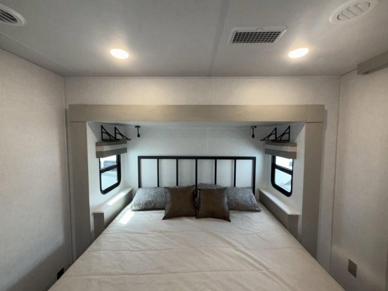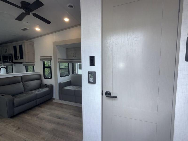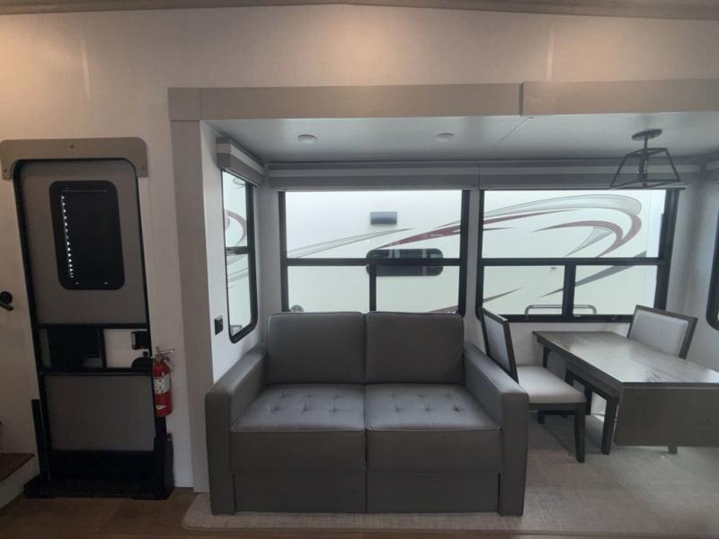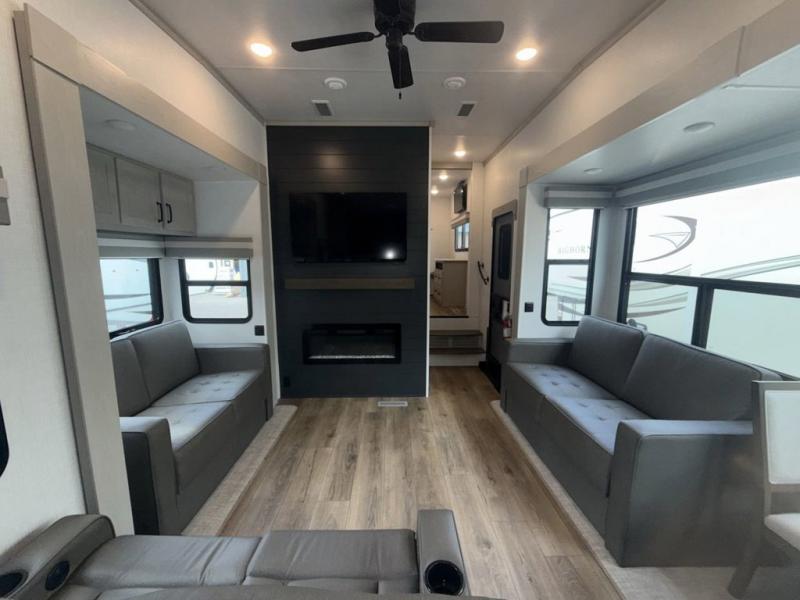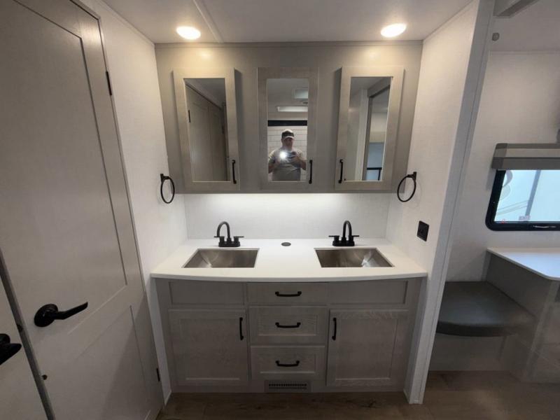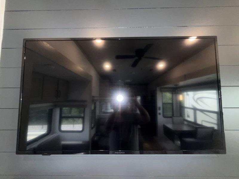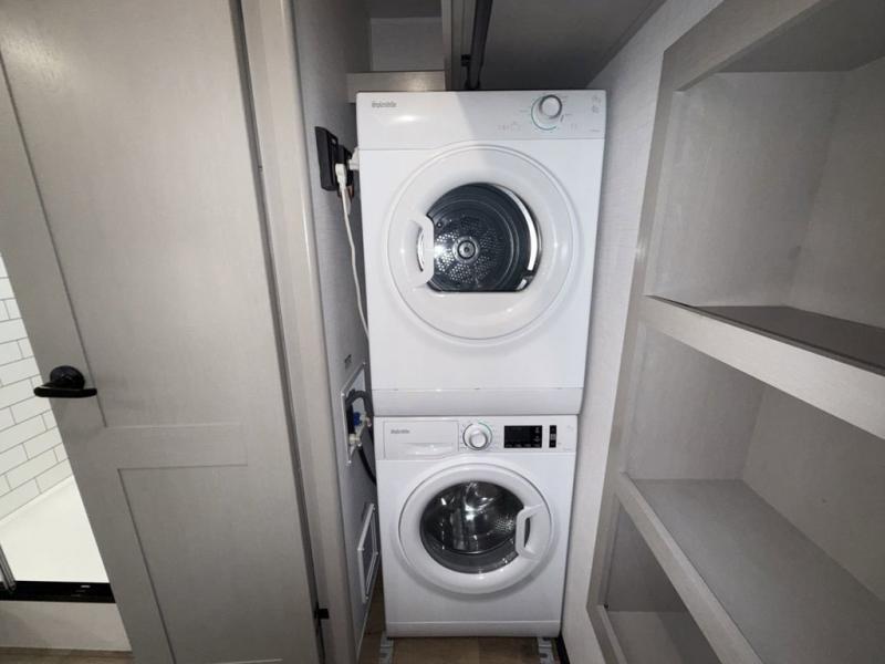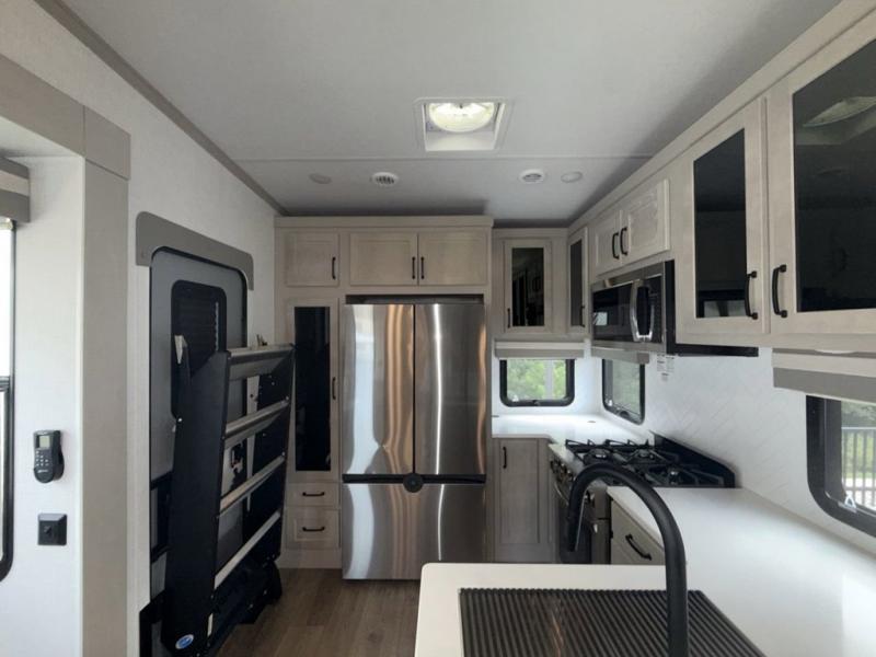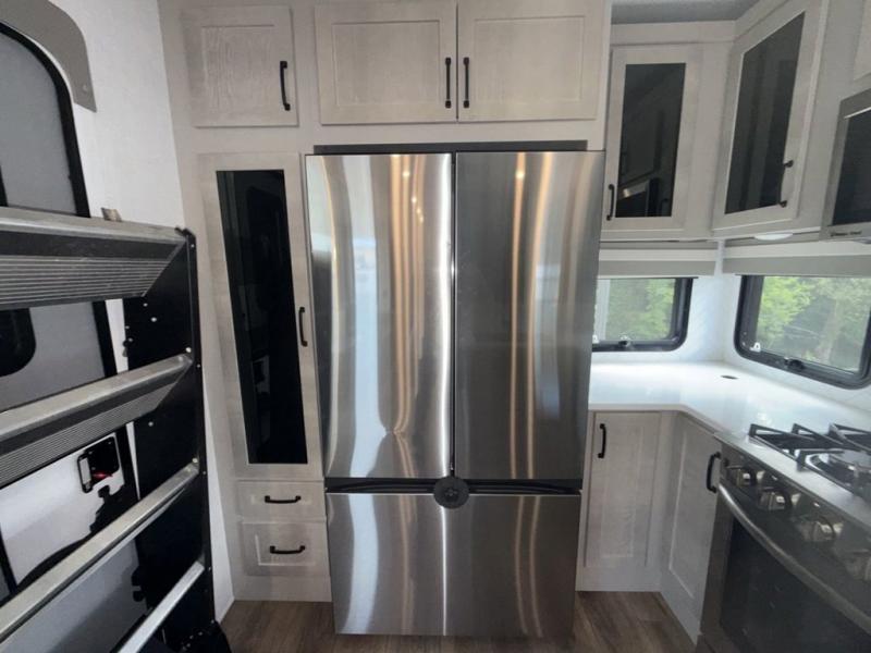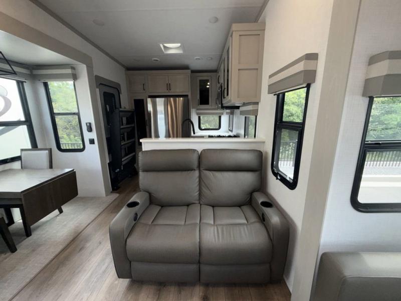 You won't believe all that this fifth wheel has to offer! Starting with the rear kitchen which has plenty of countertop space to prepare your delicious meals, a four burner cooktop with an Insignia 24" residential oven to cook them, and a large single bowl stainless steel sink for easy clean up. The living area has opposing tri-fold sofas and a 54" theater seat with USB charging and storage across from an entertainment center with 50" Smart TV. The half bathroom is close to the living area so you can get back to watching your movie faster. You will feel right at home sleeping in the master suite on a slide out king bed across from a dresser and bench where you can sit while you put on your shoes, plus entrance into the front full bathroom. Inside the bathroom, you will find a vanity with dual sinks for two to get ready at once, a large signature spa shower with a seat, and a walk-in closet with a second dresser plus washer and dryer prep!