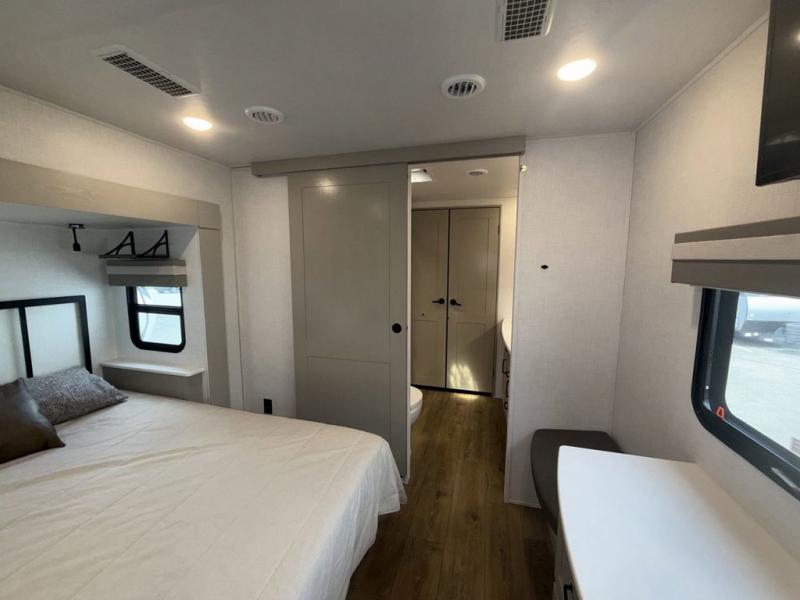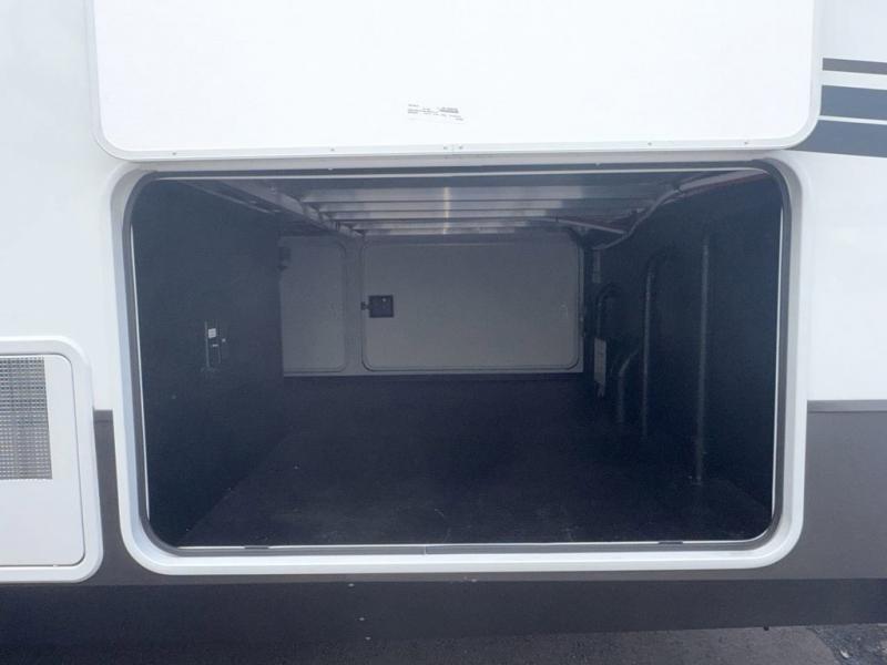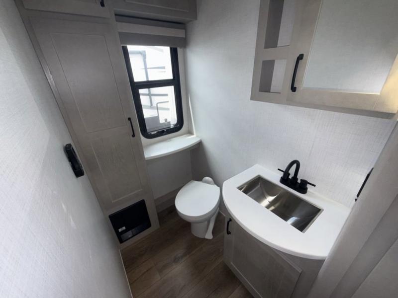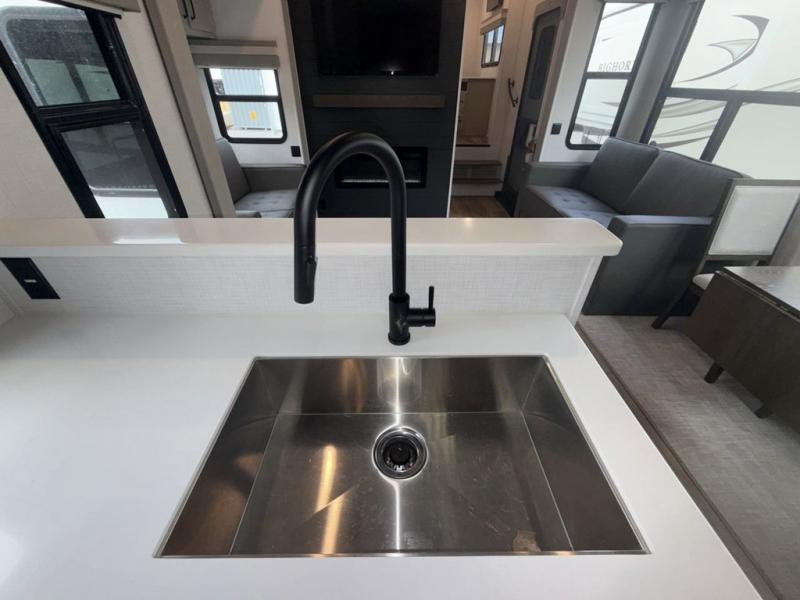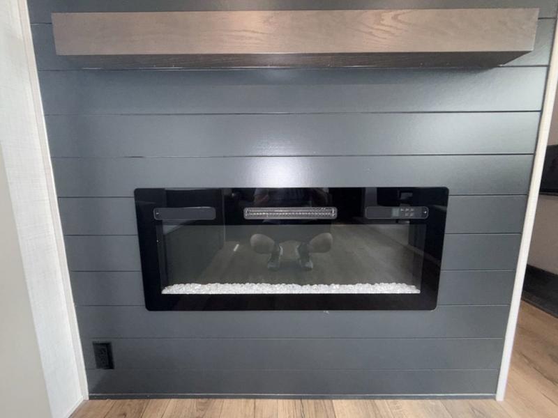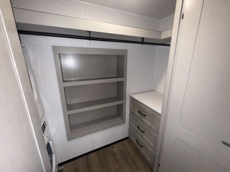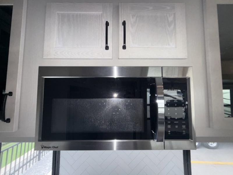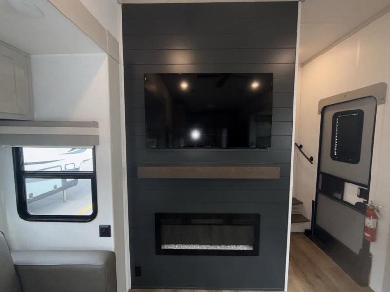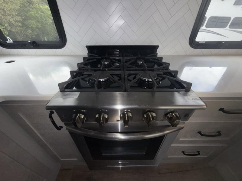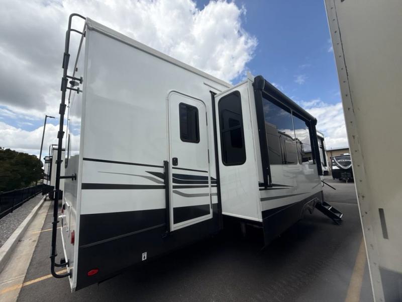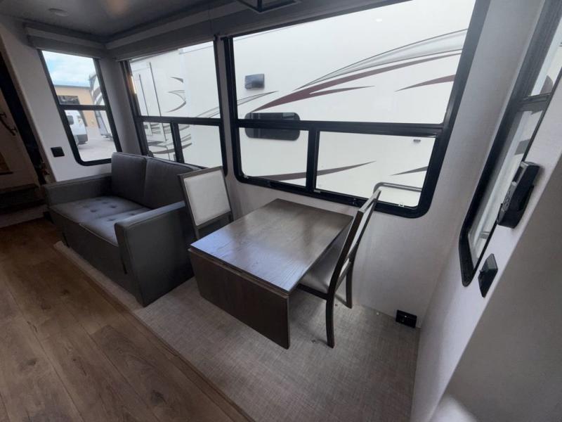 You won't believe all that this fifth wheel has to offer! Starting with the rear kitchen which has plenty of countertop space to prepare your delicious meals, a four burner cooktop with an Insignia 24" residential oven to cook them, and a large single bowl stainless steel sink for easy clean up. The living area has opposing tri-fold sofas and a 54" theater seat with USB charging and storage across from an entertainment center with 50" Smart TV. The half bathroom is close to the living area so you can get back to watching your movie faster. You will feel right at home sleeping in the master suite on a slide out king bed across from a dresser and bench where you can sit while you put on your shoes, plus entrance into the front full bathroom. Inside the bathroom, you will find a vanity with dual sinks for two to get ready at once, a large signature spa shower with a seat, and a walk-in closet with a second dresser plus washer and dryer prep!