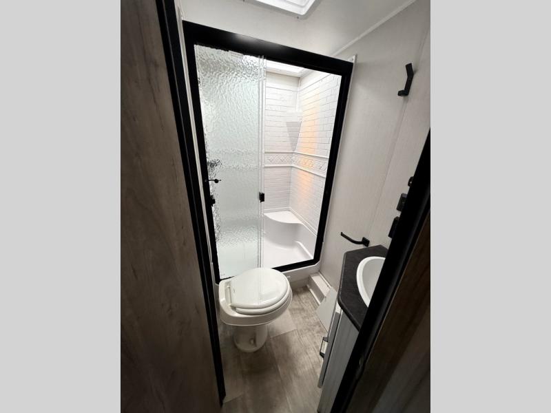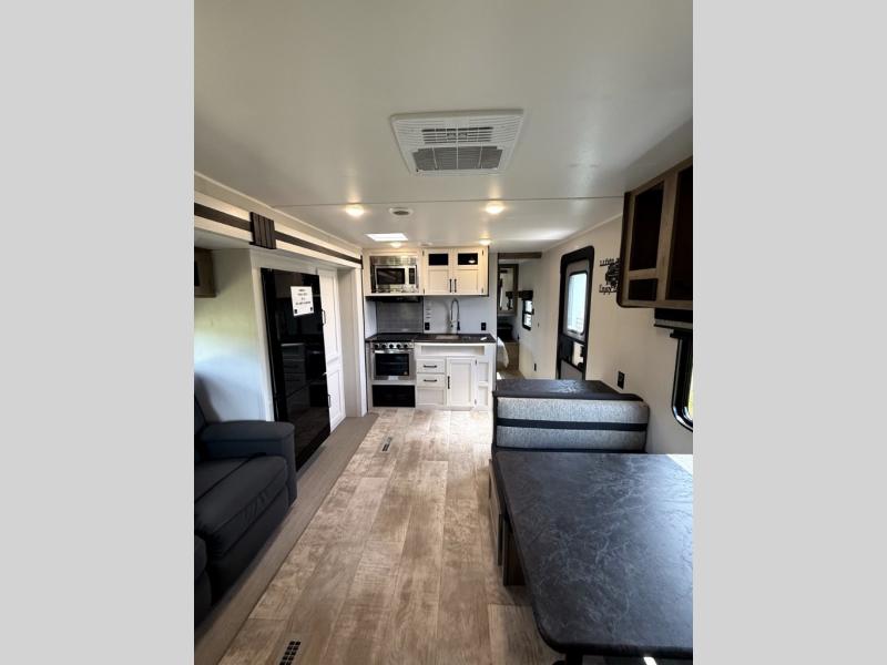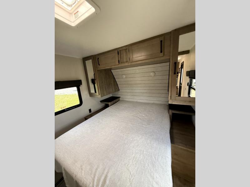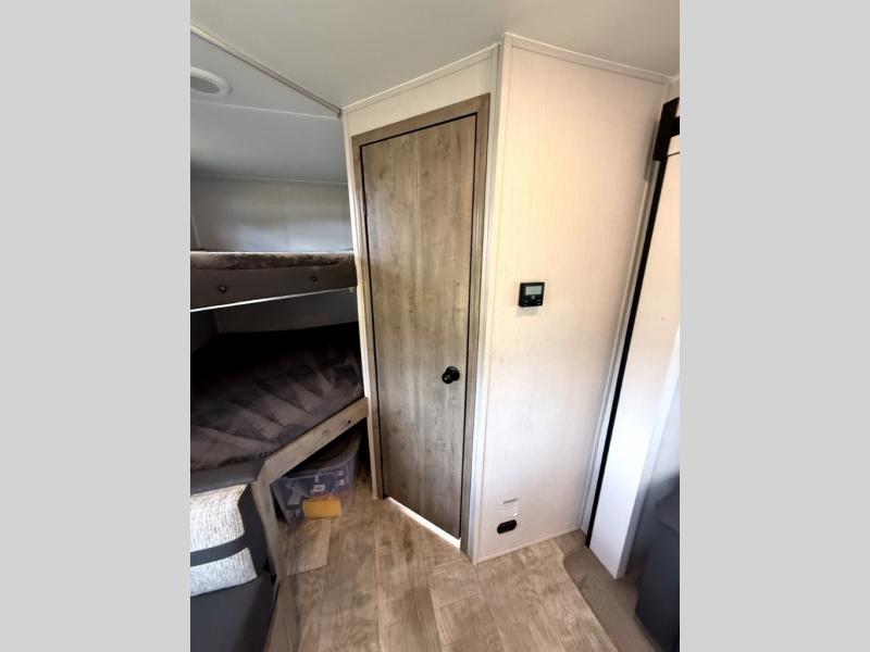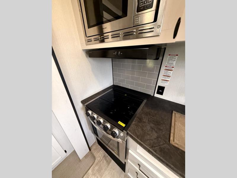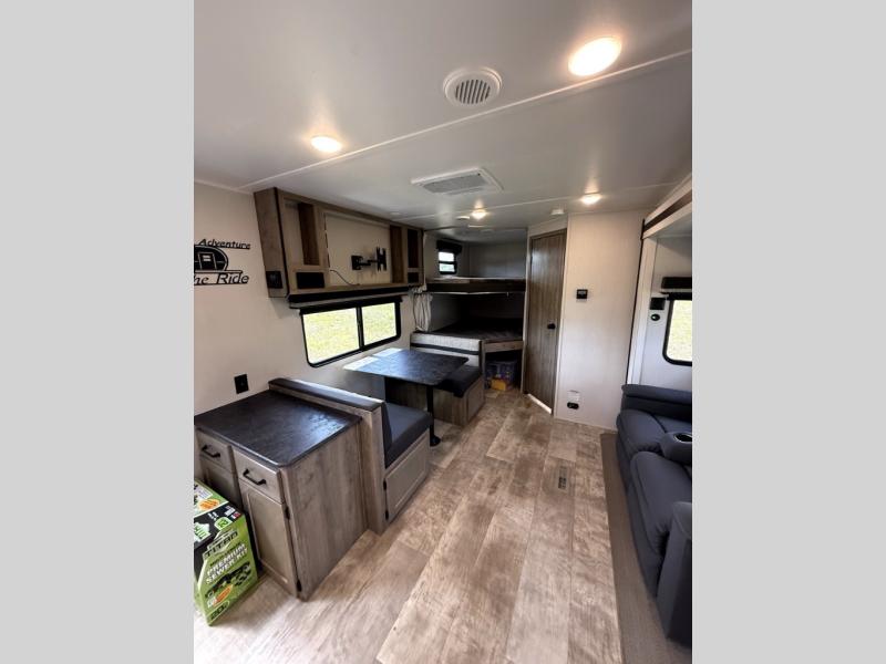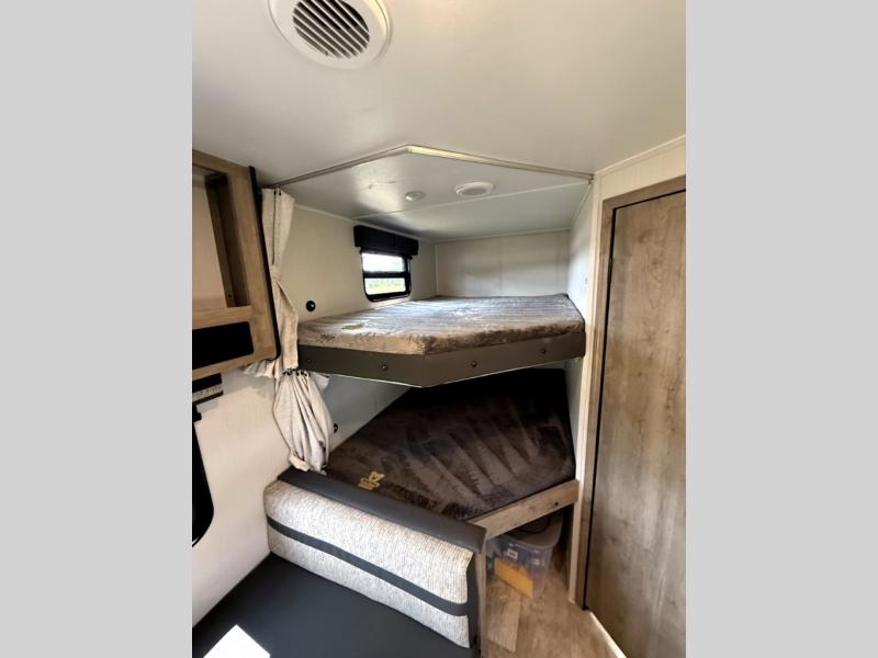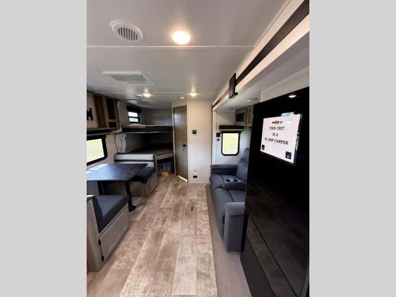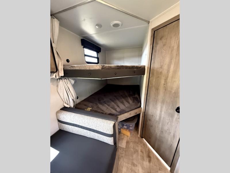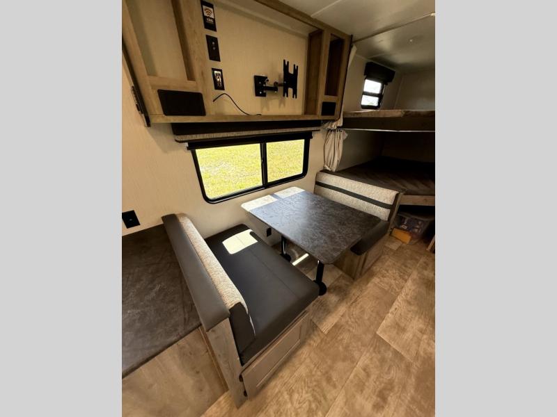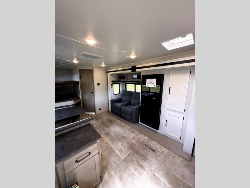 There's room for the whole family in this travel trailer! You will enjoy your own privacy with the front private bedroom which features a 60" x 74" RV queen bed with shirt closets on either side to hang your clothes, and a shelf above for your books or alarm clock. The kiddos can sleep on the set of 48" x 76" double bunk beds with storage underneath. They can even invite a friend or two to join in on the fun and sleep on either the sofa or booth dinette once converted. Everyone can freshen up in the rear corner bathroom with a 32" x 40" shower with a seat, and keep their bellies full with the three burner cooktop. You could even choose to add the optional outside mini kitchen if you enjoy cooking outdoors!