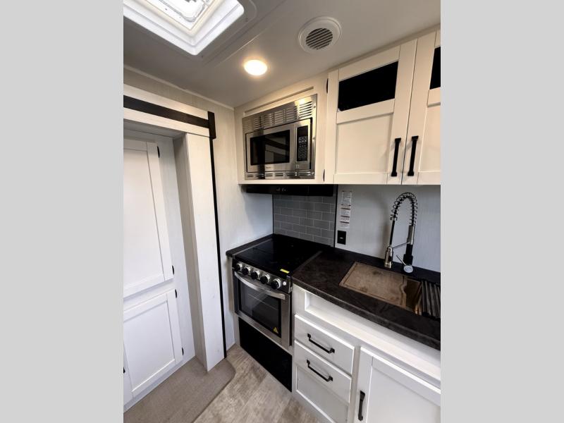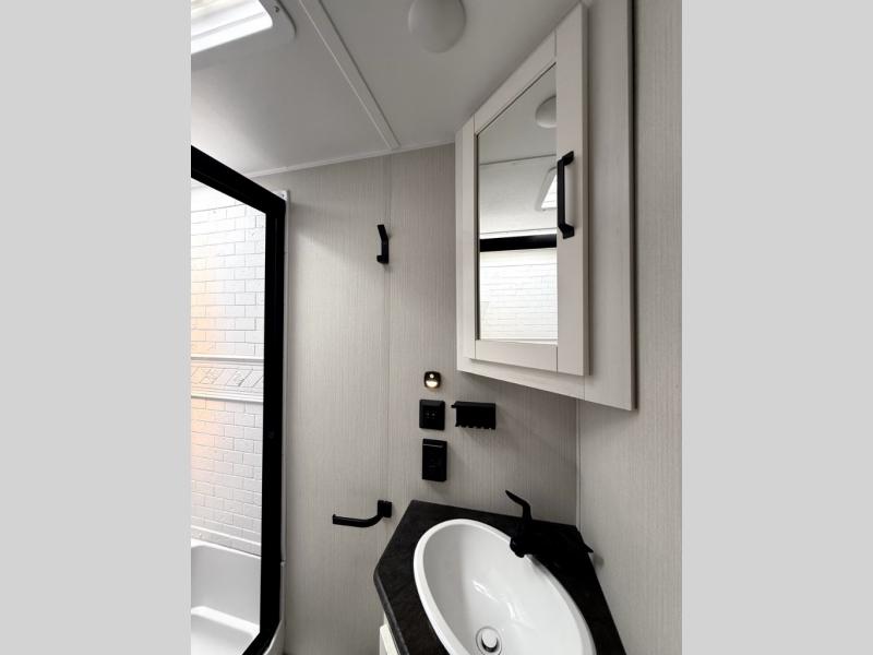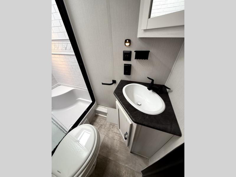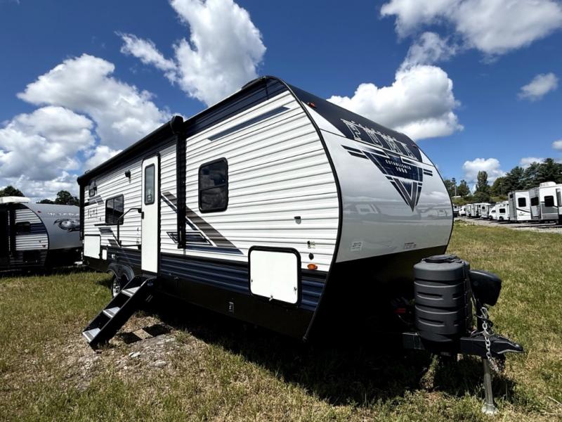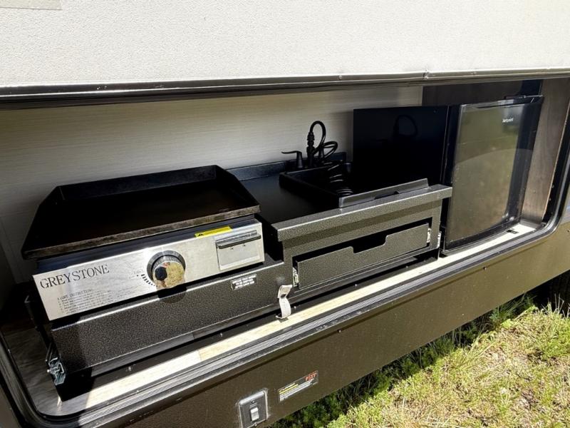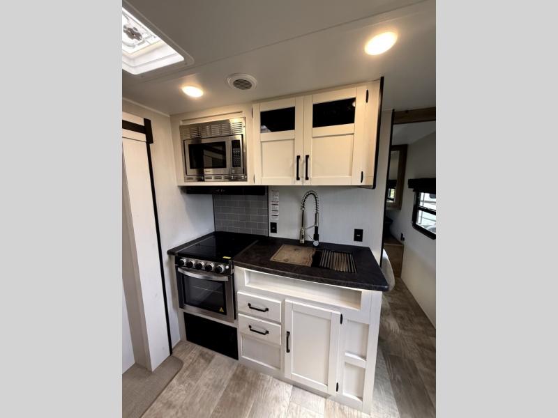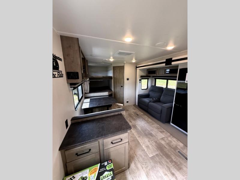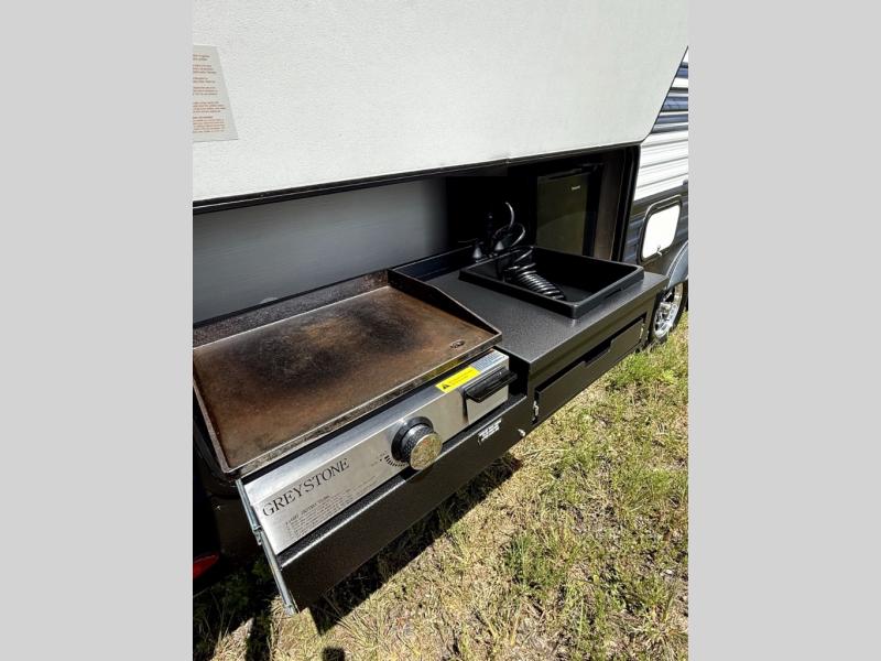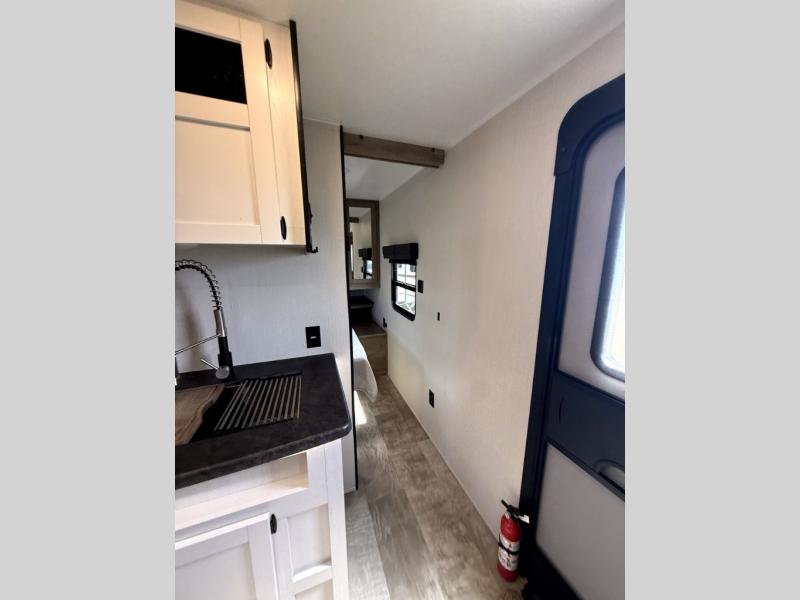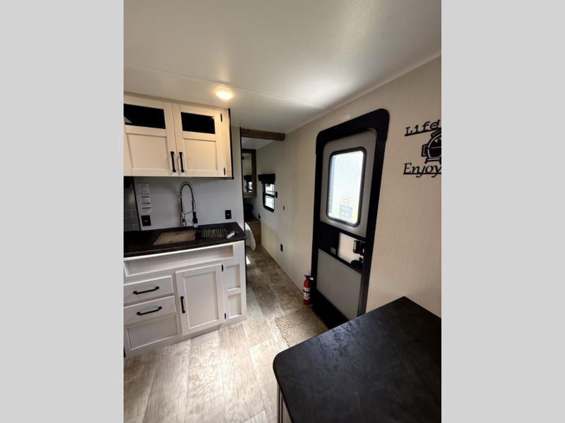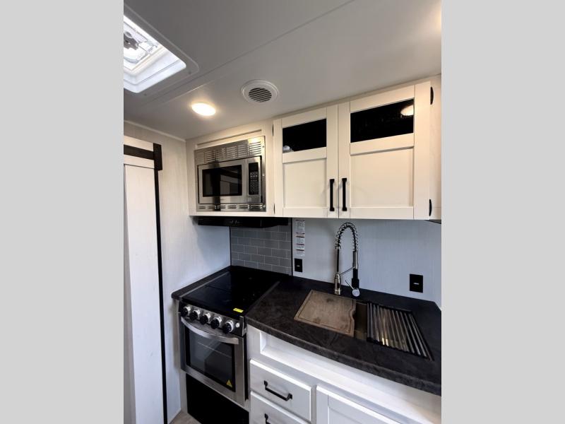 There's room for the whole family in this travel trailer! You will enjoy your own privacy with the front private bedroom which features a 60" x 74" RV queen bed with shirt closets on either side to hang your clothes, and a shelf above for your books or alarm clock. The kiddos can sleep on the set of 48" x 76" double bunk beds with storage underneath. They can even invite a friend or two to join in on the fun and sleep on either the sofa or booth dinette once converted. Everyone can freshen up in the rear corner bathroom with a 32" x 40" shower with a seat, and keep their bellies full with the three burner cooktop. You could even choose to add the optional outside mini kitchen if you enjoy cooking outdoors!