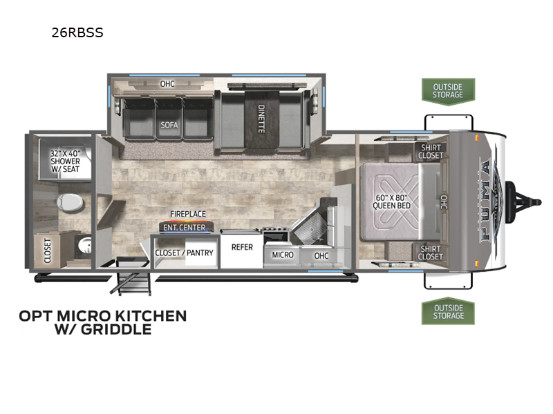 Pack your bags and hitch up this travel trailer for a great adventure! The full rear bathroom has a 32" x 40" shower with a seat and a closet for you to start each morning feeling clean and fresh. Now that you're ready for the day, grab some eggs from the 11 cu. ft. stainless steel refrigerator to fry on the three burner cooktop and enjoy at the booth dinette. If mother nature is raining on your parade then you can relax on the sofa and watch your favorite movies with the entertainment center which has a closet/pantry behind it.