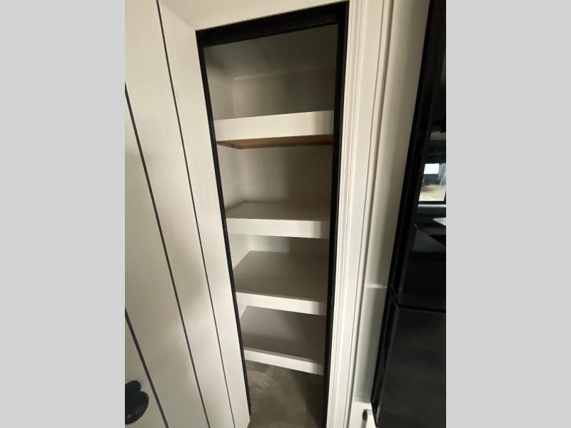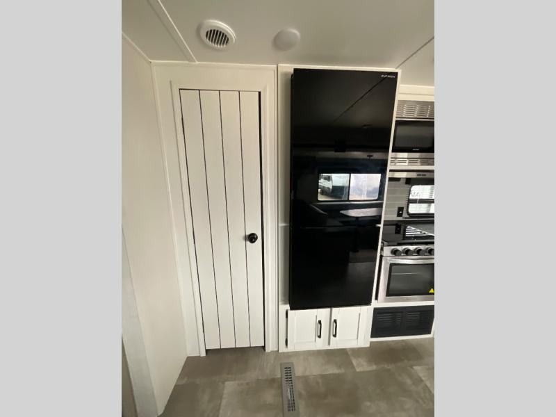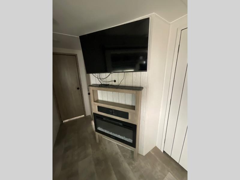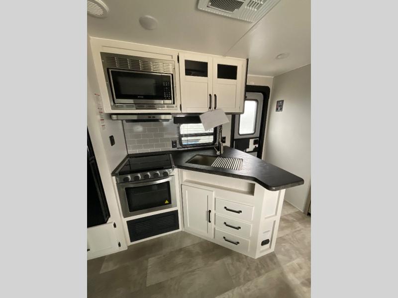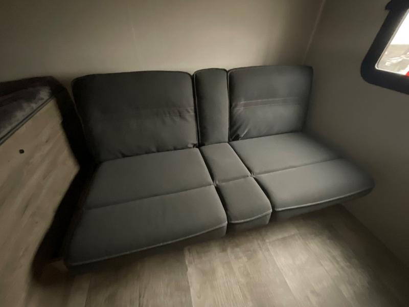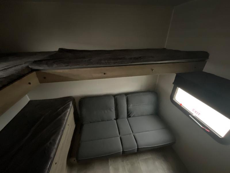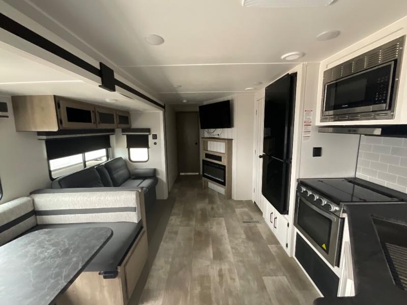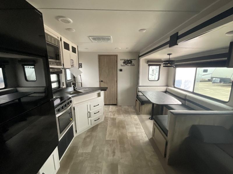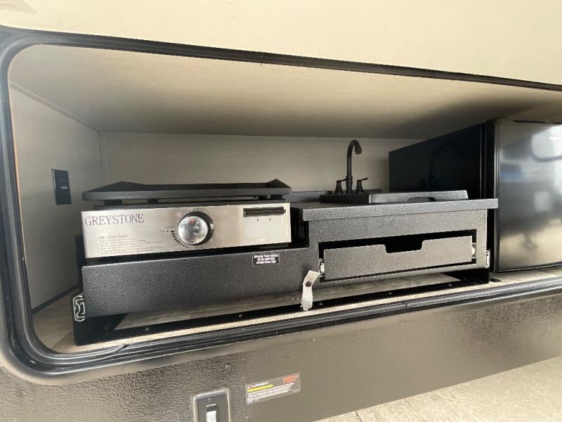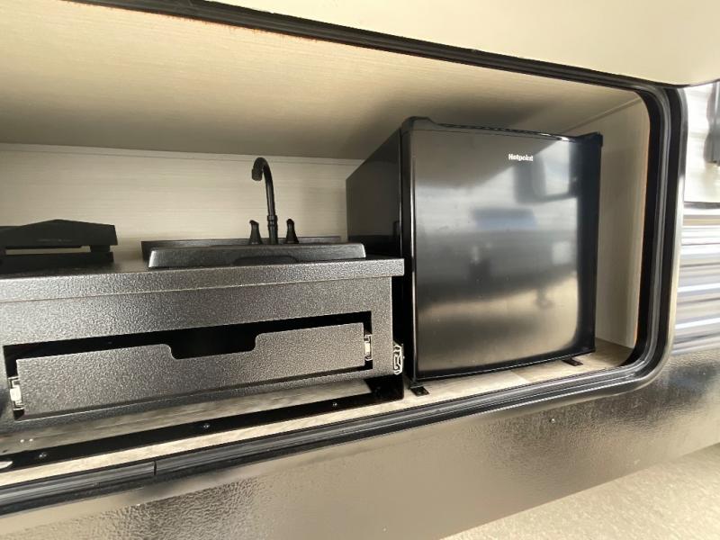 There's a comfortable place to sleep for the whole family in this travel trailer! The rear private bunkhouse has a set of 28" x 76" bunk beds, a 28" x 65" bunk above a sofa, and a wardrobe with an entertainment center above it so they can bring a cousin or two to join in on the fun. You will have your own privacy with the front private bedroom which has a queen bed with shirt closets and nightstands on either side of it. The spacious full bathroom has a 34" x 34" radius shower for everyone to freshen up and one of the entrances leads directly outside so you can get back to having fun fast. Prepare your best home cooked meals indoors with the walk-in pantry, the three burner cooktop, and the 11 cu. ft. stainless steel refrigerator. Plus, there is a U-shaped dinette to enjoy your meals and even transform into an extra sleeping space! Choose the optional mini outside kitchen for even more convenience!
