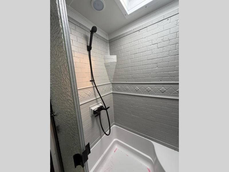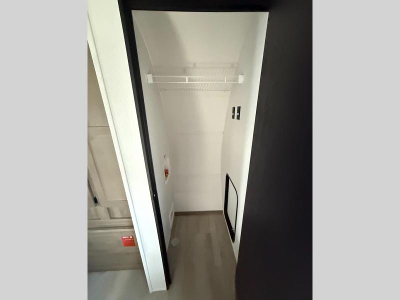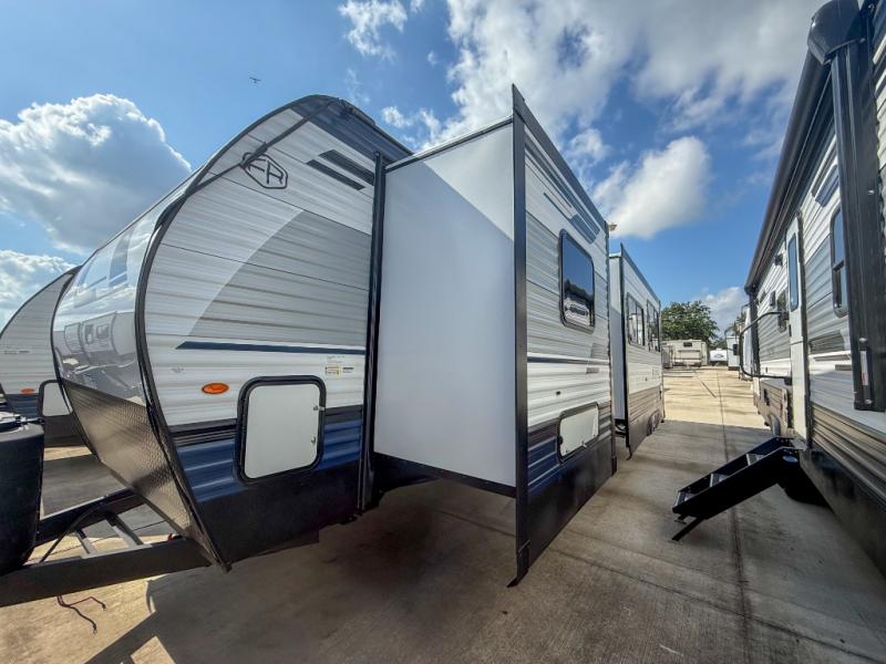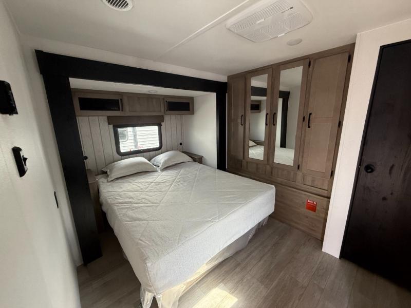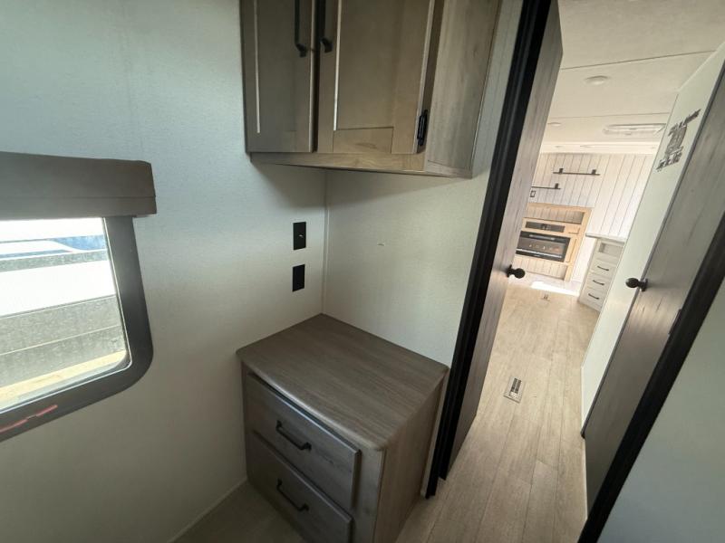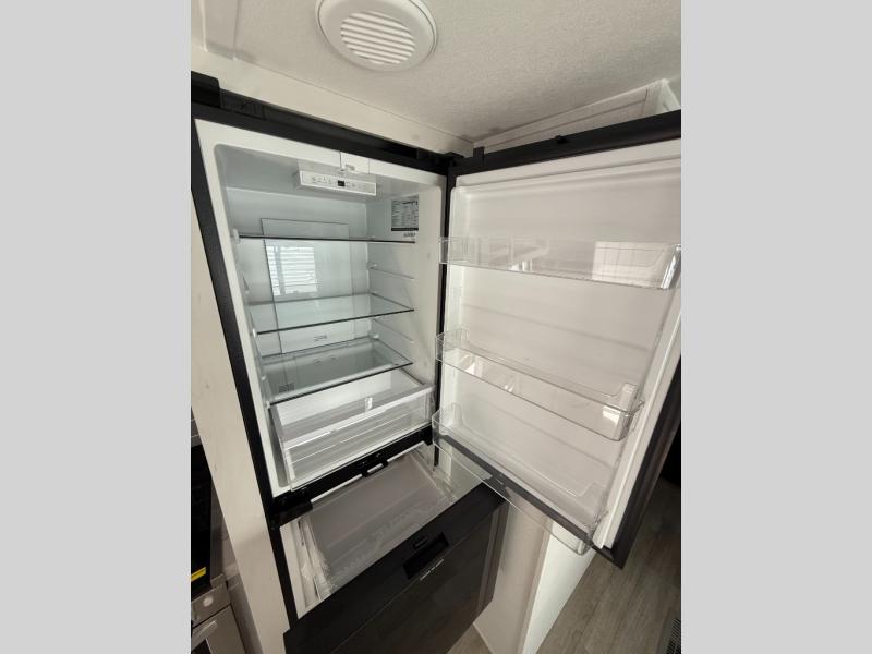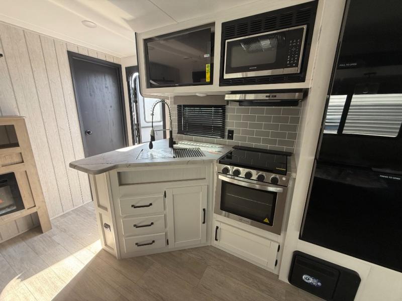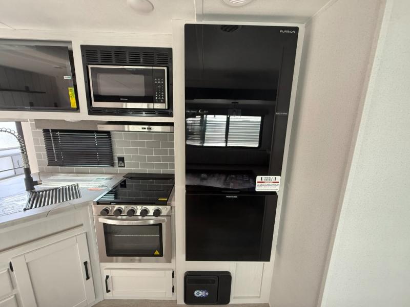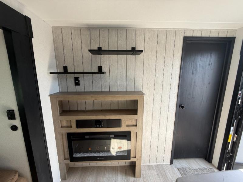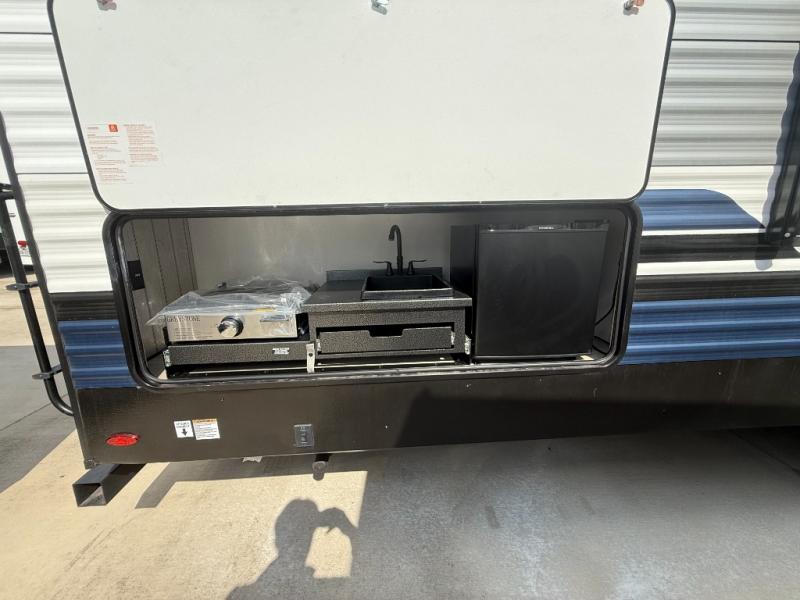 There's a comfortable place to sleep for the whole family in this travel trailer! The rear private bunkhouse features a set of 28" x 76" bunk beds, a 28" x 65" bunk above a sofa, and a wardrobe with an entertainment center above it so they can bring a friend or two to join in on the fun. You will have your own privacy with the front private bedroom which features a queen bed slide for added floor space, plus a large front closet for your clothing, and a second closet with washer/dryer prep, and a dresser too! Everyone will enjoy the full bath which features a 32" x 40" shower with seat to freshen up in so you can skip the public facilities. This unit also offers a spacious combined kitchen and living room which features a u-dinette and sofa slide for plenty of seating for meals and hanging out, and an entertainment center and fireplace to enjoy when spending time inside. You will easily be able to prepare your best home cooked meals using the three burner cooktop, 11 cu. ft. stainless steel refrigerator, and microwave oven. Or, you may wish to choose the optional outside kitchen with griddle.
