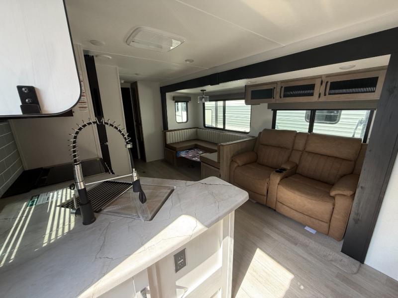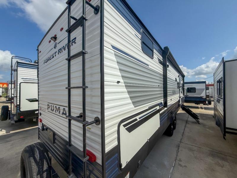 If you're looking for family-fun adventures then you need one of these Palomino Puma fifth wheels or travel trailers! They are built rugged, easy to tow, and jam packed with features. The Darco wrapped underbelly will protect your units vitals through every season and the AlphaPly roofing membrane covers it. They also have super lube axles and a powder coated frame. Their luxurious interiors feature a spice rack and built-in knife rack in the kitchen, USB charging ports to keep your electronics at 100%, and high density foam mattresses for a good night's rest. The required Advantage package comes with night roller shades for privacy, two outside speakers to crank up the tunes while you play cornhole, and an outside shower to keep the dirt outside where it belongs, plus so much more!