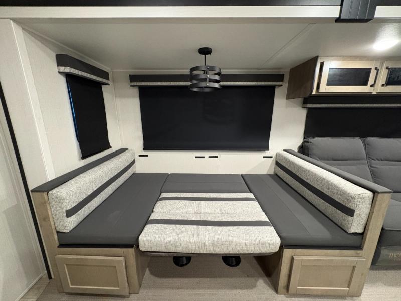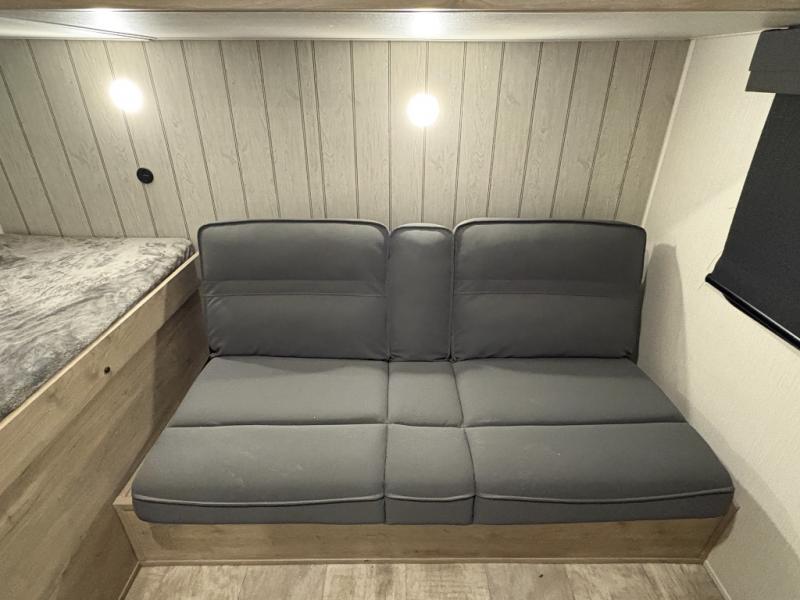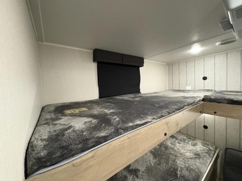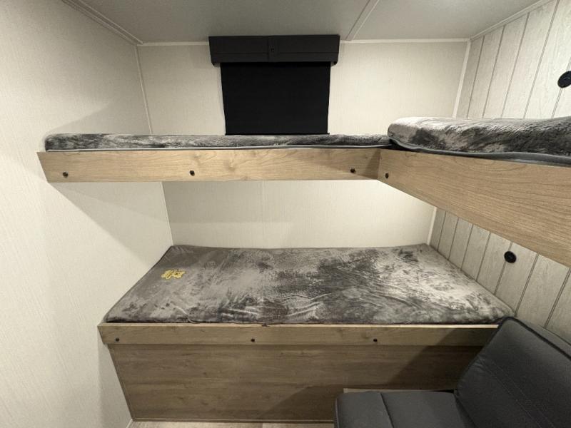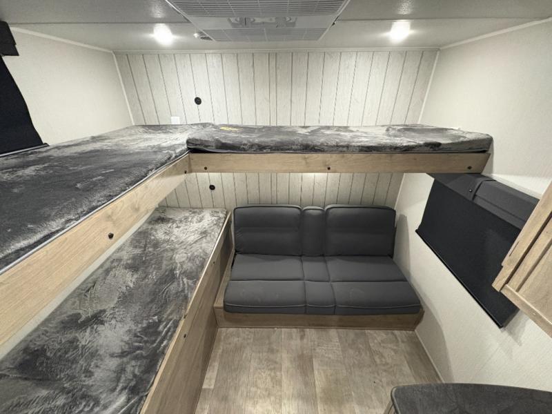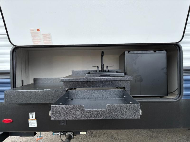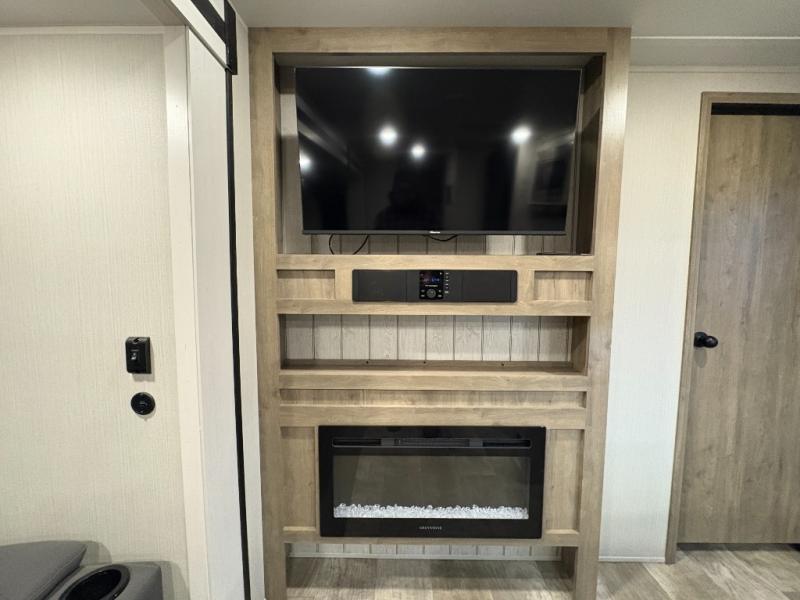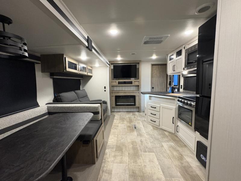 There's a comfortable place to sleep for the whole family in this travel trailer! The rear private bunkhouse features a set of 28" x 76" bunk beds, a 28" x 65" bunk above a sofa, and a wardrobe with an entertainment center above it so they can bring a friend or two to join in on the fun. You will have your own privacy with the front private bedroom which features a queen bed slide for added floor space, plus a large front closet for your clothing, and a second closet with washer/dryer prep, and a dresser too! Everyone will enjoy the full bath which features a 32" x 40" shower with seat to freshen up in so you can skip the public facilities. This unit also offers a spacious combined kitchen and living room which features a u-dinette and sofa slide for plenty of seating for meals and hanging out, and an entertainment center and fireplace to enjoy when spending time inside. You will easily be able to prepare your best home cooked meals using the three burner cooktop, 11 cu. ft. stainless steel refrigerator, and microwave oven. Or, you may wish to choose the optional outside kitchen with griddle.
