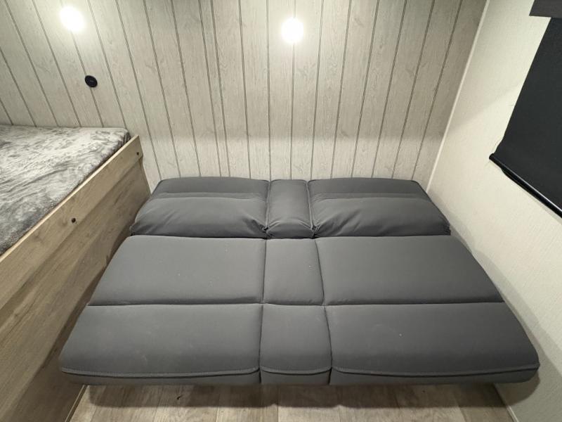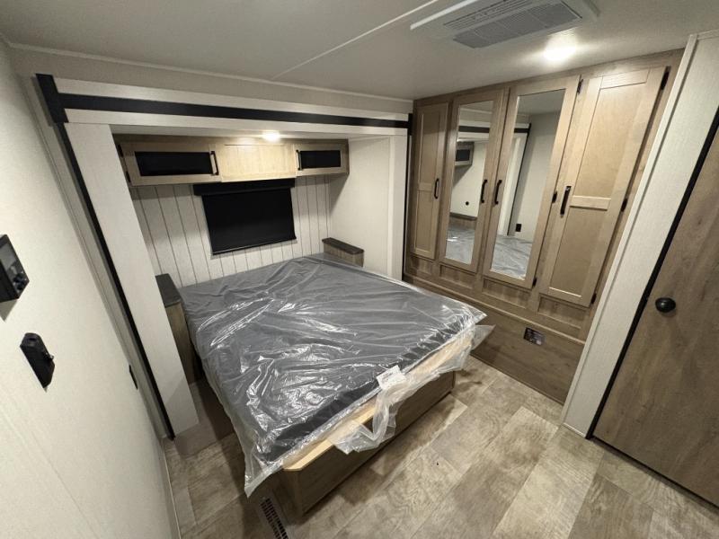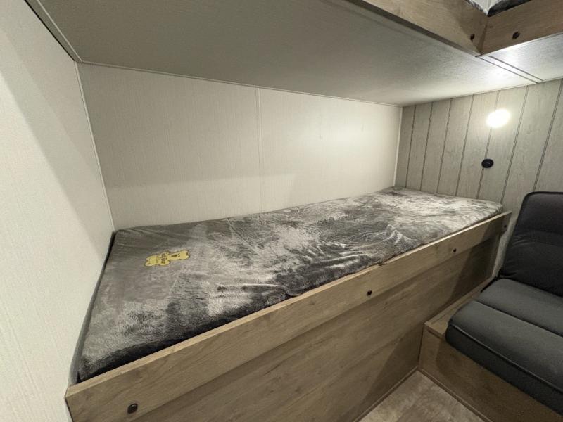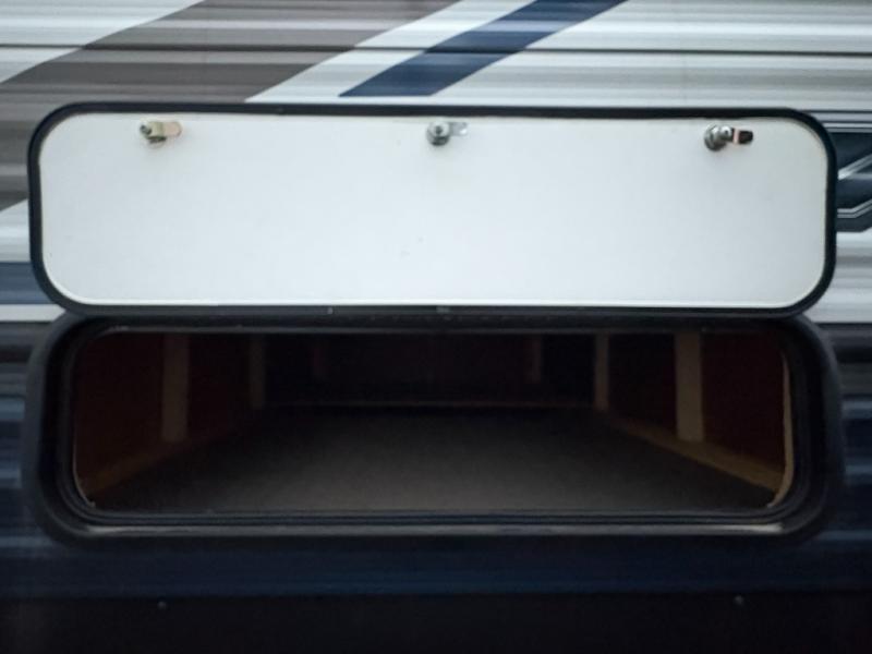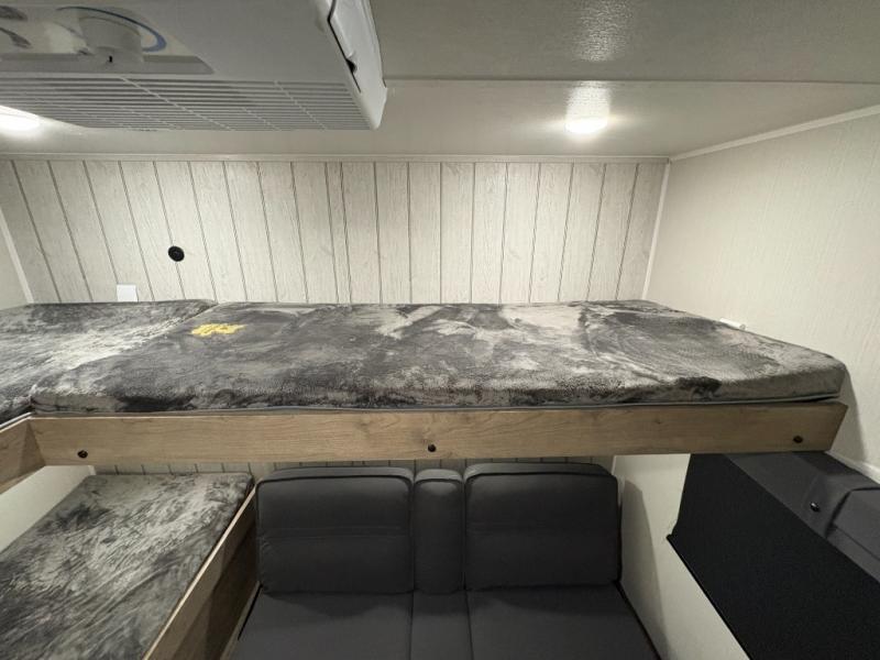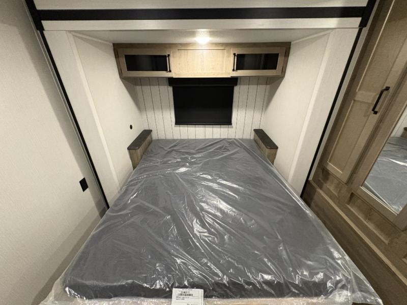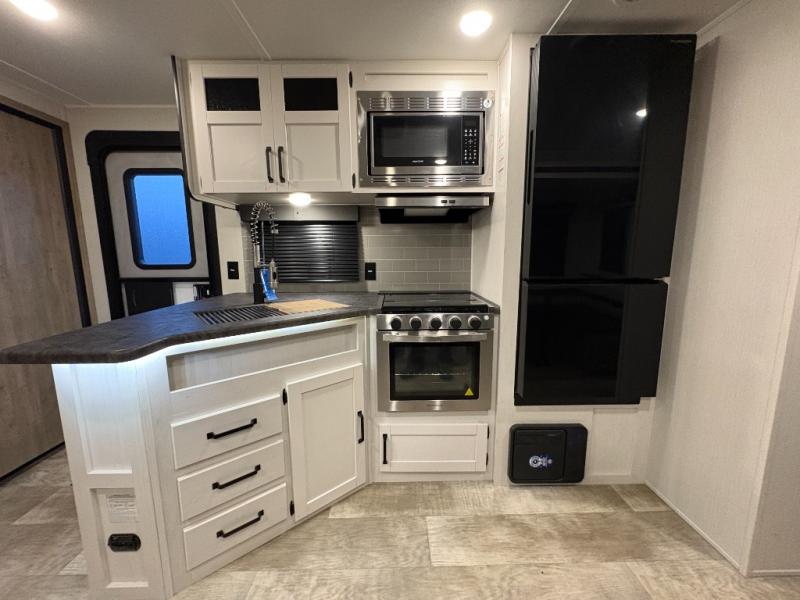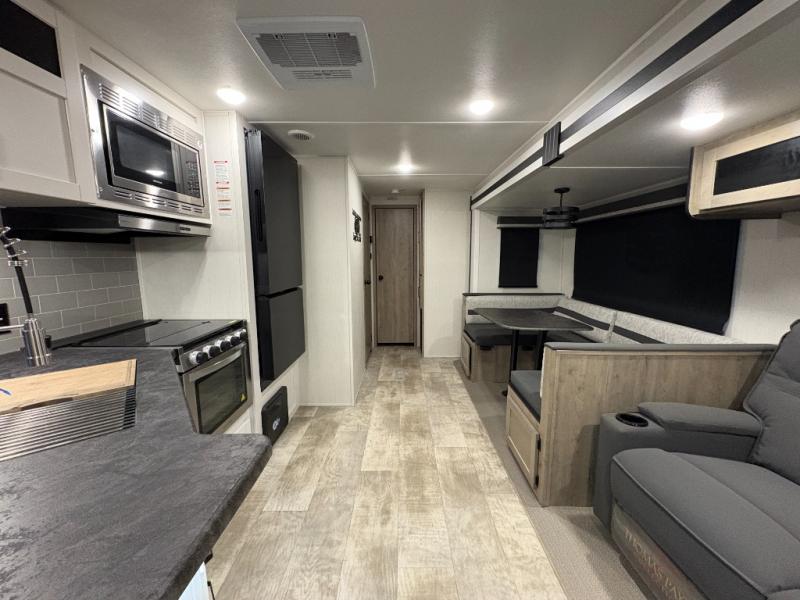 There's a comfortable place to sleep for the whole family in this travel trailer! The rear private bunkhouse features a set of 28" x 76" bunk beds, a 28" x 65" bunk above a sofa, and a wardrobe with an entertainment center above it so they can bring a friend or two to join in on the fun. You will have your own privacy with the front private bedroom which features a queen bed slide for added floor space, plus a large front closet for your clothing, and a second closet with washer/dryer prep, and a dresser too! Everyone will enjoy the full bath which features a 32" x 40" shower with seat to freshen up in so you can skip the public facilities. This unit also offers a spacious combined kitchen and living room which features a u-dinette and sofa slide for plenty of seating for meals and hanging out, and an entertainment center and fireplace to enjoy when spending time inside. You will easily be able to prepare your best home cooked meals using the three burner cooktop, 11 cu. ft. stainless steel refrigerator, and microwave oven. Or, you may wish to choose the optional outside kitchen with griddle.