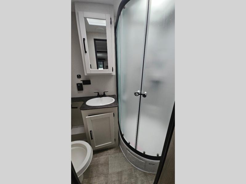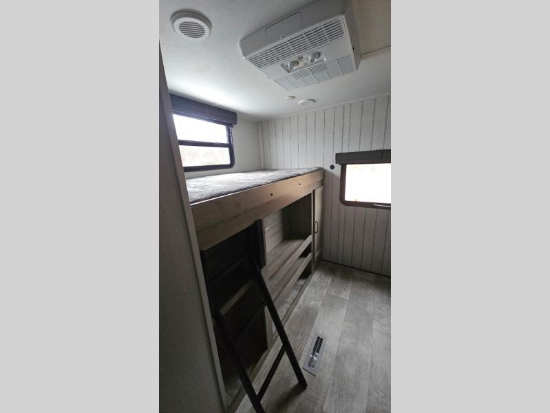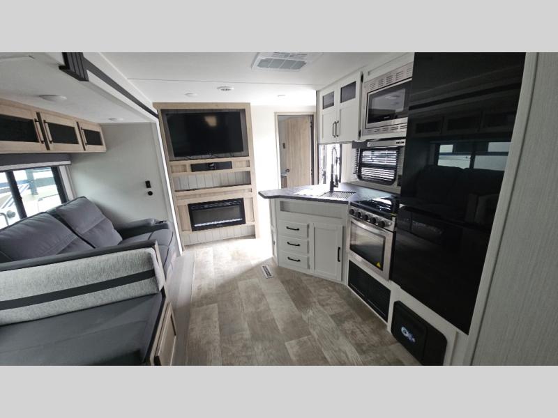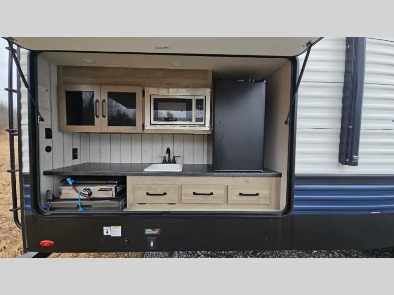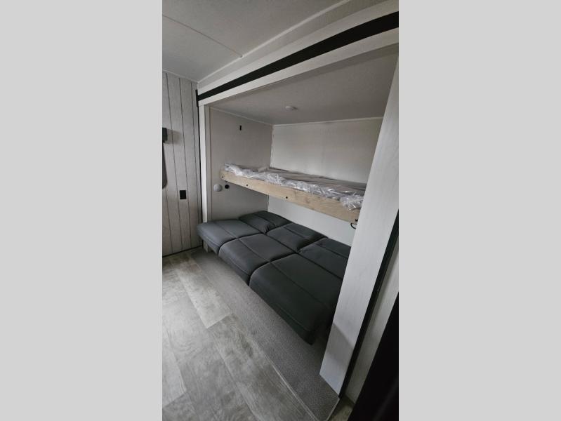 The whole family will love camping in this travel trailer! The kids will have their own privacy with the rear private bunkhouse which has a 32" x 69" bunk above a jiffy sofa slide and a 38" x 76" bunk above an entertainment center to keep them occupied on those rainy days. And you will have your own privacy with the front private bedroom that has a queen bed slide across from a dresser and a front closet. There is even a second closet with washer and dryer prep if you choose to add those appliances. Everyone can stay clean in the full bathroom with the 34" x 34" radius shower and their bellies full with a three burner cooktop. And you can choose between two outside kitchen options for even more convenience!