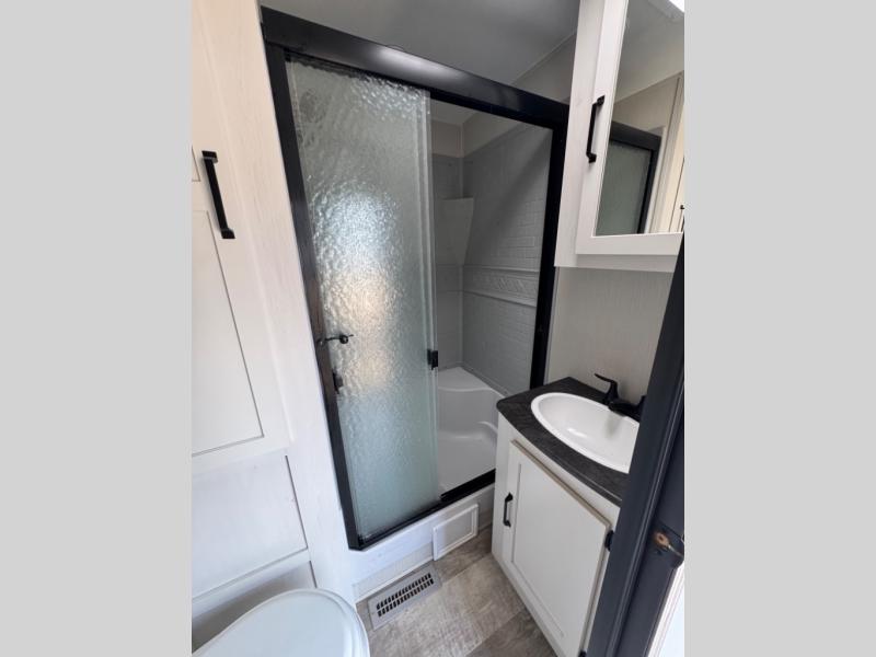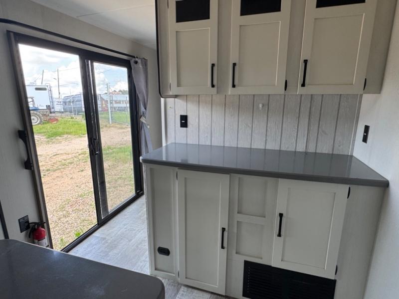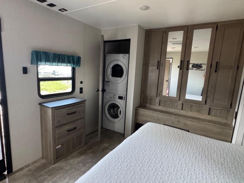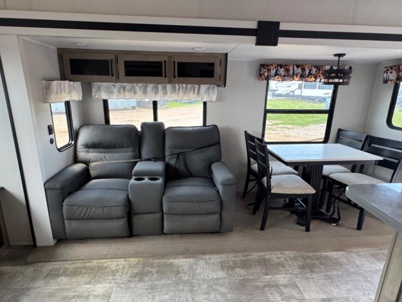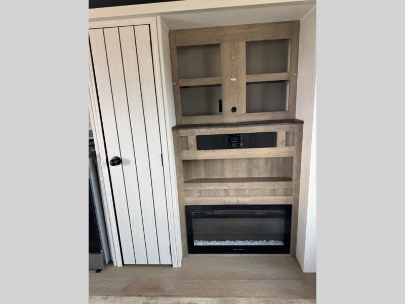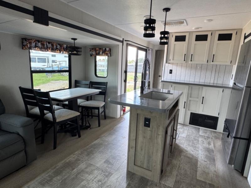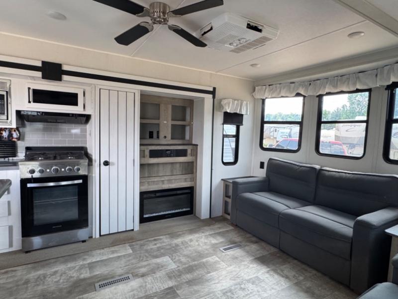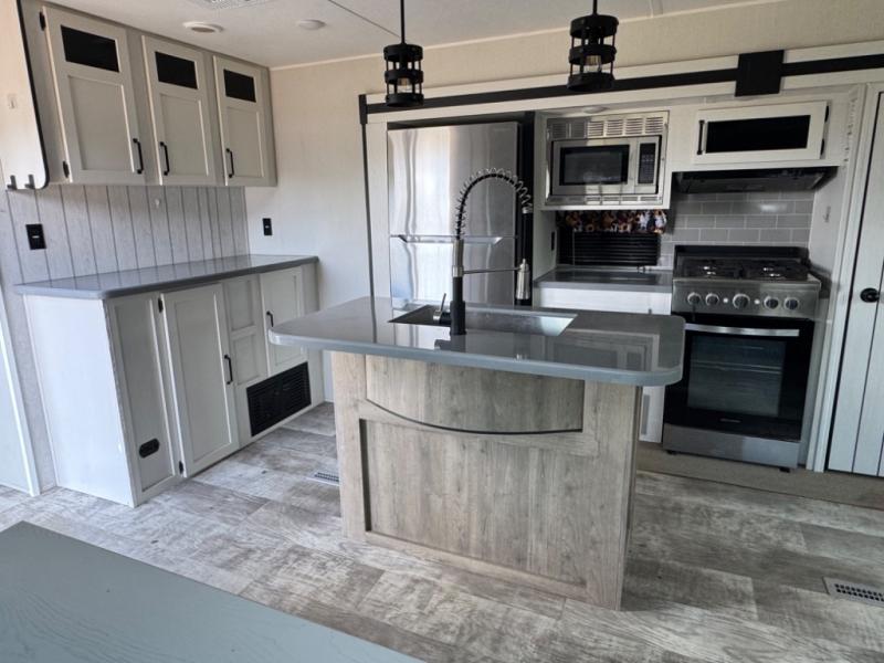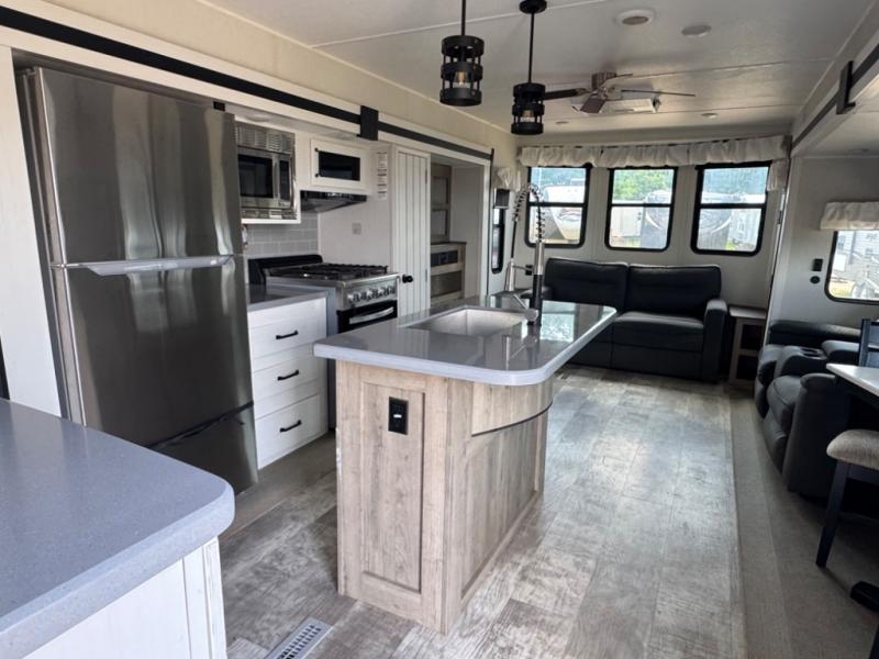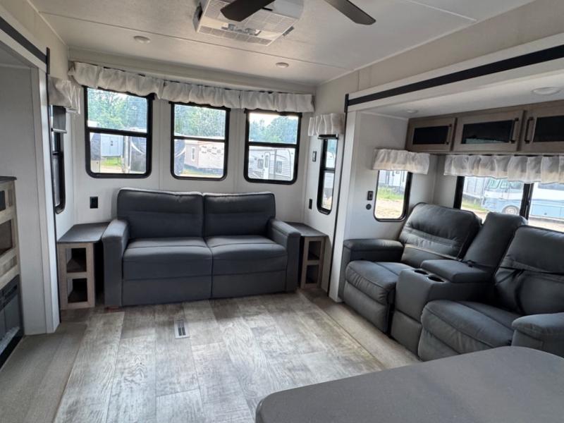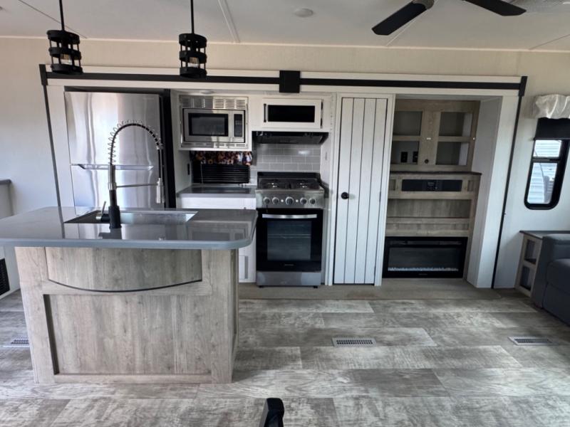 Get ready to enjoy your destination for a weekend or even longer in comfort with the front living and kitchen combined area. The sofa and booth dinette offer relaxing and dining space as well as sleeping space when needed. There are two recliners you are sure to love, and you might have decided to add the optional fireplace. There is a kitchen island to prepare and serve meals from, and wash the dishes. The kitchen offers full amenities including a residential style refrigerator and plenty of storage. You will surely enjoy the natural lighting from the patio door, and the second entry/exit is located in the rear private bedroom where you can sleep like a king, and you might like to wash your clothes if you added a washer/dryer option to the prepped space.