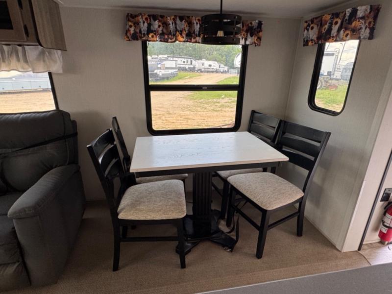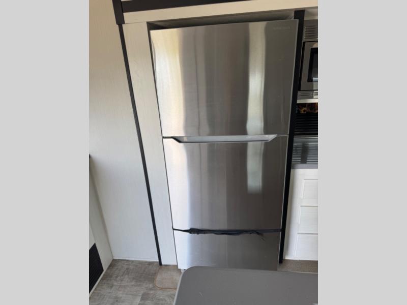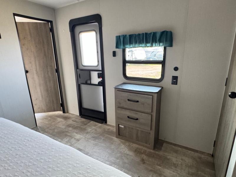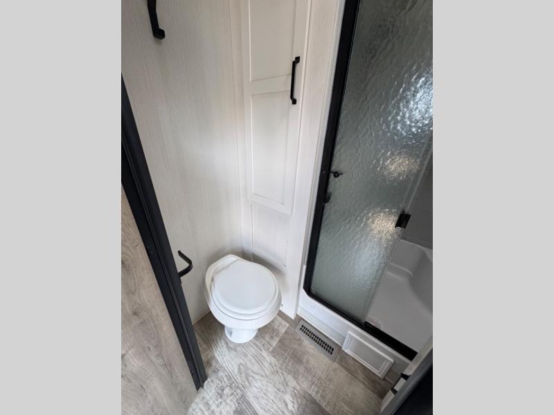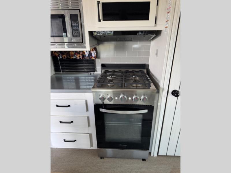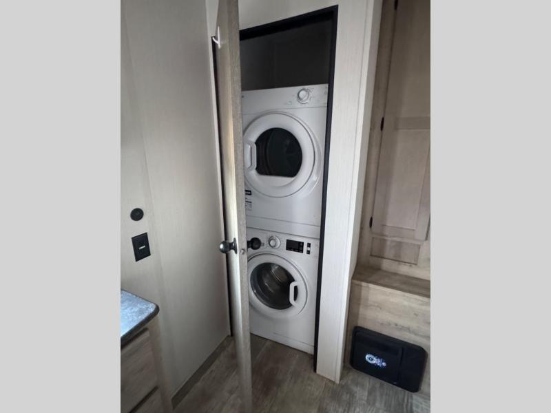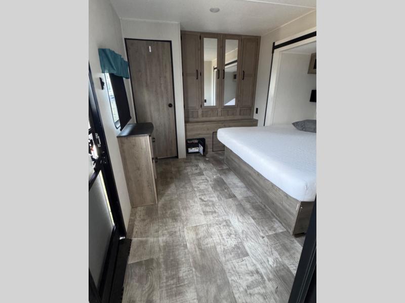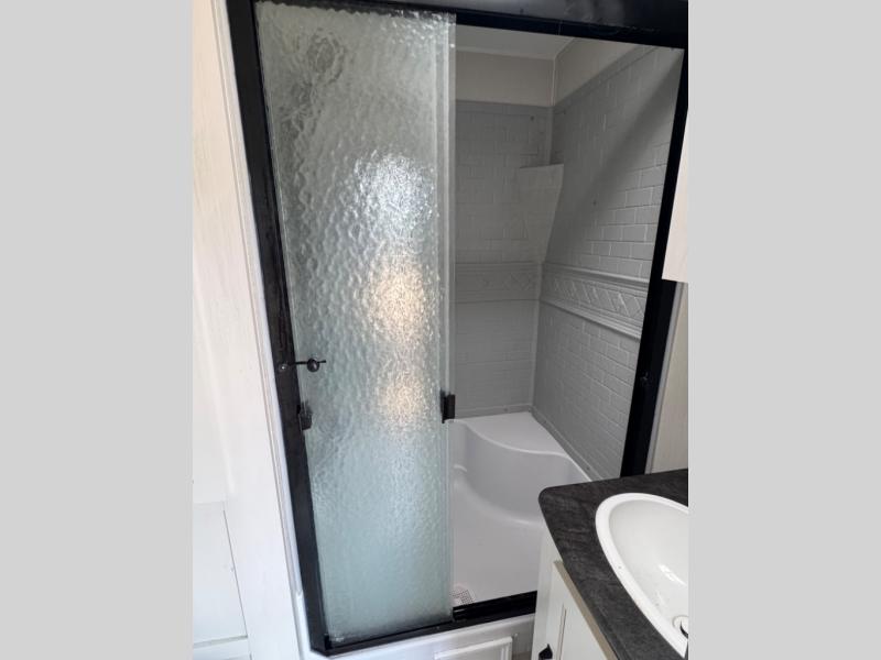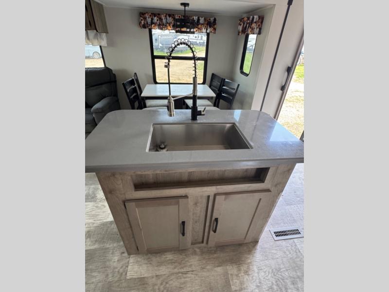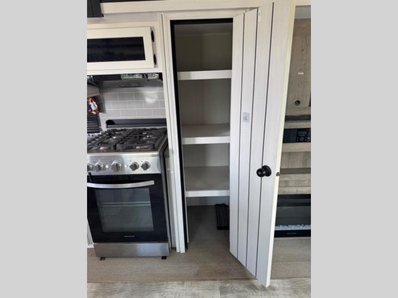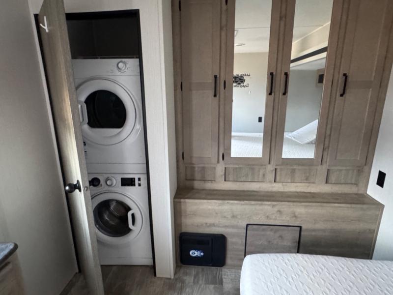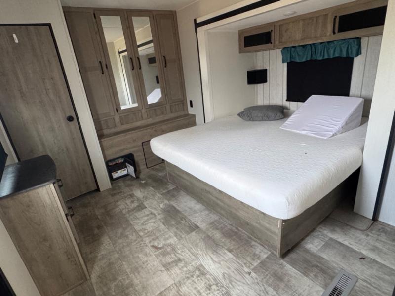 Get ready to enjoy your destination for a weekend or even longer in comfort with the front living and kitchen combined area. The sofa and booth dinette offer relaxing and dining space as well as sleeping space when needed. There are two recliners you are sure to love, and you might have decided to add the optional fireplace. There is a kitchen island to prepare and serve meals from, and wash the dishes. The kitchen offers full amenities including a residential style refrigerator and plenty of storage. You will surely enjoy the natural lighting from the patio door, and the second entry/exit is located in the rear private bedroom where you can sleep like a king, and you might like to wash your clothes if you added a washer/dryer option to the prepped space.