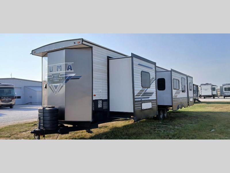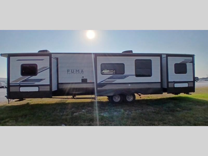 Get out of town and start enjoying the beautiful weather and scenery where you have chosen to place this Puma Destination. This spacious trailer has three slide outs for lots of interior floor space, plus two entries for convenience. The front bedroom offers a king bed slide, two closets, and a dresser. The rear bedroom suite includes a full bathroom and a queen bed slide, a vanity and a wardrobe. In between you can relax in the combined living and kitchen area on the sofa or booth dinette while visiting with the cook with full amenities.