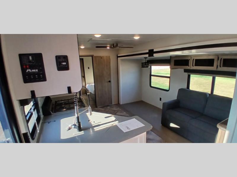 Each Puma Destination trailer by Palomino is designed to give you unforgettable getaways to the destination of your choice! The AlphaPly roofing membrane and powder coated frames are what make these models ultra durable, and the super lube axles will provide smooth towing from home to campground. The Value Shopper Package includes Beauflor linoleum, an AM/FM/Bluetooth stereo, a high-rise faucet with a sprayer, bedroom TV hook-up, and many many more conveniences. You'll find the designer window treatments in the living room and decorative kitchen backsplash will make your space feel more like home, plus there are USB charging ports for your electronics and plenty of storage space for all your belongings. And you can add the optional Marquis Edition Package that includes an outside shower, a solid surface countertop, two exterior speakers, and more features that will add to your comfort!