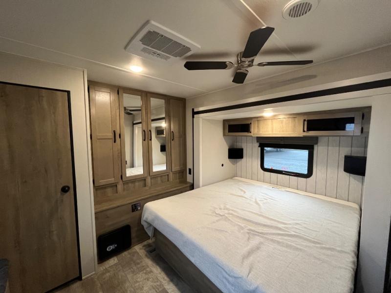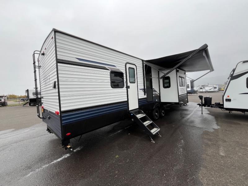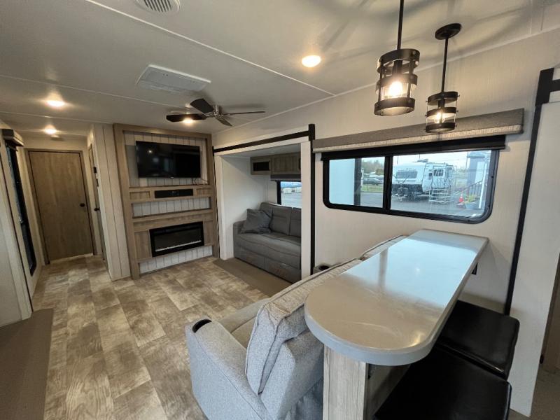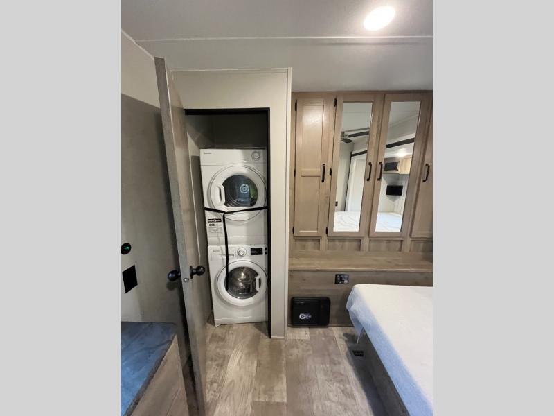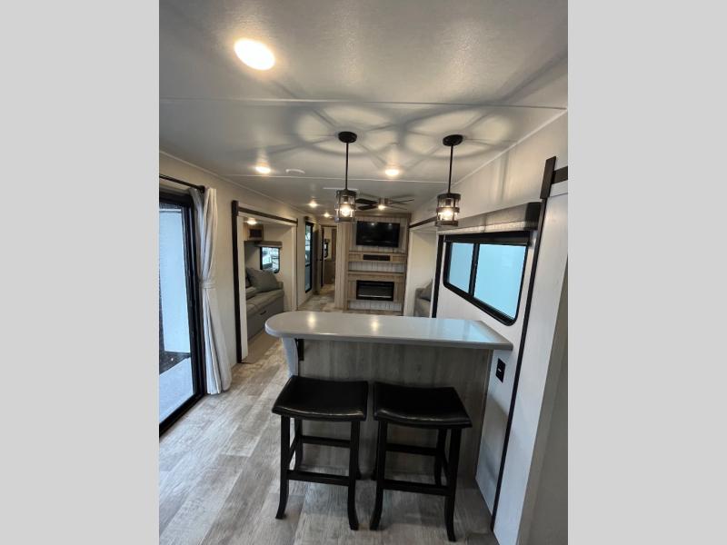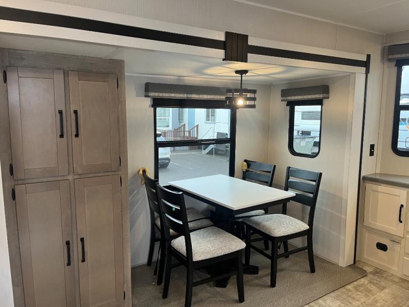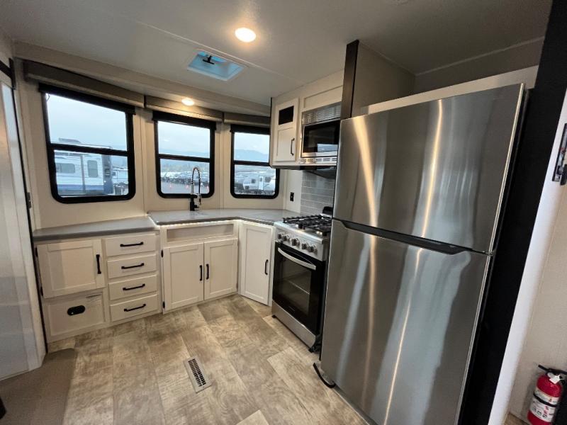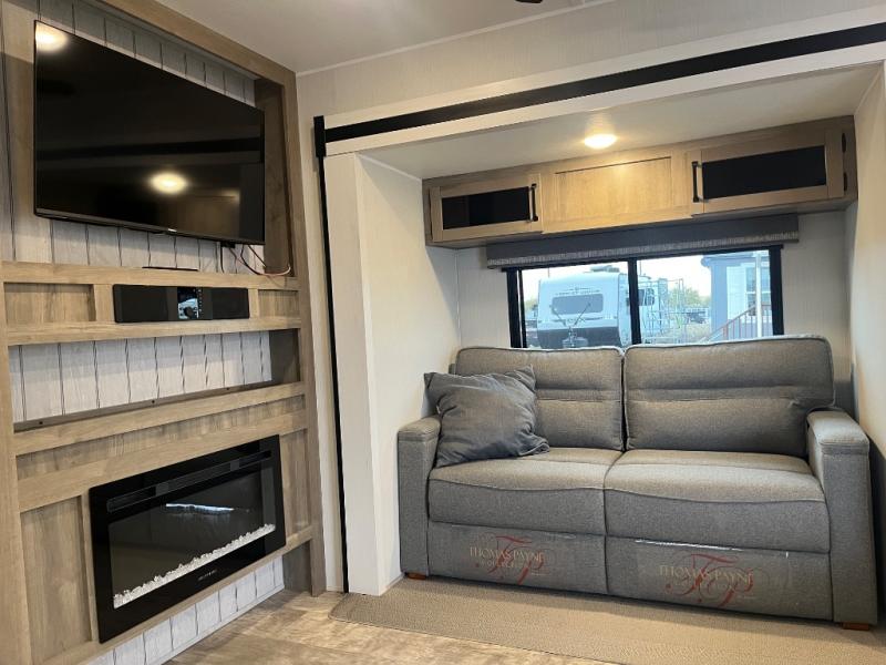 If you are looking for your own space in your next destination trailer, you have found it! With a front separate kitchen, a middle separate living area, a full bathroom and a rear bedroom, you can call one of these spaces your own. The cook will love the front counter space and appliances, and you can dine at the booth dinette or the breakfast nook. Someone can be visiting with friends and family while sitting on the two sofa slides or the two recliners, while another is getting ready in the full bathroom. You will sleep soundly on the king bed slide out, and the closet with washer and dryer prep will make full-time RV living easier than ever.