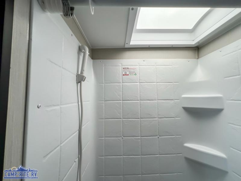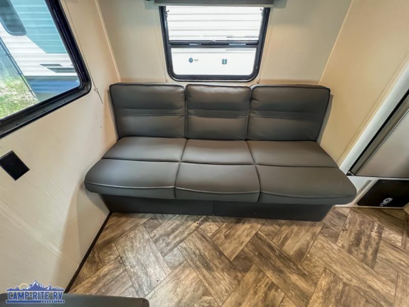 You can bring a couple guests with you to camp in this travel trailer! Lay your head at night on the front 60" x 74" queen bed with shirt closets on either side to hang your clothes. The sofa and booth dinette offer comfortable places to sleep once they are converted. You can even add an optional TV for more entertainment. Prepare your best meals with the three burner cooktop and store any leftovers in the 11 cu. ft. refrigerator to enjoy once again when you heat them up in the stainless steel microwave. There is even a full bathroom with a 38" tub for you to freshen up in each morning!