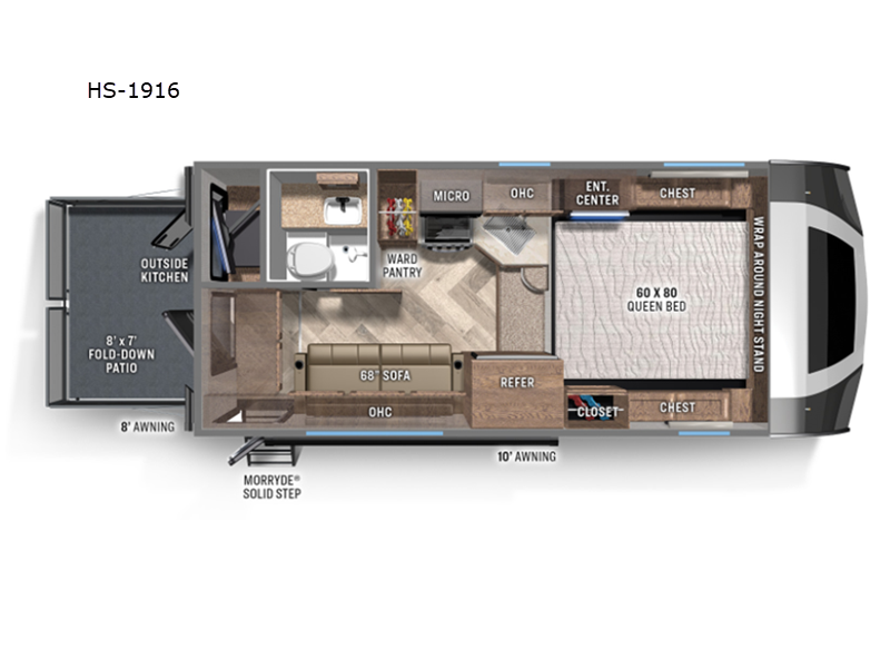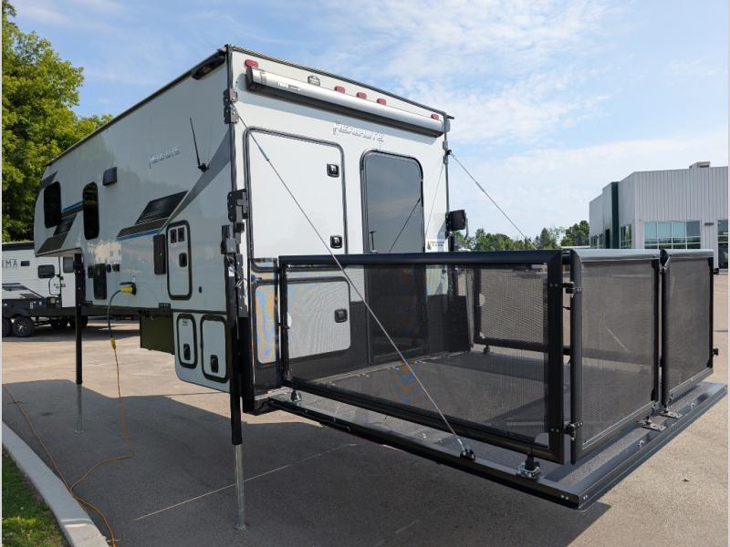 This hard side max truck camper is packed to the max with at-home features, so come take a look! Once you arrive at the campground or the river, set up the rear fold-down patio and enjoy the outside kitchen with a refrigerator. Inside, you'll find a cooktop and a microwave oven, plus a 6 cu. ft. two-way refrigerator for milk and eggs. You may want to visit on the 68" sofa, clean up in the wet bath, or take a rest on the front queen bed that includes a wrap-around nightstand. There is even a TV within the entertainment center to keep you busy on those rainy days!