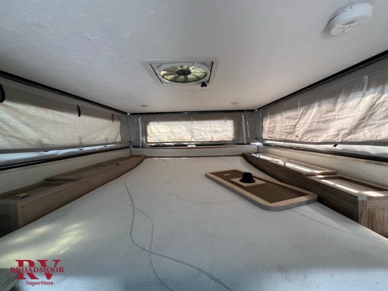 You're going to love camping in this truck camper for three! Once you arrive at the campground, use the electric roof lift with a remote for easy set up, then head inside to make lunch on the two burner cooktop. You can enjoy your meals at the dinette, and the ingredients can go back in the pantry and three-way refrigerator when it's time to clean up. There is a comfortable queen bed up front with foot lockers for your belongings, plus the private toilet on board will be super convenient for nighttime restroom breaks!