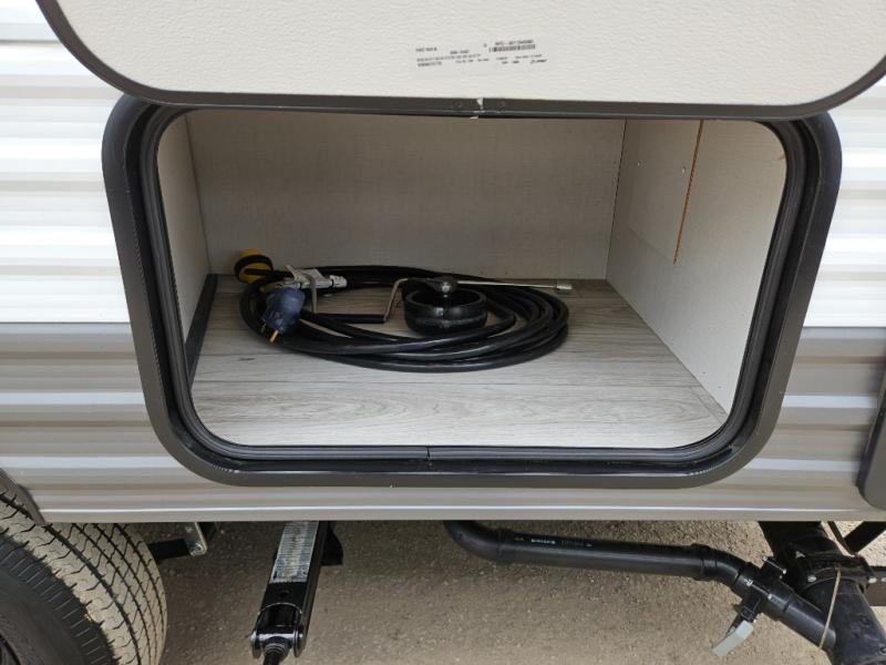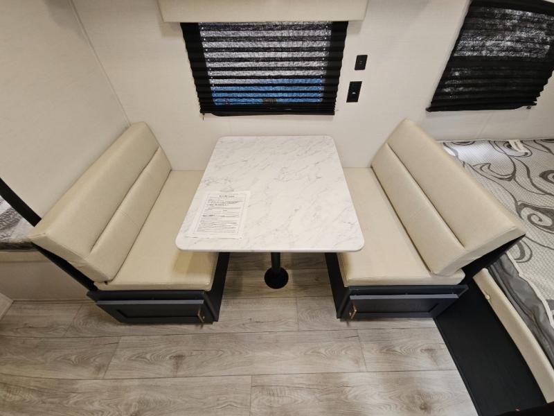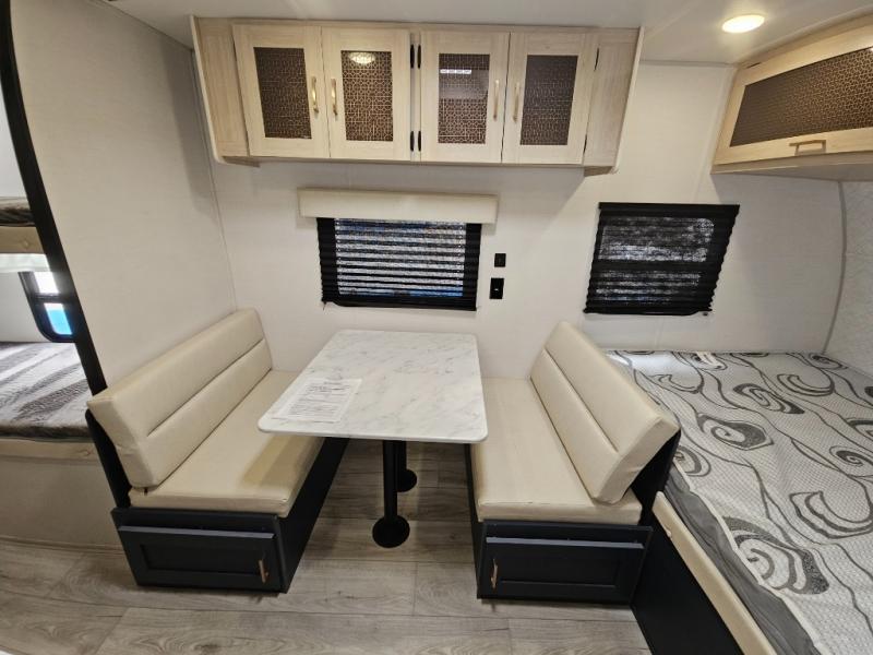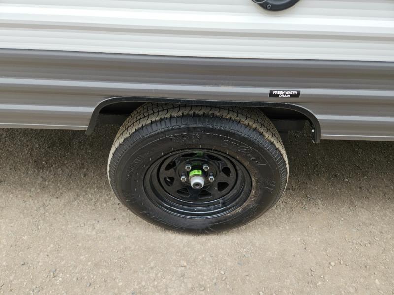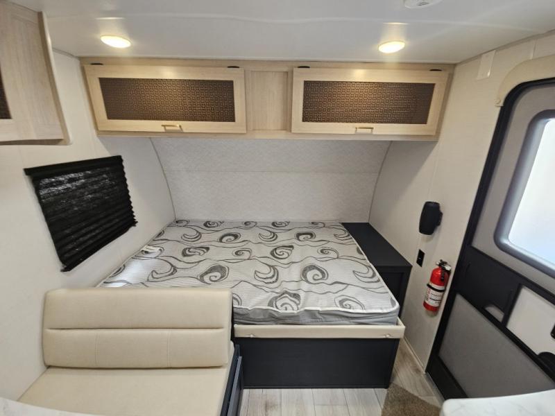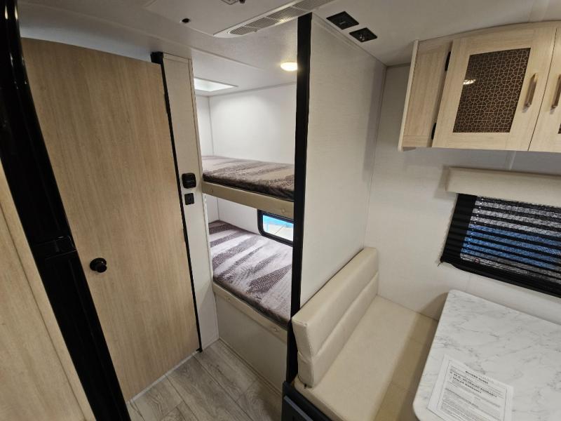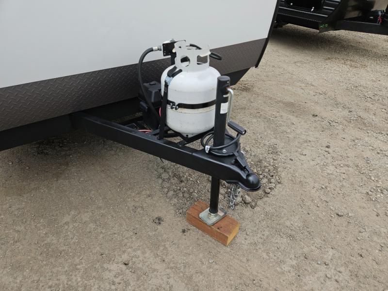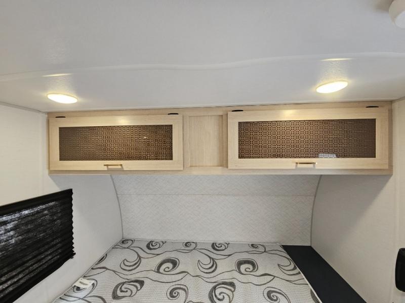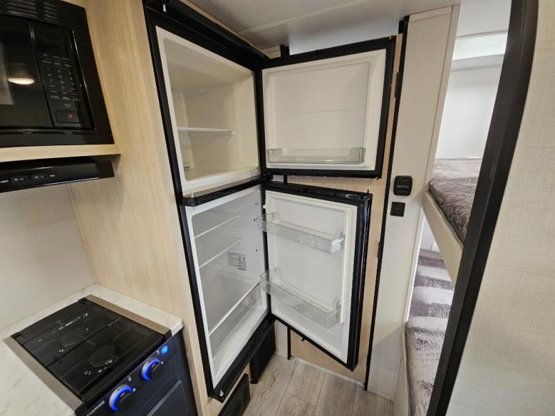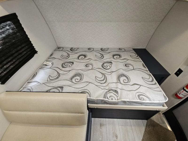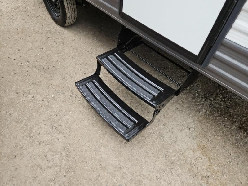 Compact and loaded with comfort and convenience for you to enjoy each and every camping trip! Because this trailer is easily towed by a minivan or SUV, you'll be ready in no time without having to purchase an extra vehicle to tow it. After a day of hiking, the kids will love sleeping on the bunk beds, and you can sleep on the front bed. Enjoy the LED-lit power awning as you make s'mores around the campfire or turn on the LED-lit outdoor speakers to have a dance party with friends and family. With enough storage for your valuables and board games, this trailer makes camping easy!