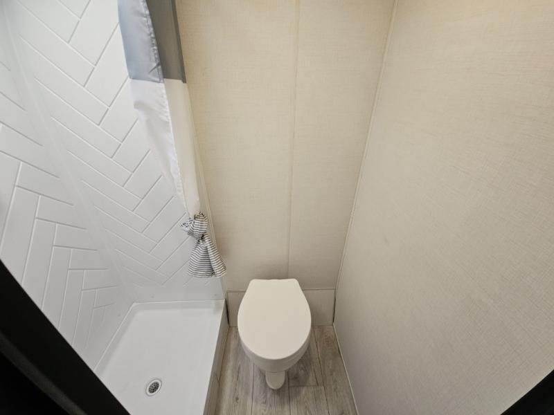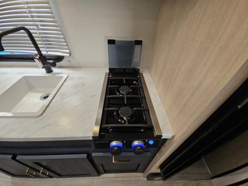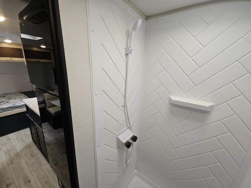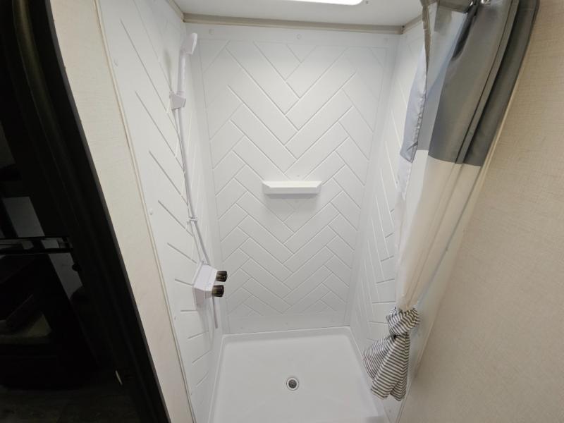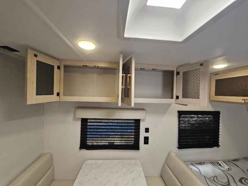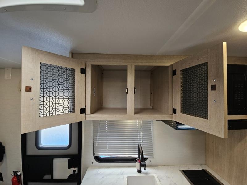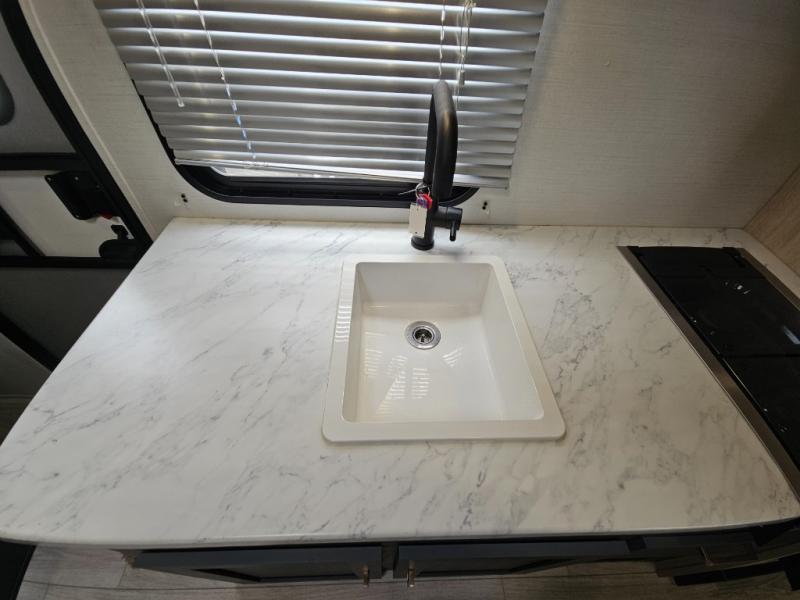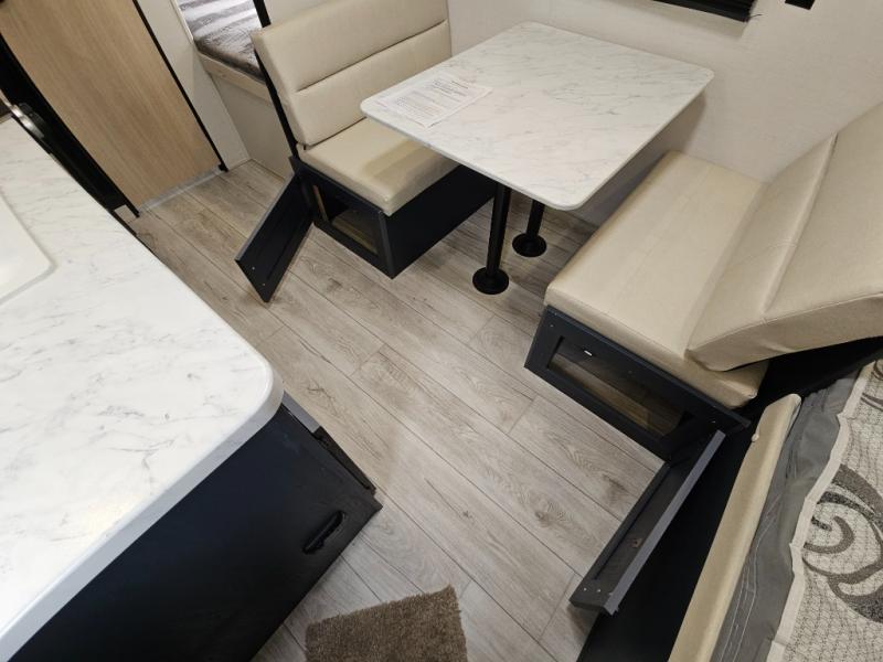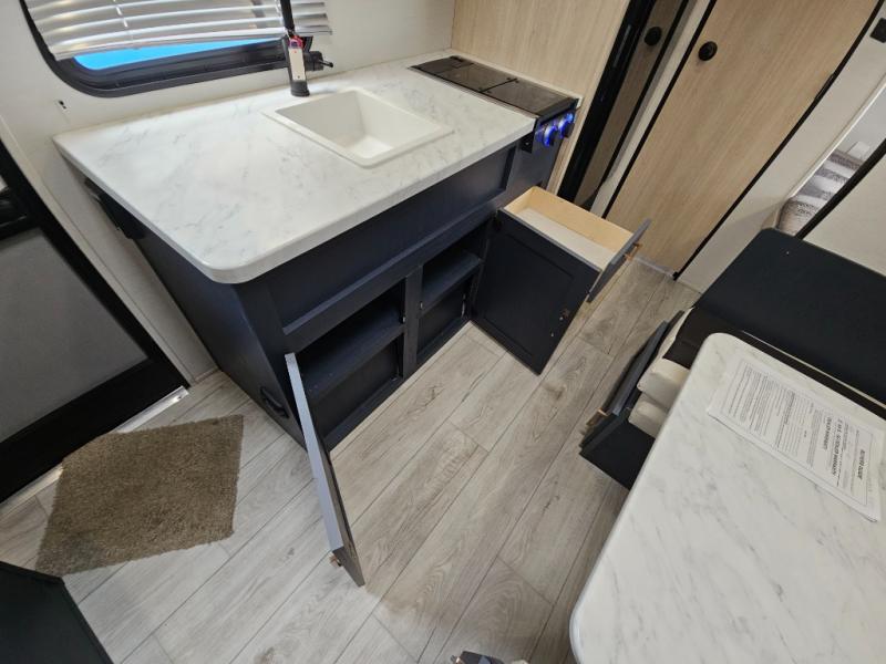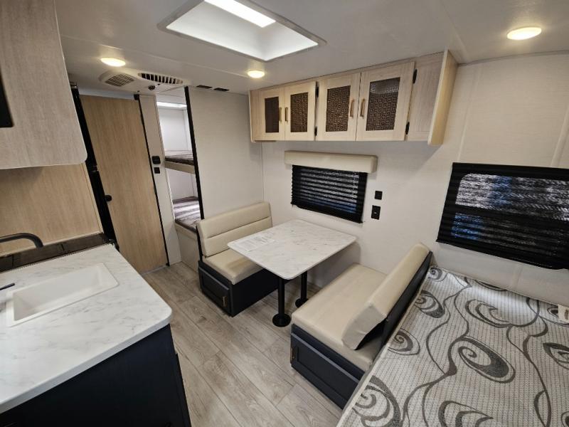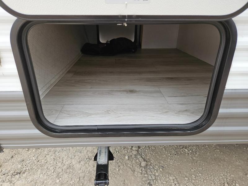 Compact and loaded with comfort and convenience for you to enjoy each and every camping trip! Because this trailer is easily towed by a minivan or SUV, you'll be ready in no time without having to purchase an extra vehicle to tow it. After a day of hiking, the kids will love sleeping on the bunk beds, and you can sleep on the front bed. Enjoy the LED-lit power awning as you make s'mores around the campfire or turn on the LED-lit outdoor speakers to have a dance party with friends and family. With enough storage for your valuables and board games, this trailer makes camping easy!