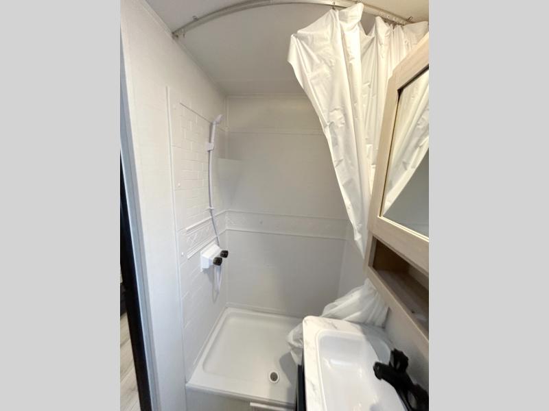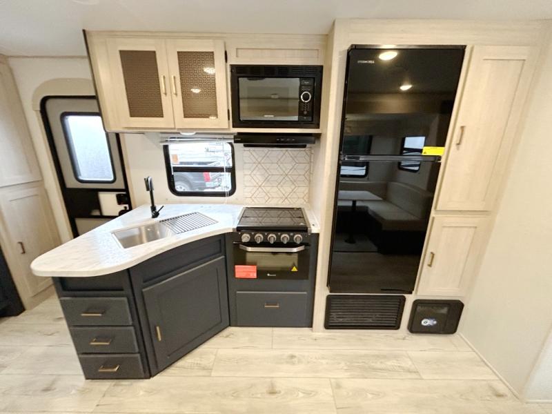 With any Avenger travel trailer by Prime Time, the exterior includes an aerodynamic smooth front metal, a diamond plate front rock guard for protection on the road, and four stabilizer jacks to keep your unit secure. There is a fully walkable roof plus an enclosed and heated underbelly that will help extend your camping season. The interior offers a 15,000 BTU air conditioner for the perfect climate inside, in-floor ducted heat, a systems monitor panel, and a Winegard 360+ antenna with Wi-Fi prep that will give you the option to stay connected as you camp. Each model also includes seamless Carefree Congoleum flooring, kitchen backsplash, shower pans in all models, and pleated nightshades throughout to name a few interior comforts!