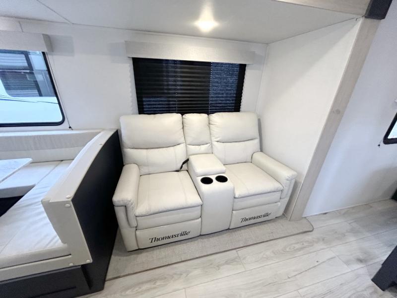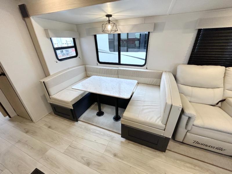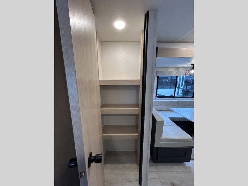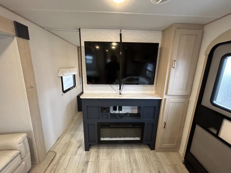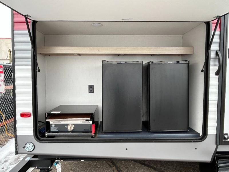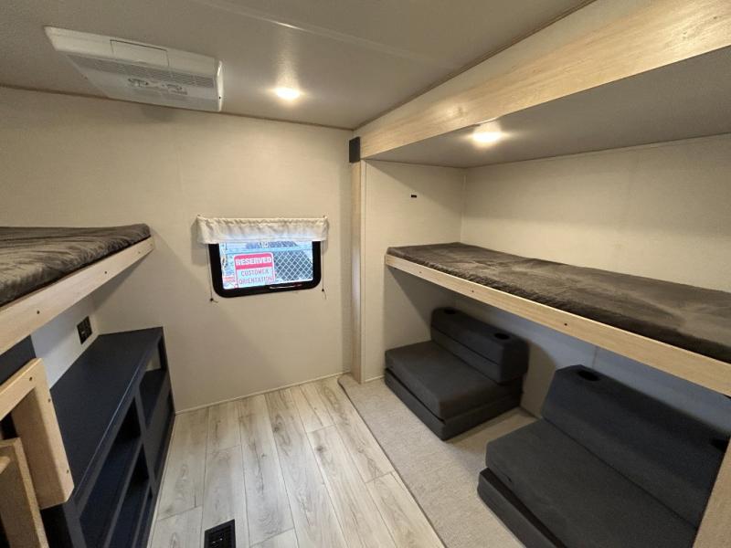 You probably love this trailer because of the rear bunkhouse that offers privacy, a slide up flip-up bunk above a sofa, and another bunk on the other side plus a rear window. The large slide in the main living area not only holds the U-shaped dinette and theater, but it also adds more floor space to this area so that you can live freely. When you're working in the kitchen, you'll appreciate the two pantries, and one of those is even a walk-in pantry. You'll find it easy to access the outdoor kitchen because of the two entry doors, and with one of those doors leading directly into the full bathroom, you won't have to search far while you're playing outside.
