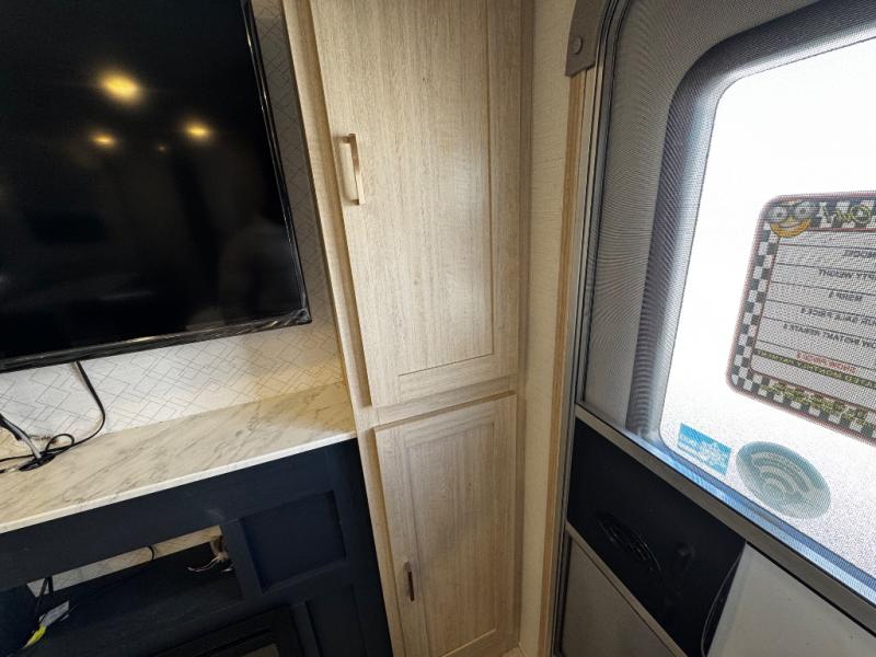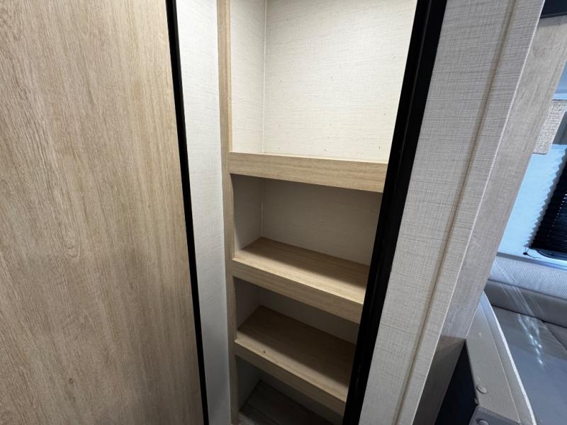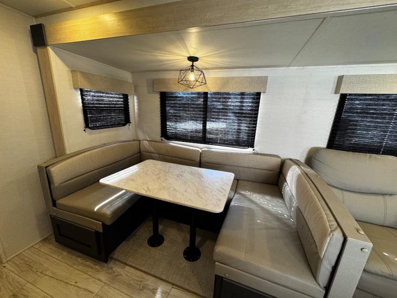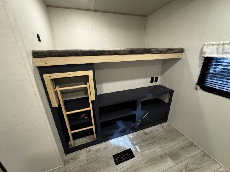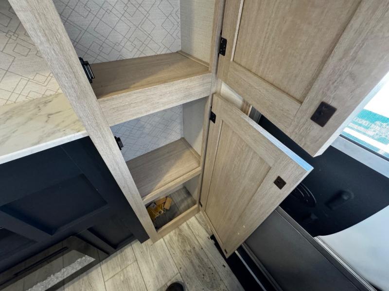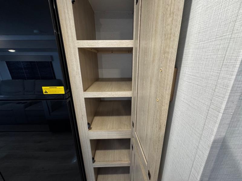You probably love this trailer because of the rear bunkhouse that offers privacy, a slide up flip-up bunk above a sofa, and another bunk on the other side plus a rear window. The large slide in the main living area not only holds the U-shaped dinette and theater, but it also adds more floor space to this area so that you can live freely. When you're working in the kitchen, you'll appreciate the two pantries, and one of those is even a walk-in pantry. You'll find it easy to access the outdoor kitchen because of the two entry doors, and with one of those doors leading directly into the full bathroom, you won't have to search far while you're playing outside.