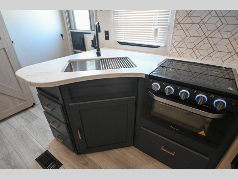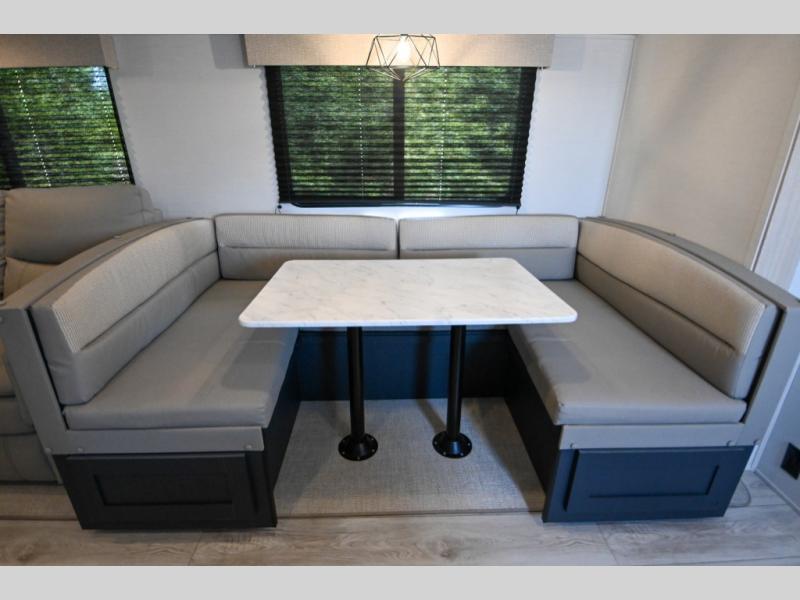 With any Avenger travel trailer by Prime Time, the exterior includes an aerodynamic smooth front metal, a diamond plate front rock guard for protection on the road, and four stabilizer jacks to keep your unit secure. There is a fully walkable roof plus an enclosed and heated underbelly that will help extend your camping season. The interior offers a 15,000 BTU air conditioner for the perfect climate inside, in-floor ducted heat, a systems monitor panel, and a Winegard 360+ antenna with Wi-Fi prep that will give you the option to stay connected as you camp. Each model also includes seamless Carefree Congoleum flooring, kitchen backsplash, shower pans in all models, and pleated nightshades throughout to name a few interior comforts!