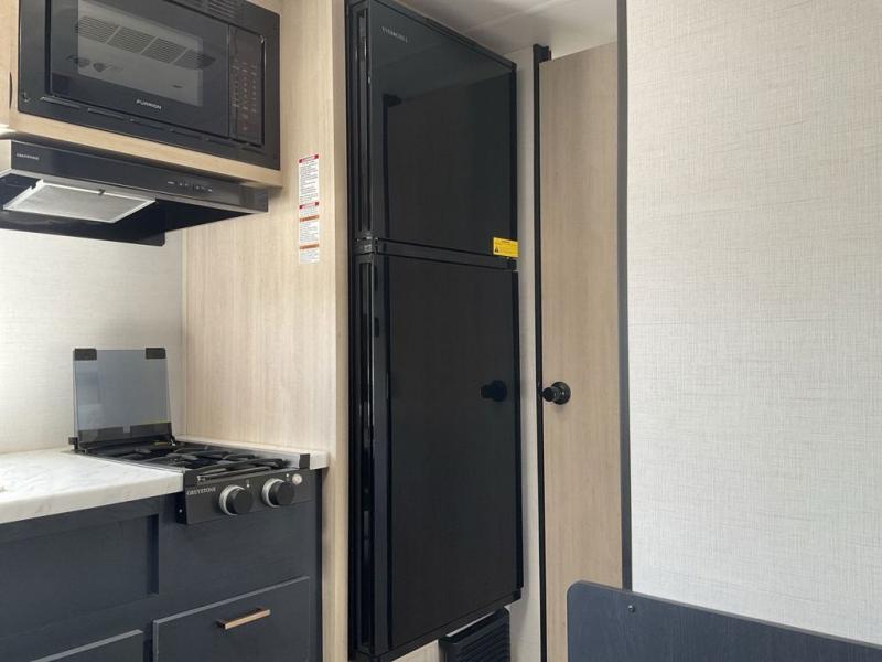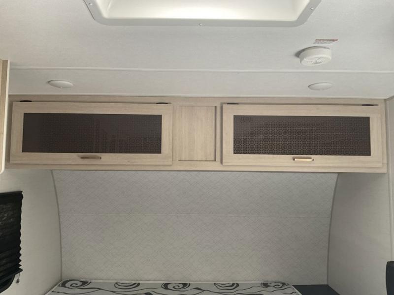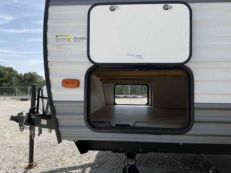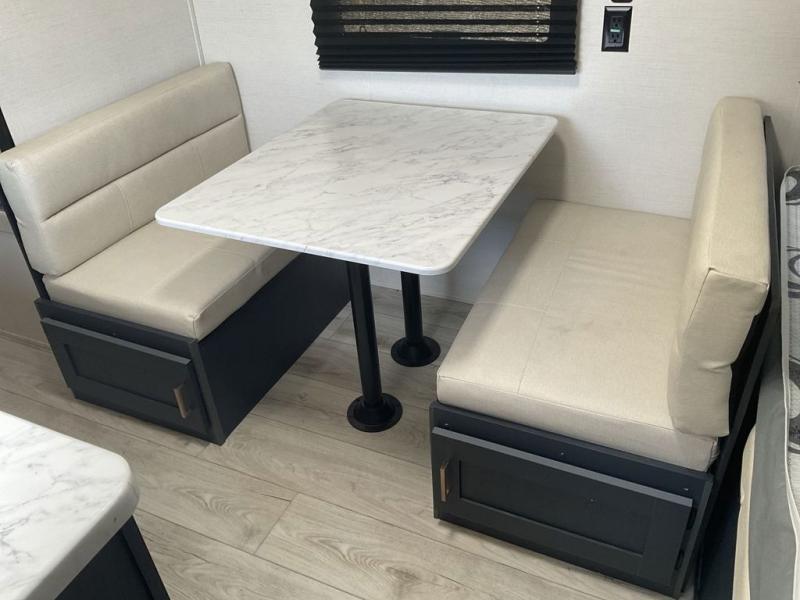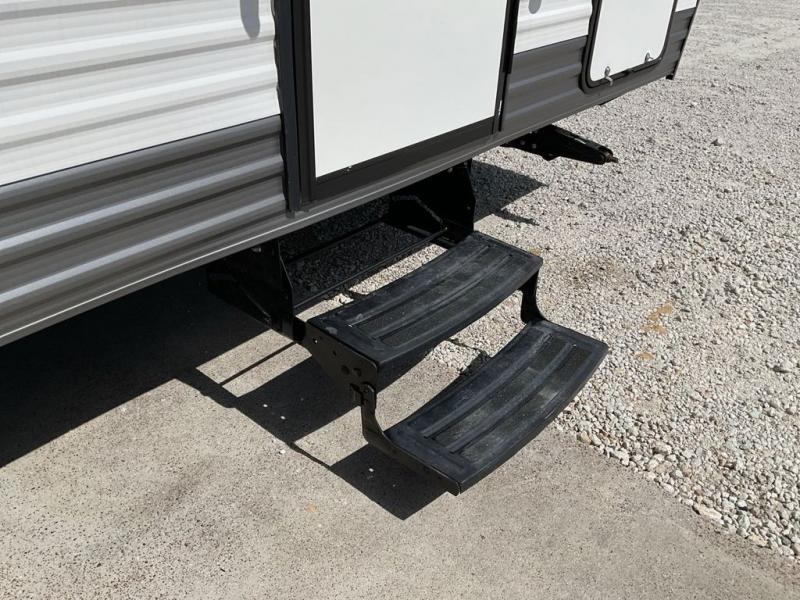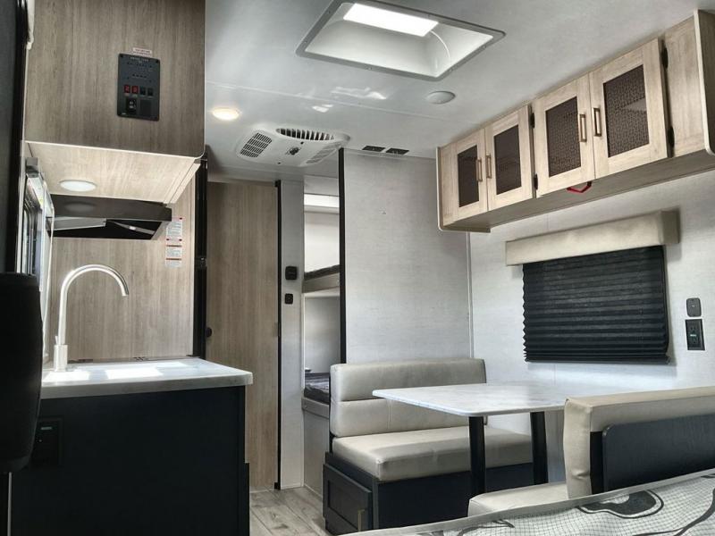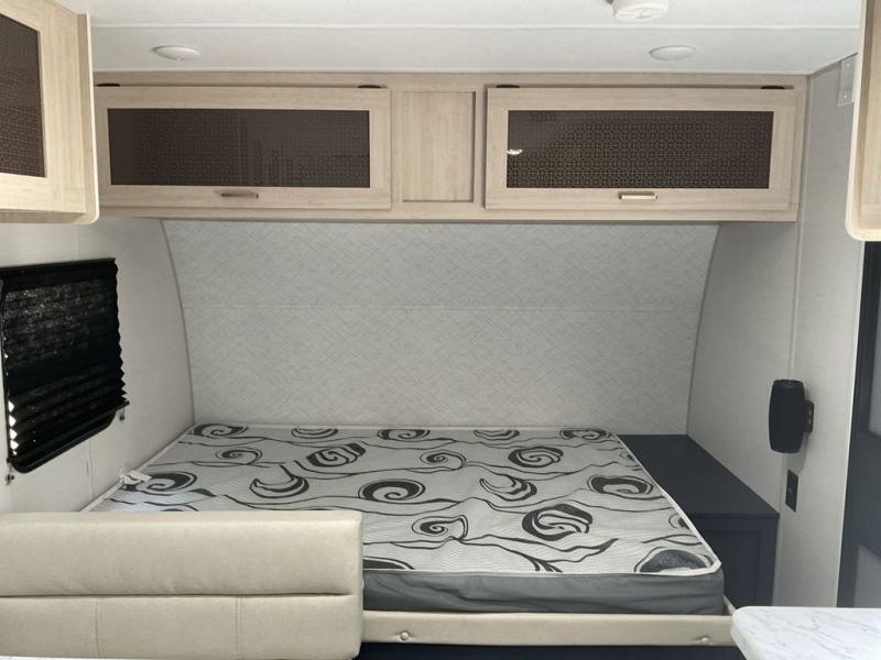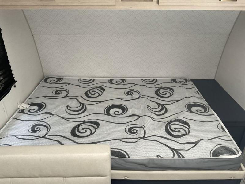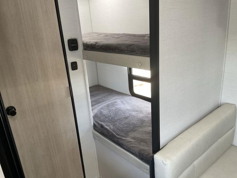 Compact and loaded with comfort and convenience for you to enjoy each and every camping trip! Because this trailer is easily towed by a minivan or SUV, you'll be ready in no time without having to purchase an extra vehicle to tow it. After a day of hiking, the kids will love sleeping on the bunk beds, and you can sleep on the front bed. Enjoy the LED-lit power awning as you make s'mores around the campfire or turn on the LED-lit outdoor speakers to have a dance party with friends and family. With enough storage for your valuables and board games, this trailer makes camping easy!