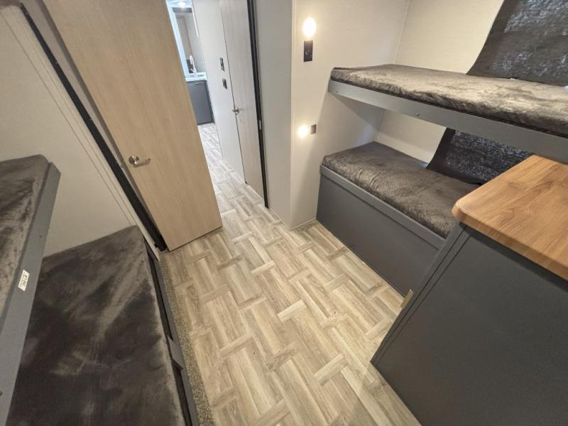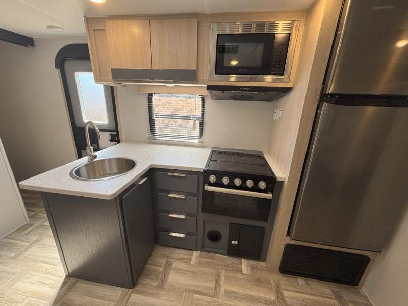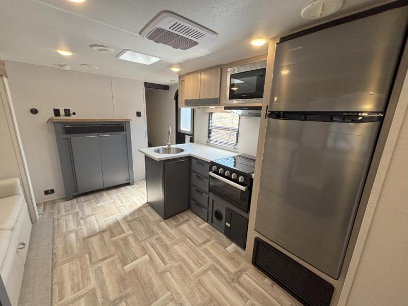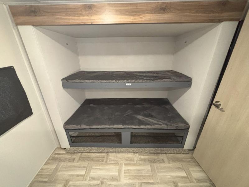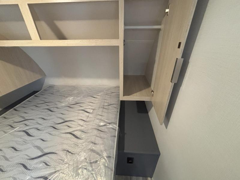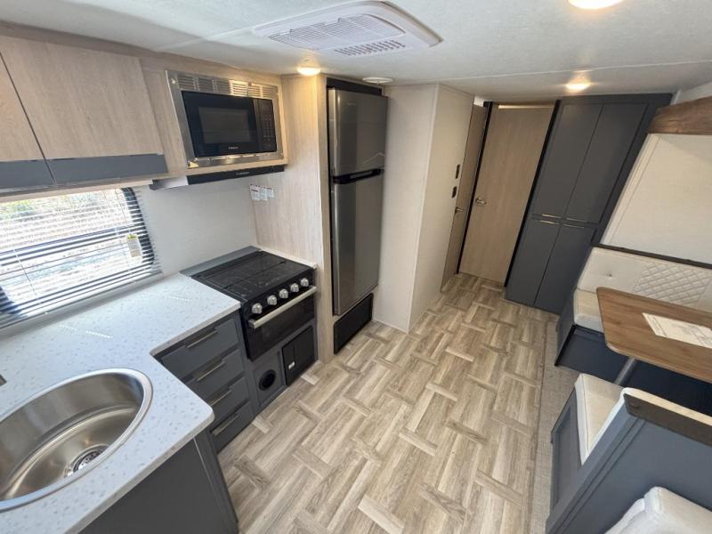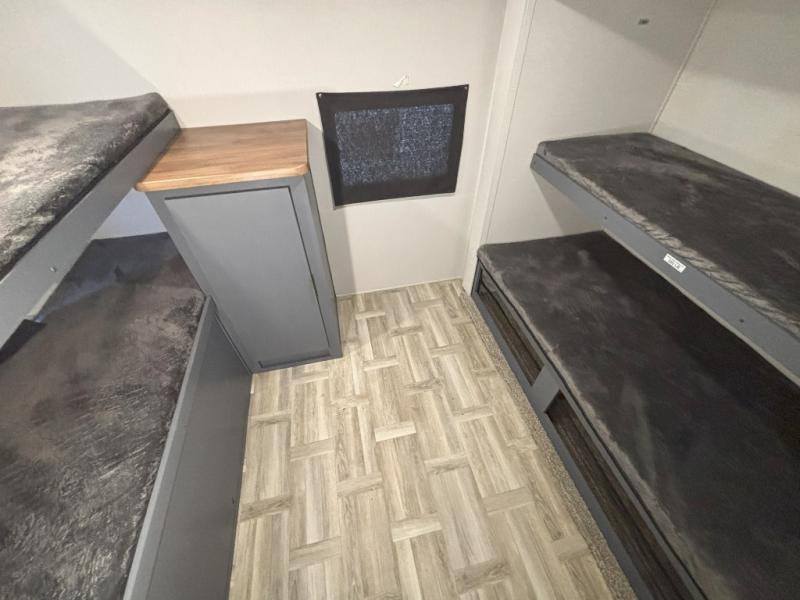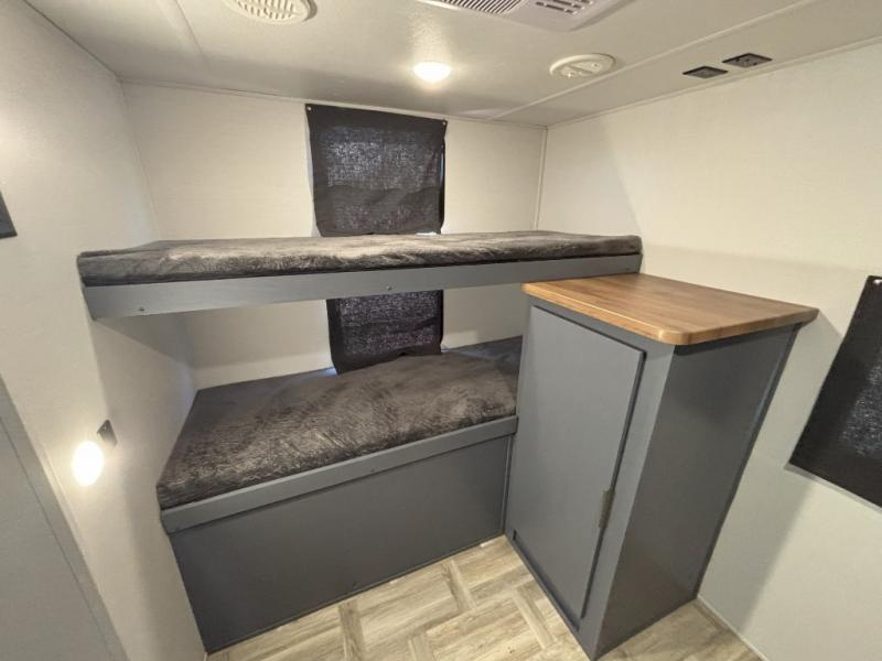 If more interior space and a larger sleeping capacity is what you're looking for, your search is over! The rear bunkhouse includes slide out bunk beds across from a second set of bunks plus a closet to keep this space organized. You will have the queen bed all to yourselves in the front bedroom, and there are even two wardrobes and an overhead cabinet for books. The combined living area and kitchen is made open thanks to the large slide out. Here, you'll find a sofa and booth dinette plus an entertainment center with TV prep if you want the option for movie nights. The chef of your group will love the full kitchen, complete with a microwave oven, 2 in 1 gas oven and range, and a large 2-door 12V refrigerator to keep your perishables fresh. Head outdoors after dinner to enjoy the 19' power awning with LED lights, and you can keep yard games in the exterior storage!