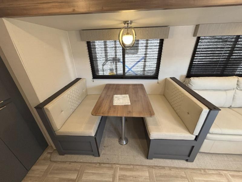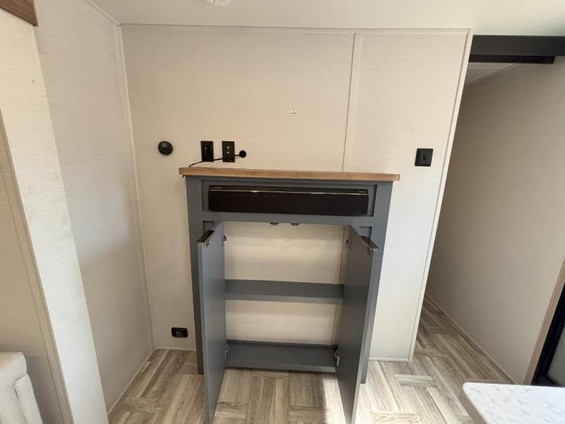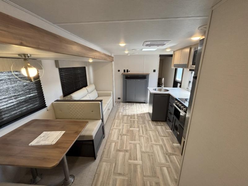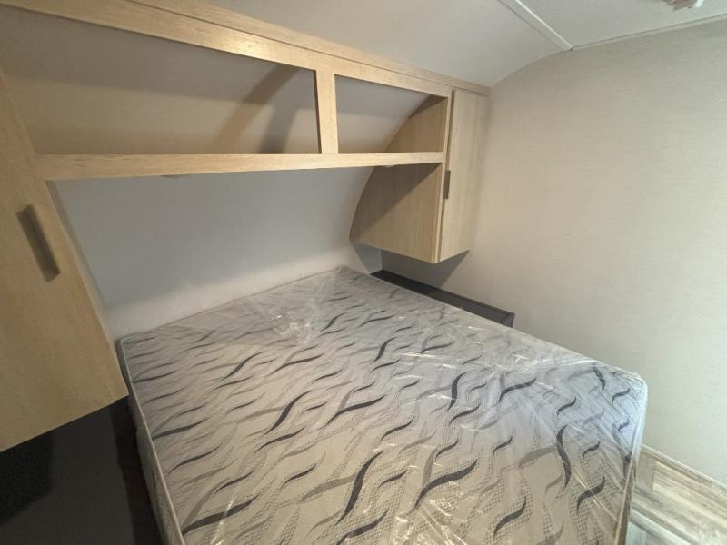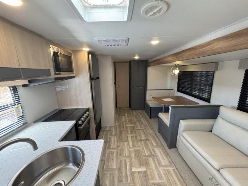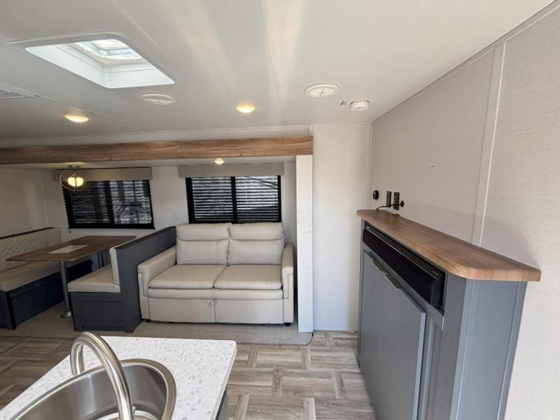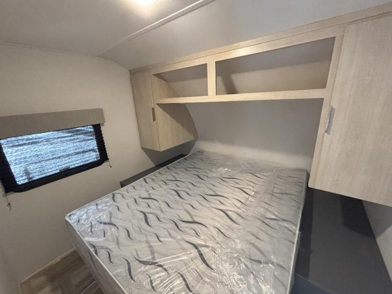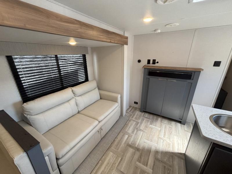 If more interior space and a larger sleeping capacity is what you're looking for, your search is over! The rear bunkhouse includes slide out bunk beds across from a second set of bunks plus a closet to keep this space organized. You will have the queen bed all to yourselves in the front bedroom, and there are even two wardrobes and an overhead cabinet for books. The combined living area and kitchen is made open thanks to the large slide out. Here, you'll find a sofa and booth dinette plus an entertainment center with TV prep if you want the option for movie nights. The chef of your group will love the full kitchen, complete with a microwave oven, 2 in 1 gas oven and range, and a large 2-door 12V refrigerator to keep your perishables fresh. Head outdoors after dinner to enjoy the 19' power awning with LED lights, and you can keep yard games in the exterior storage!